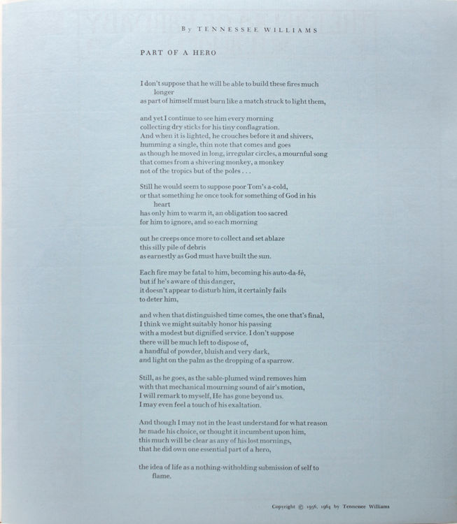 OCLC also cites a broadside printing of the single poem 'The Ballad of Barnaby' by W. H. Auden, with illustration by Edward Gorey, and making no mention of the Tennessee Williams poem 'Part of a Hero'-- only stating that the W. H. Auden poem was 'Issued for W. H. Auden's memorial service at the Cathedral Church of St. John the Divine, October 3, 1973' [cf. Gotham Book Mart. Edward Gorey booklist, spring/summer 1975, no. 184].