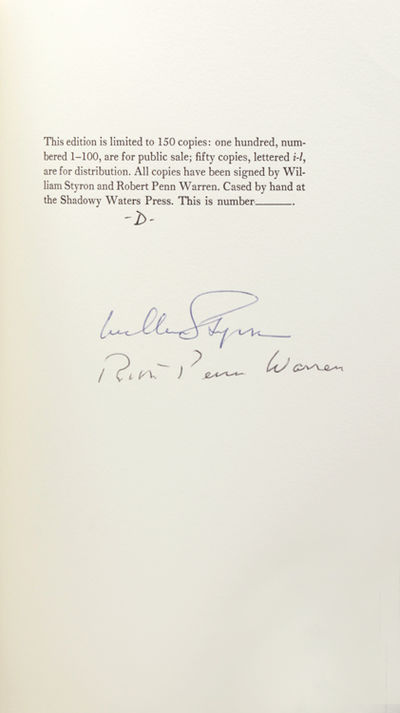 (North Carolina): Palaemon Press Limited, 1981. First edition thus, "New" edition (revised text, issued in 1981), signed by William Styron and Robert Penn Warren; limited to 26 lettered copies, signed by William Styron and Robert Penn Warren [colophon page states that there were 150 copies, 100 numbered (from 1 to 100) and 50 lettered (from i-l); this is one of 26 copies (lettered from A-Z)]. [8], [i]pp. A fine copy. First edition thus, "New" edition (revised text, issued in 1981), signed by William Styron and Robert Penn Warren; limited to 26 lettered copies, signed by William Styron and Robert Penn Warren [colophon page states that there were 150 copies, 100 numbered (from 1 to 100) and 50 lettered (from i-l); this is one of 26 copies (lettered from A-Z)]. [8], [i]pp. OCLC lists two holdings of this 1981 edition signed by both Robert Penn Warren and William Styron [Toronto and Cambridge University].