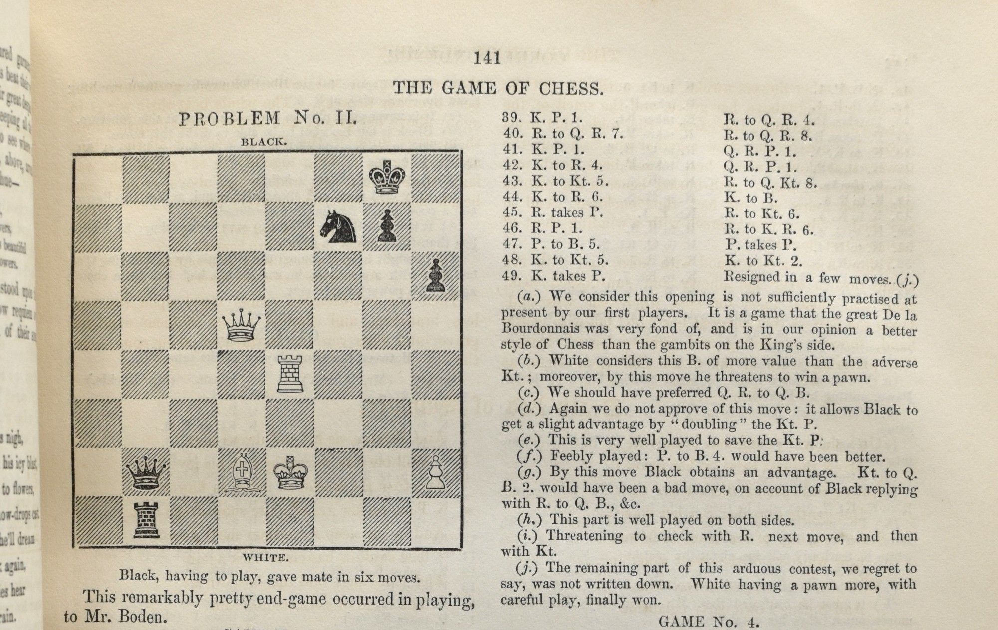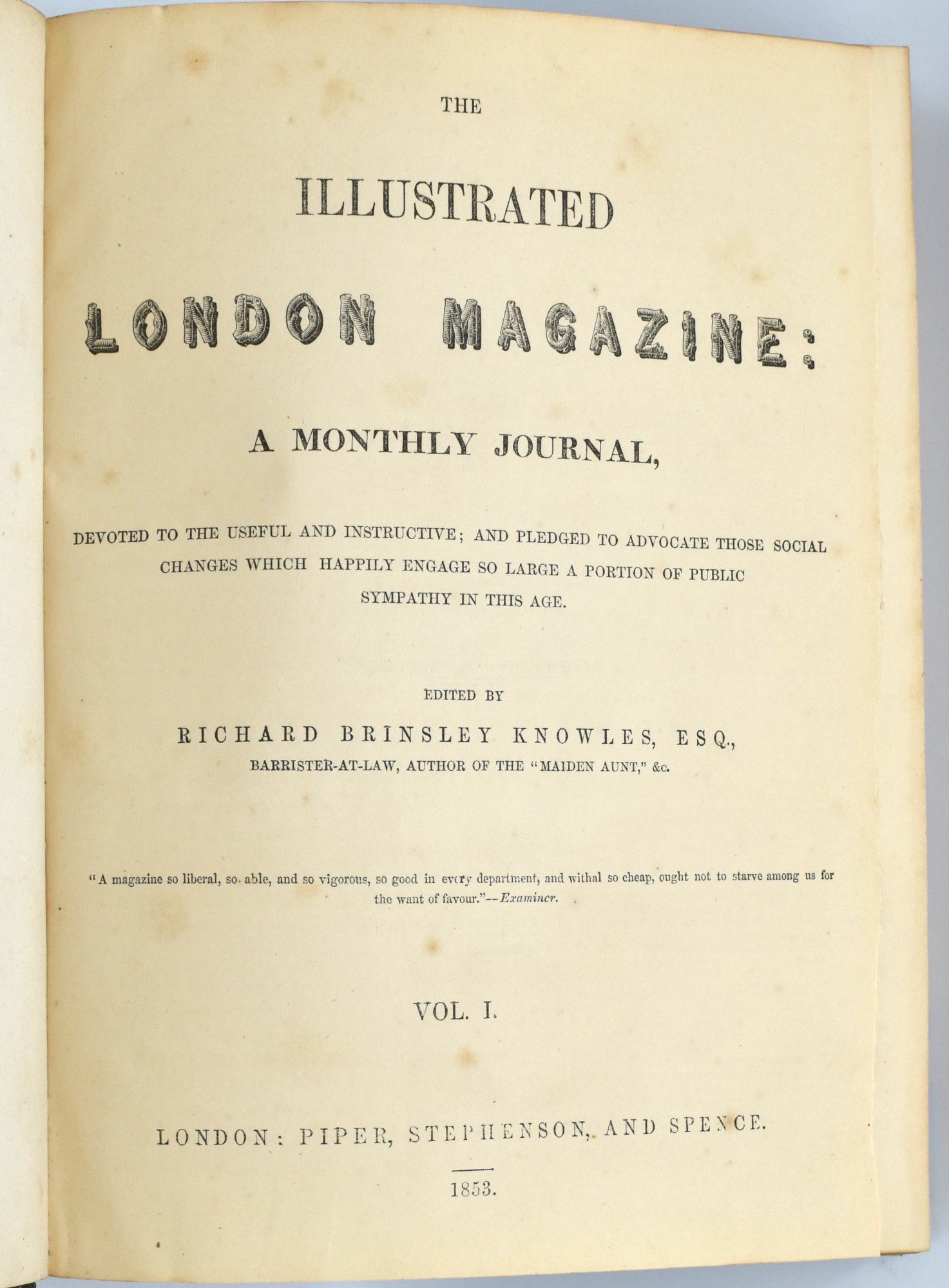 London: Piper, Stephenson, and Spence, 1856. Half Leather. Very Good binding. Two small quarto volumes (10” x 7 1/2”), in black half calf over marbled board; raised bands with decorations and titling in gilt; the first four volumes of The Illustrated London Magazine, each volume consisting of 6 issues, for one half a year--July 1853-December 1853 (282 pages); January 1854-June 1854 (264 pages); July 1854-December 1854 (260 pages); Janaury 1855-June 1855 9272 pages).~~The first 24 issues of the relatively short-lived Illustrated London Magazine. “Illustrated” is certainly the case, as in-text steel engravings are numerous. The articles range from seances to hunting to travel to a visit to Newgate Prison. Of particular interest are the chess columns and diagrams: “”For the sake of those readers who are chess players we have engaged for the present and subsequent numbers of the Illustrated London Magazine, the valuable services of Mr. Williams, the celebrated chess player. In each month he will supply the latest games of any interest, played by the best players.”. Very Good binding.
