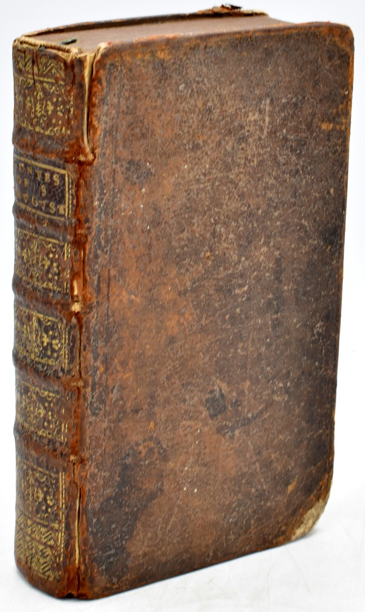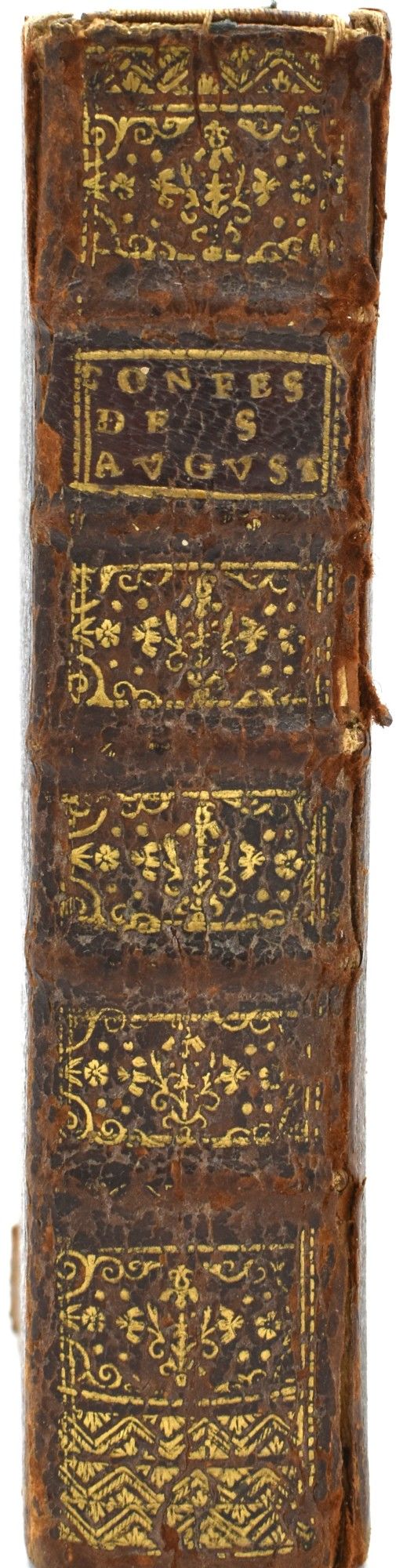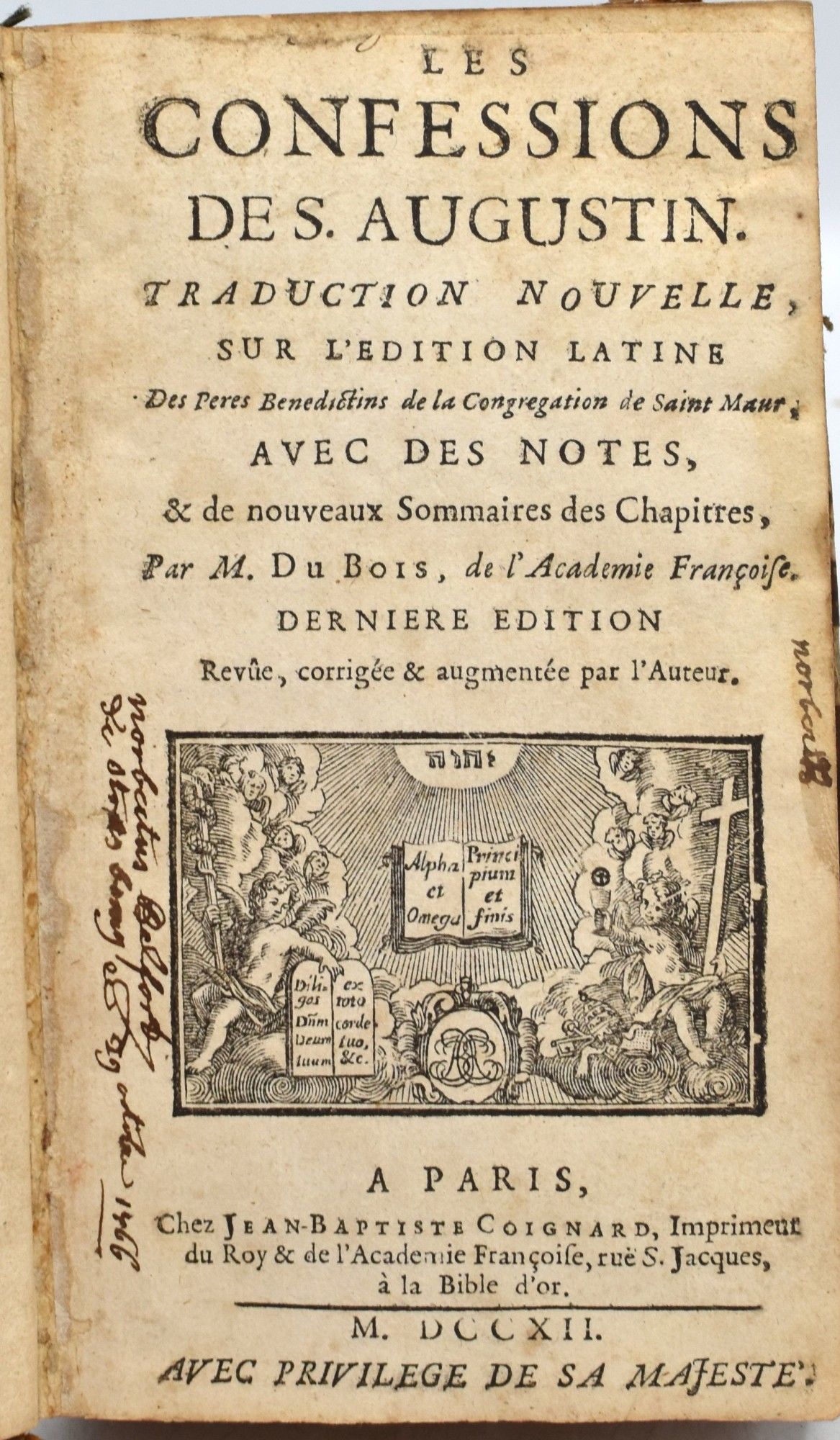 Paris: Jean-Bapstiste Coignard, 1712. Dernier Edition. Full Leather. Good binding. 12mo. (6 3/8" x 3 3/4") .contemporary worn calf binding with corners down to the boards; with raised bands, decorations in gild, and a morocco title label; marbled endpapers; lacking the last leaf of the "Autre Privilege du Roy".~~An early French edition of The Confessions of St. Augustine. Good binding.