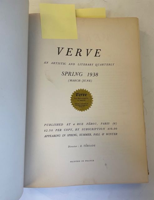 Paris, 1937. First American Edition. Hardcover. Folio, [2[, 112, [16], [2], 128, [2], 132, [2], 140 pages; VG-; bound in floral designed cloth, fading, rubbing, and fraying to cloth, more severe along hinges and fore edges; small stain to fore edge of text block; American Edition, bound by the Bookshop Bindery in Chicago and sold by Esquire-Coronet, Inc., with each individual issue printed in France. With gold star stickers to the title pages of 1 and 2, with Esquire-Coronet, Inc's info.; With original front wraps bound in, featuring cover art by Matisse, Georges Braque, Pierre Bonard, and Georges Rouault; With all lithographs by Kandinsky, Masson, Chagall, Miró, Rattner, Klee, Matisse and Derain and numerous reproductions; text primarily in English; closed tear on page 23; shelved above Vikings. 1354516. Shelved Dupont Bookstore.
