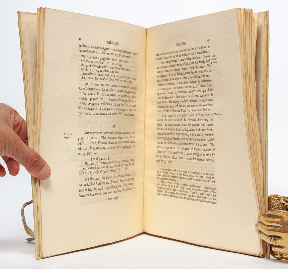 Originally issued in a set of five volumes, reproducing the exceptional Malone Collection copies of Shakespeare's first editions. "The nautical tale of a wandering prince, Pericles is narrated by John Gower, a poet from the English past. Gower explains that Pericles, prince of Tyre, hopes to win the hand of a princess in Antioch. When Pericles learns that she and the king, her father, are lovers, he flees for his life" (Folger). Taking to the sea, Pericles undergoes a series of challenges, including love, loss, kidnapping, and a concluding reunion among Pericles, his love Thaisa, and their daughter Marina.