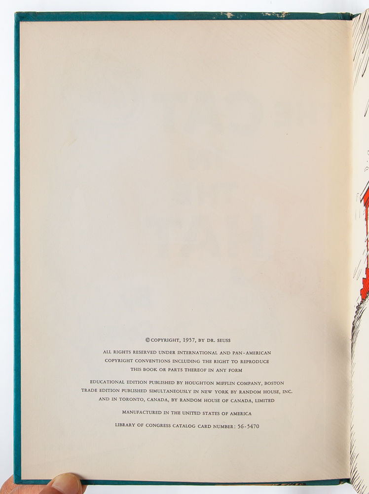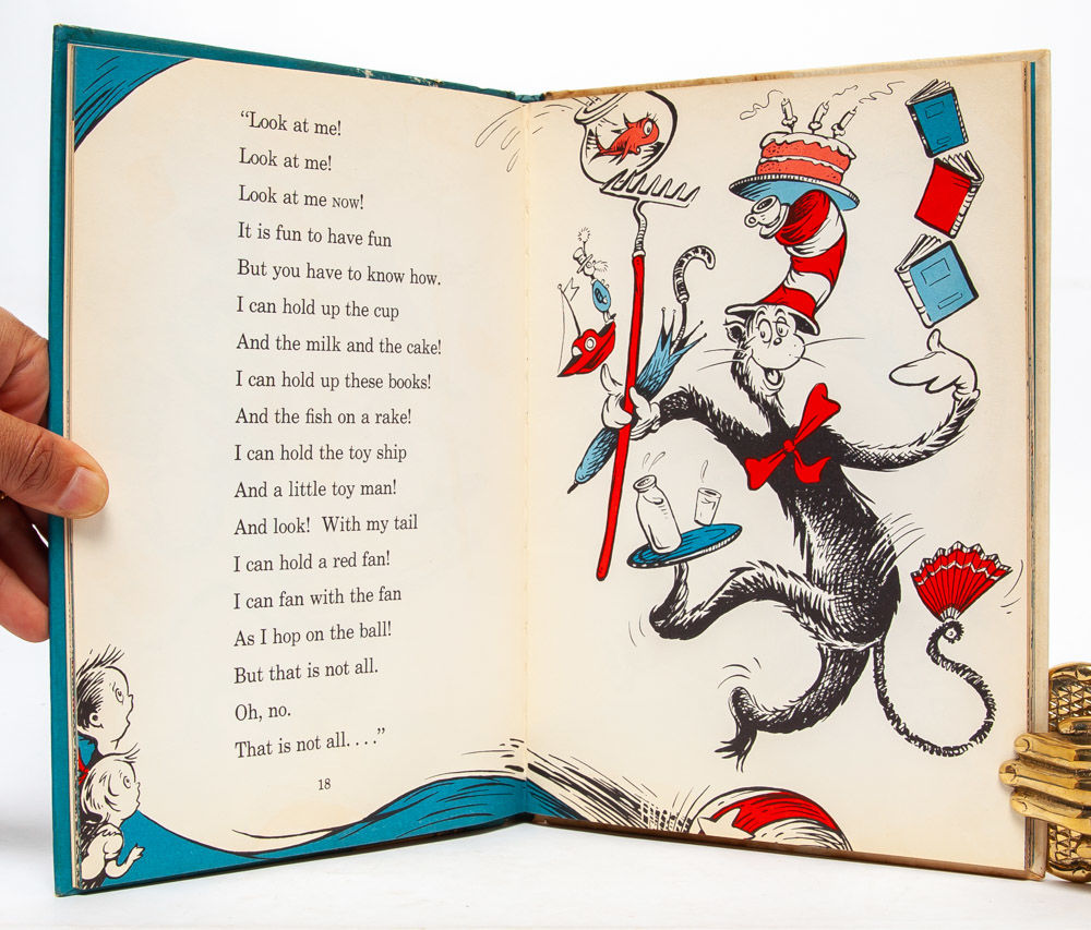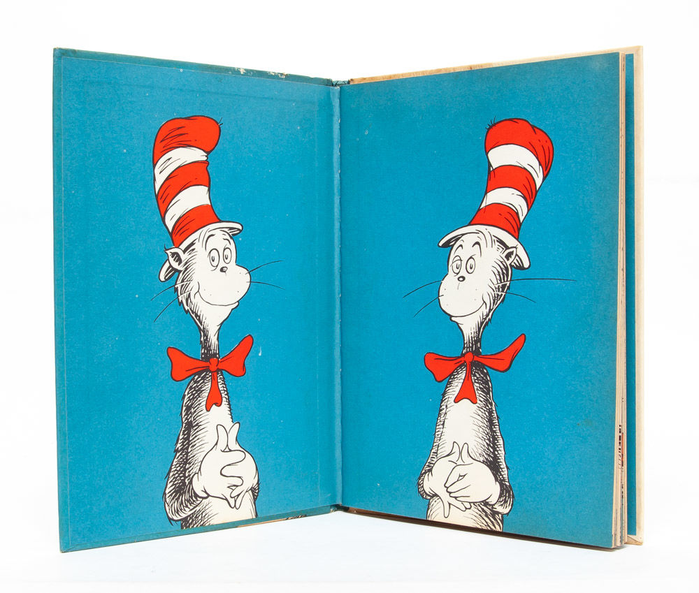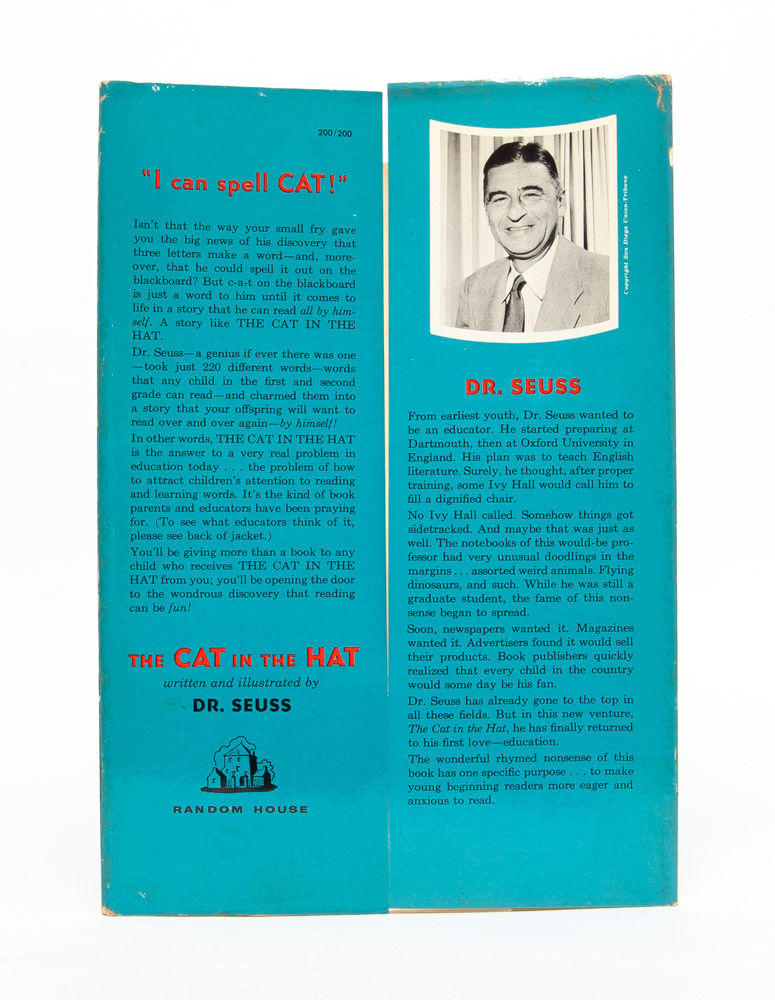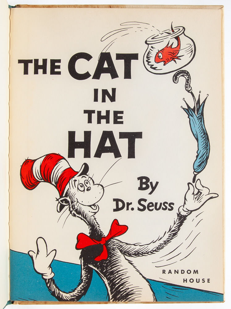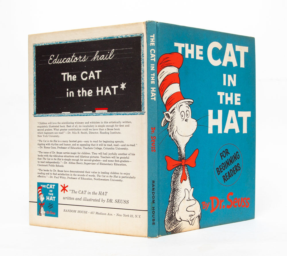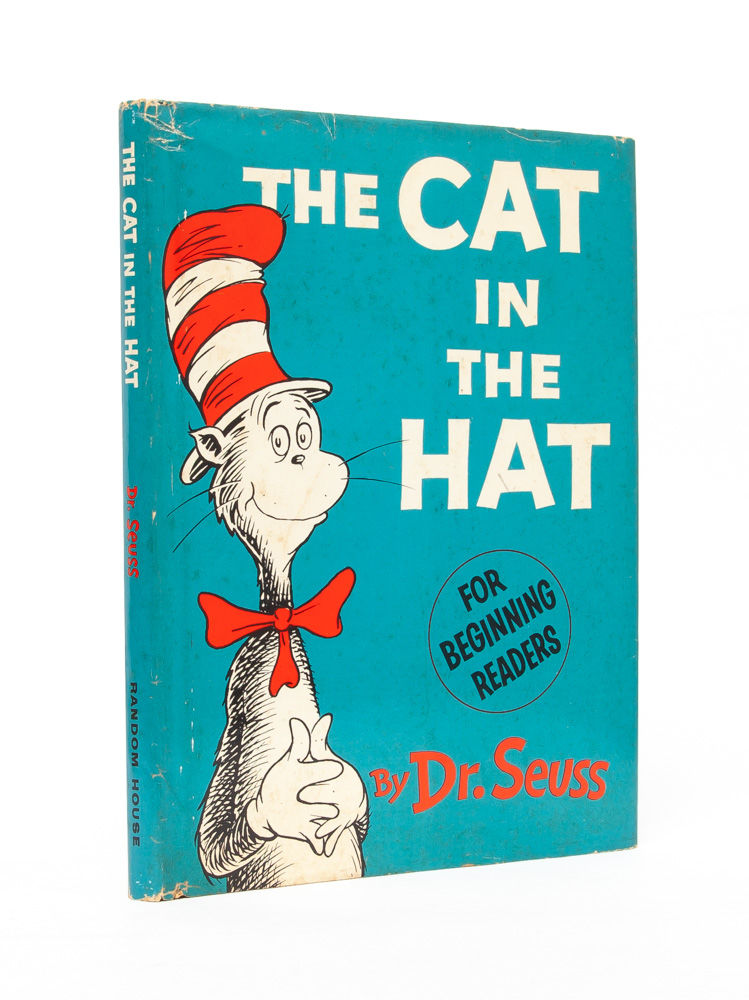 Dr. Seuss’ renowned children’s classic. The book, which follows the visit of a clever top hat ensconced cat to a suburban home, was written by Dr. Seuss in response to John Hersey's challenge that he come up with a more entertaining and engaging basic reader. The book sold over a million copies in its first three years in print and would make Dr. Seuss a household name. The Cat in the Hat appears on the School Library Journal’s list of the Top 100 Picture Books of all time in addition to the National Education Association’s list of Teachers’ Top 100 Books for Children. "Parents and teachers will bless Mr. Geisel for this amusing reader with its ridiculous and lively drawings, for their children are going to have the exciting experience of learning that they can read after all” (Contemporary Saturday Review). Near Fine in Very Good + dust jacket.