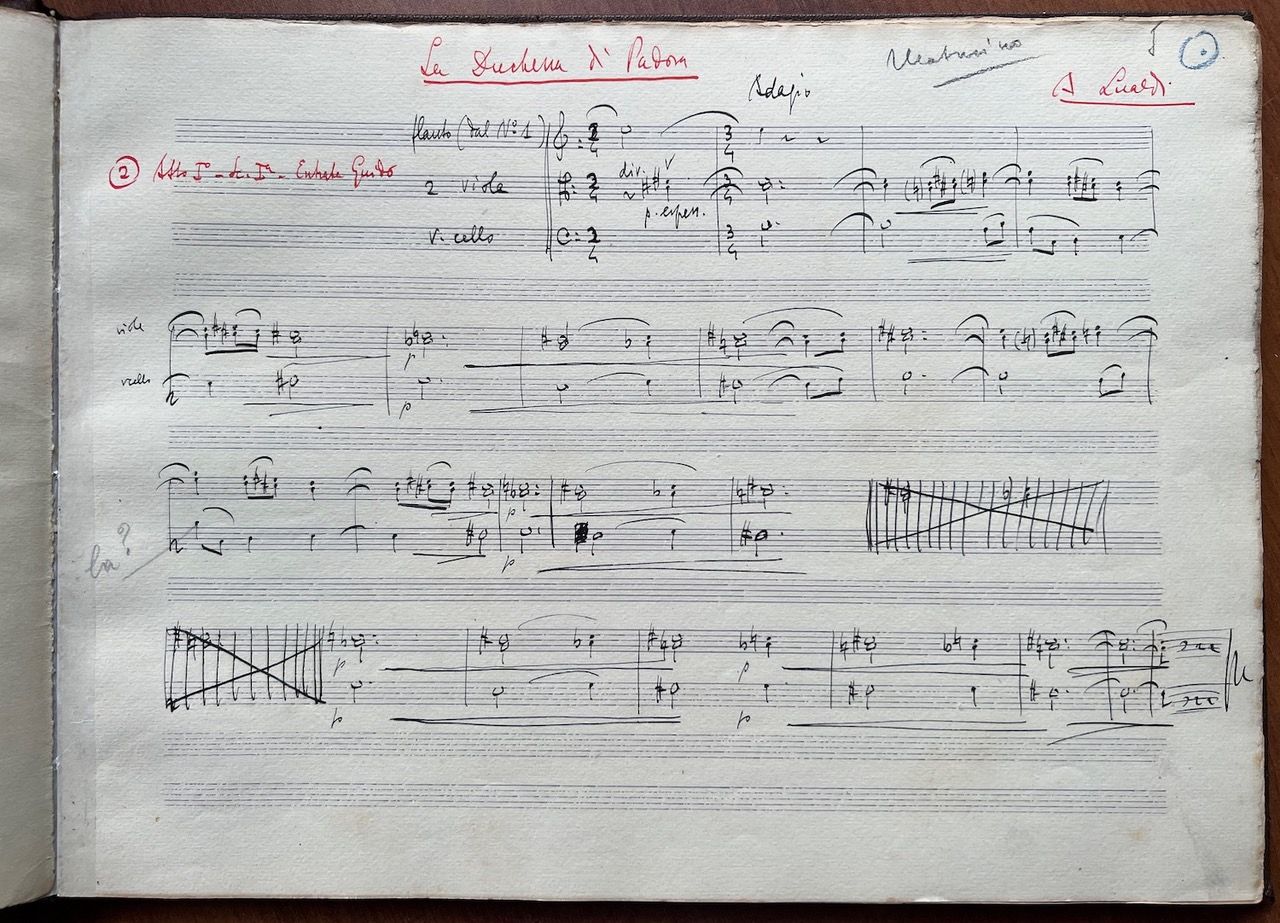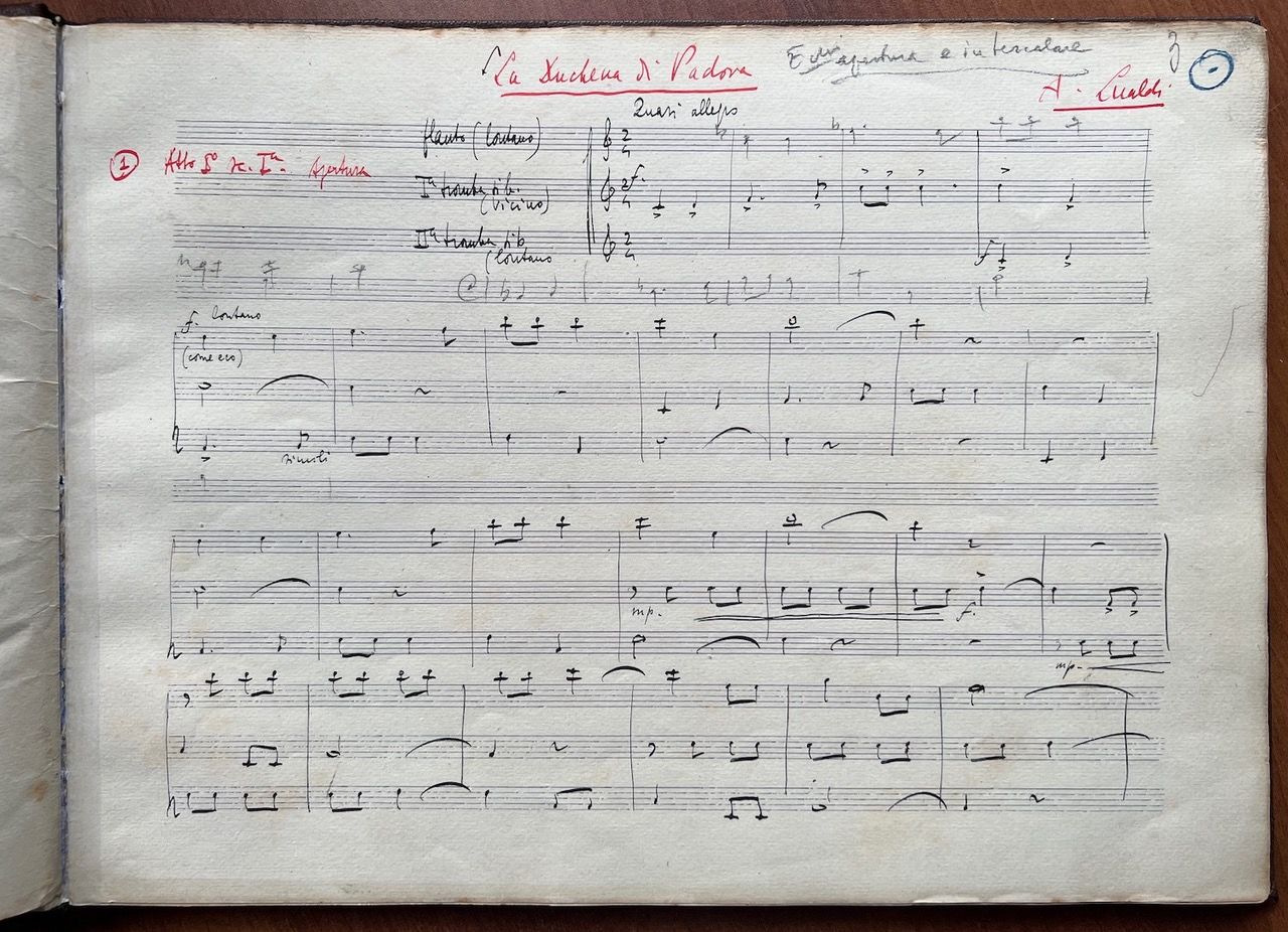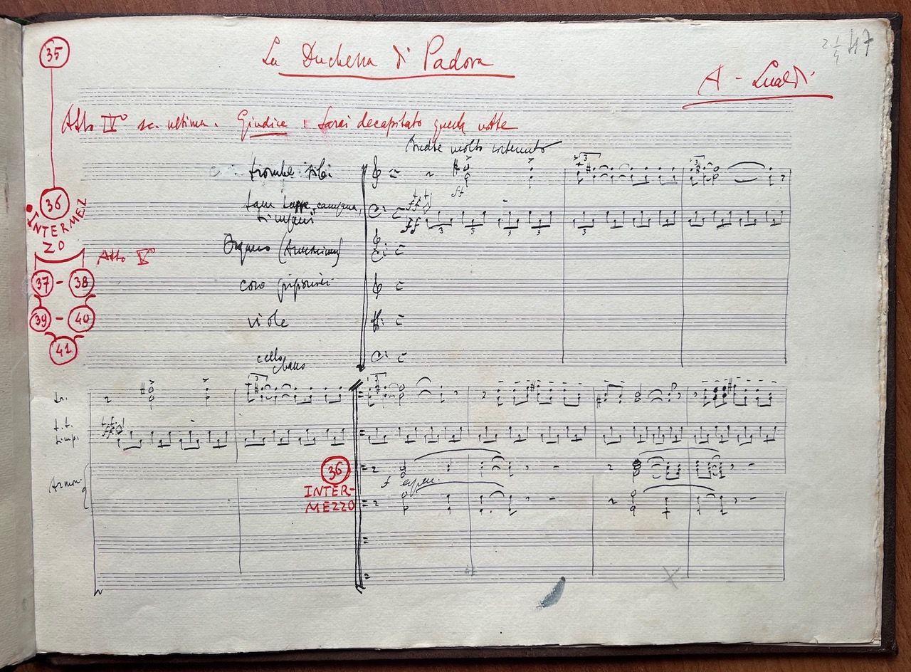 Music divided into fifty numbers. Title, "La Duchessa di Padova," and composer's name, "A. Lualdi," as caption title to each number. Music and part of literals in black ink; headings, scene numbers, rehearsal numbers, textual cues, more literals, and some notational corrections in red ink. Further additions in the composer's hand in pencil. Pagination in pencil to rectos including title and final blanks. Circled dot in blue pencil to upper right corners of most rectos. Signed and dated in black ink at conclusion: "Milano, 18 november 3 dicembre 1931 Adriano Lualdi."
