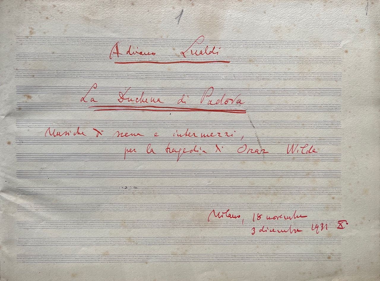 Title slightly foxed; occasional minor tears and creases. Productions of Oscar Wilde's play The Duchess of Padua (1883) are rare, and Lualdi's setting appears to be unknown; the present work is not included in any of the available lists of Lualdi's works and there is no evidence that it was ever performed. Not in Steiger or the Enciclopedia dello Spettacolo... Indice Repertorio.