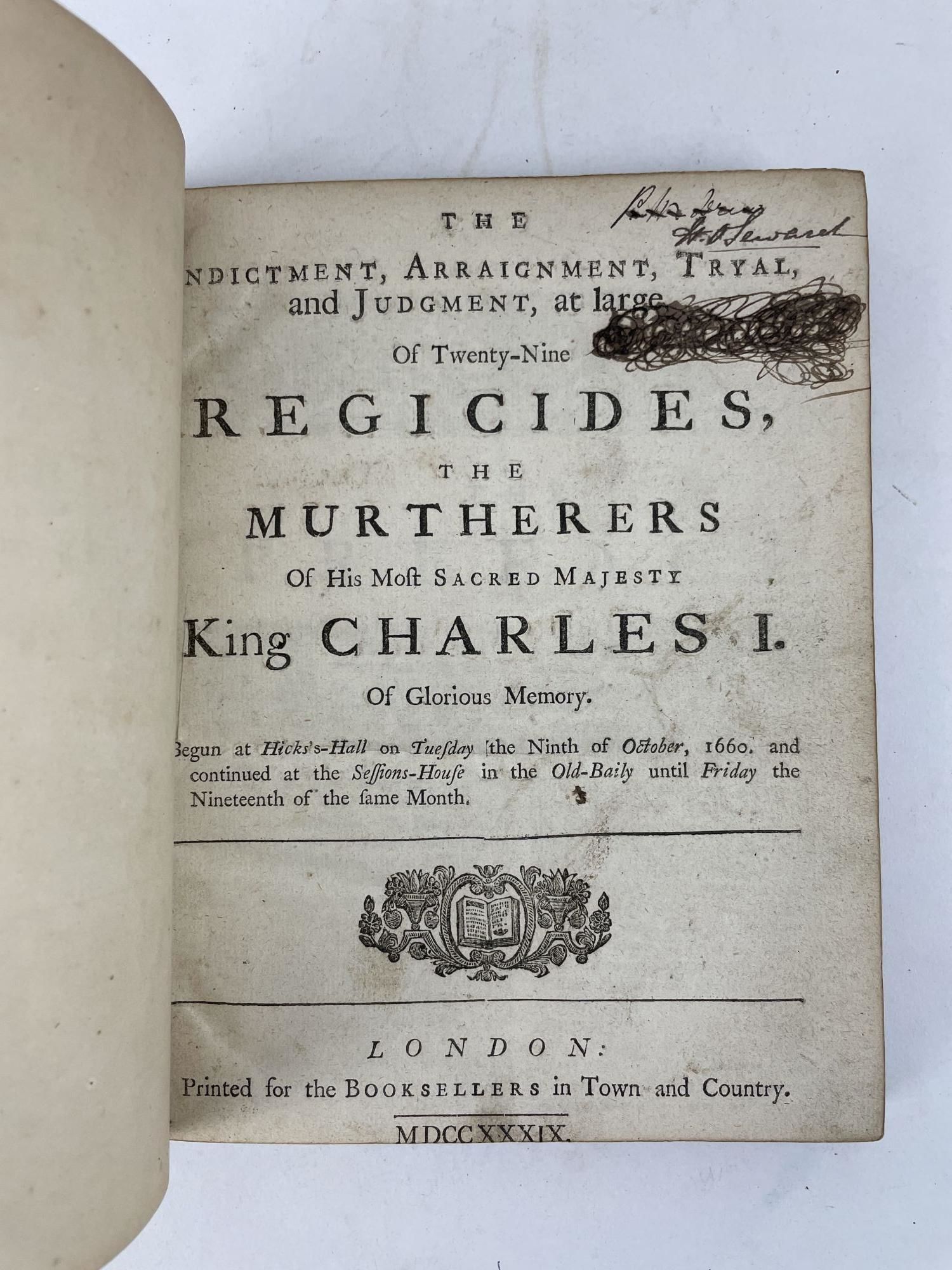 THE INDICTMENT, ARRAIGNMENT, TRYAL, AND JUDGMENT, AT LARGE, OF TWENTY-NINE REGICIDES, THE MURTHERERS OF HIS MOST SACRED MAJESTY KING CHARLES I. OF GLORIOUS MEMORY