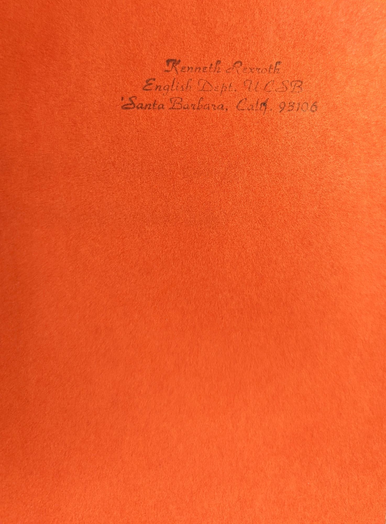 Formerly the copy of San Francisco Renaissance and Beat-adjacent poet Kenneth Rexroth, with his UC Santa Barbara English Department ownership stamp on front free endpaper.