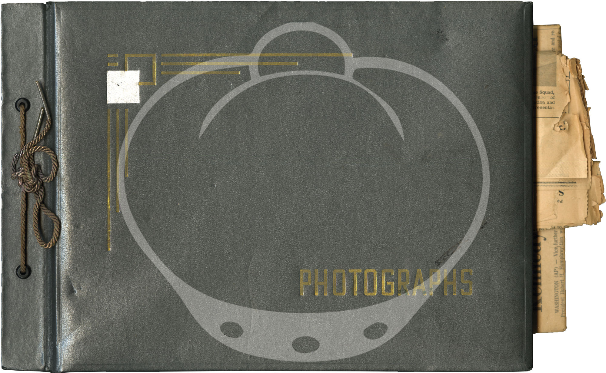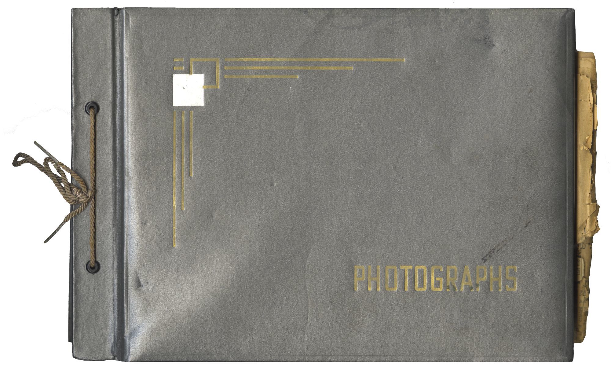 Photo album with string binding, 12.5 x 8.75 inches. Very Good plus. Photographs, Newspaper clippings, and ephemera Very Good overall, with a few clippings laid in, and ten of the photographs loose from the original tape mounting, many with faint soil, tape shadows, and light creasing.