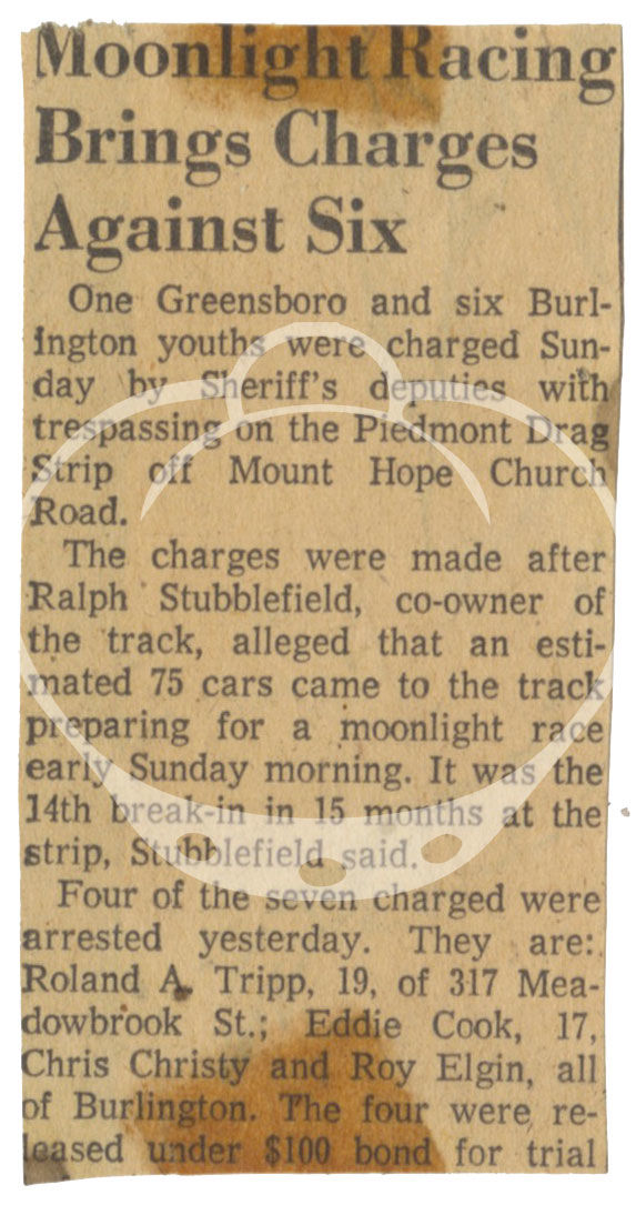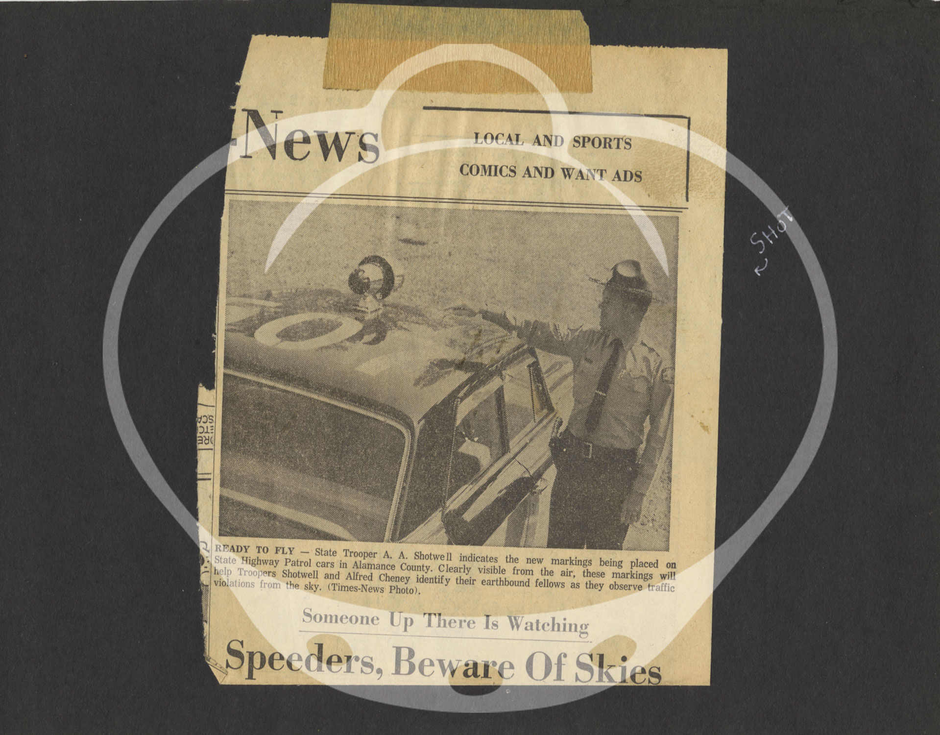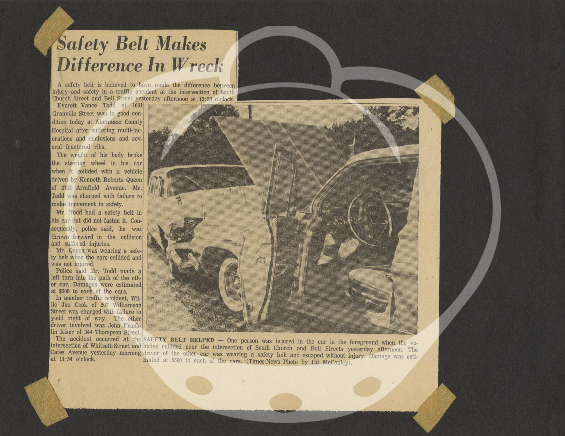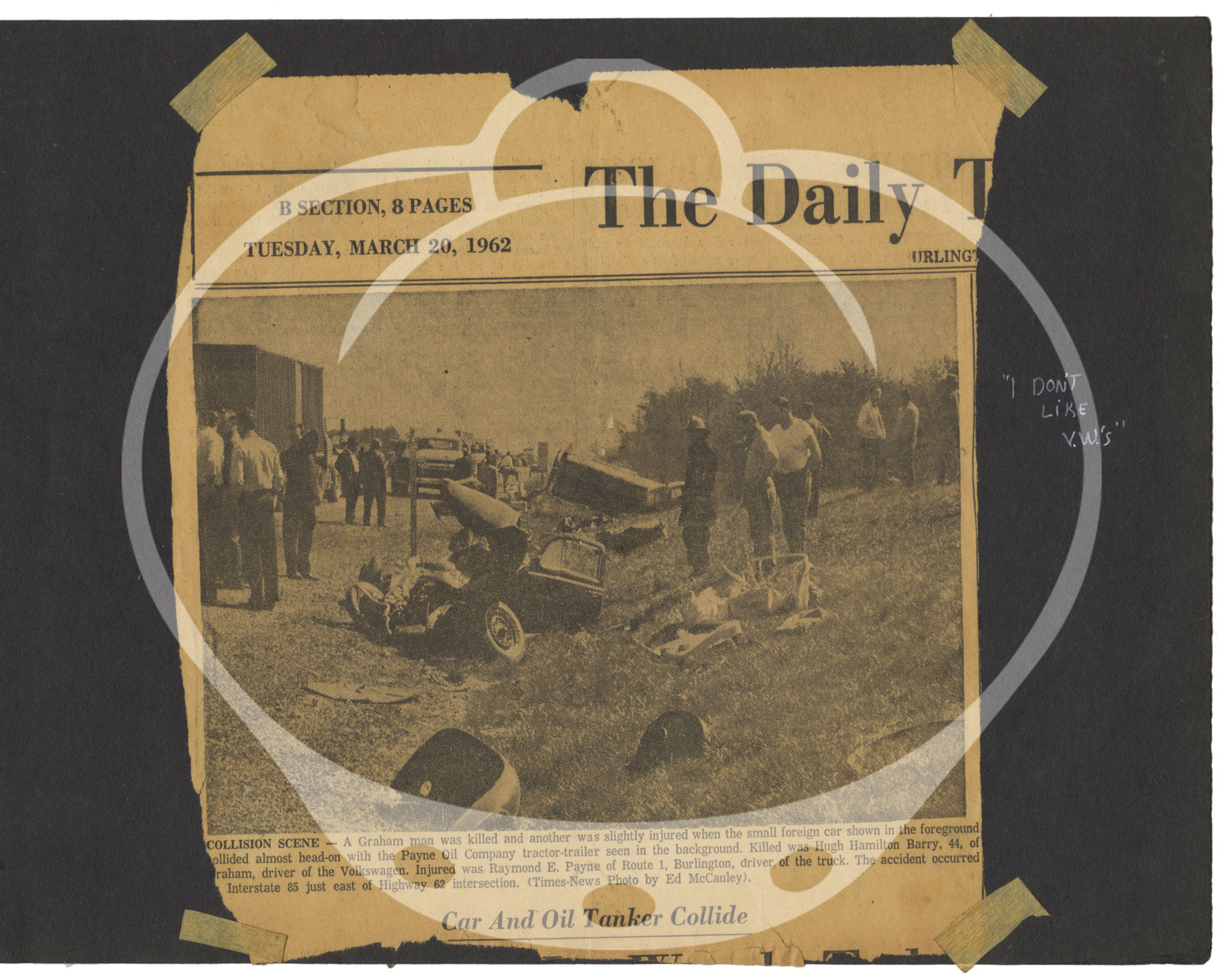 The newspaper clippings in the archive date from 1963 to 1966, with the majority about local automobile accidents, but also feature articles on NASCAR accidents and fatalities (Joe Weatherly), illegal racing, a transportation shop fire, a murder suicide, and an Alamance plane crash which killed three, which is included in two clippings as well as a full issue of the Daily Times News.