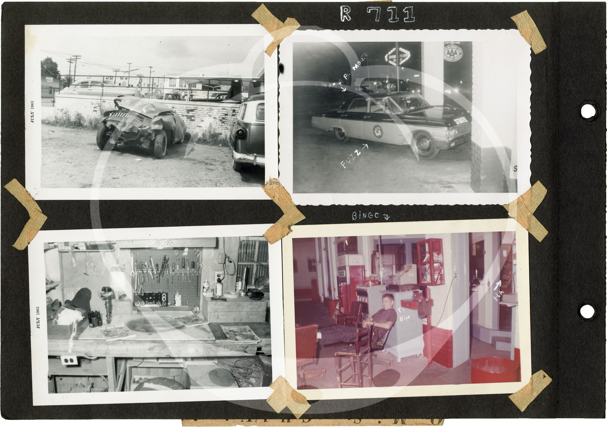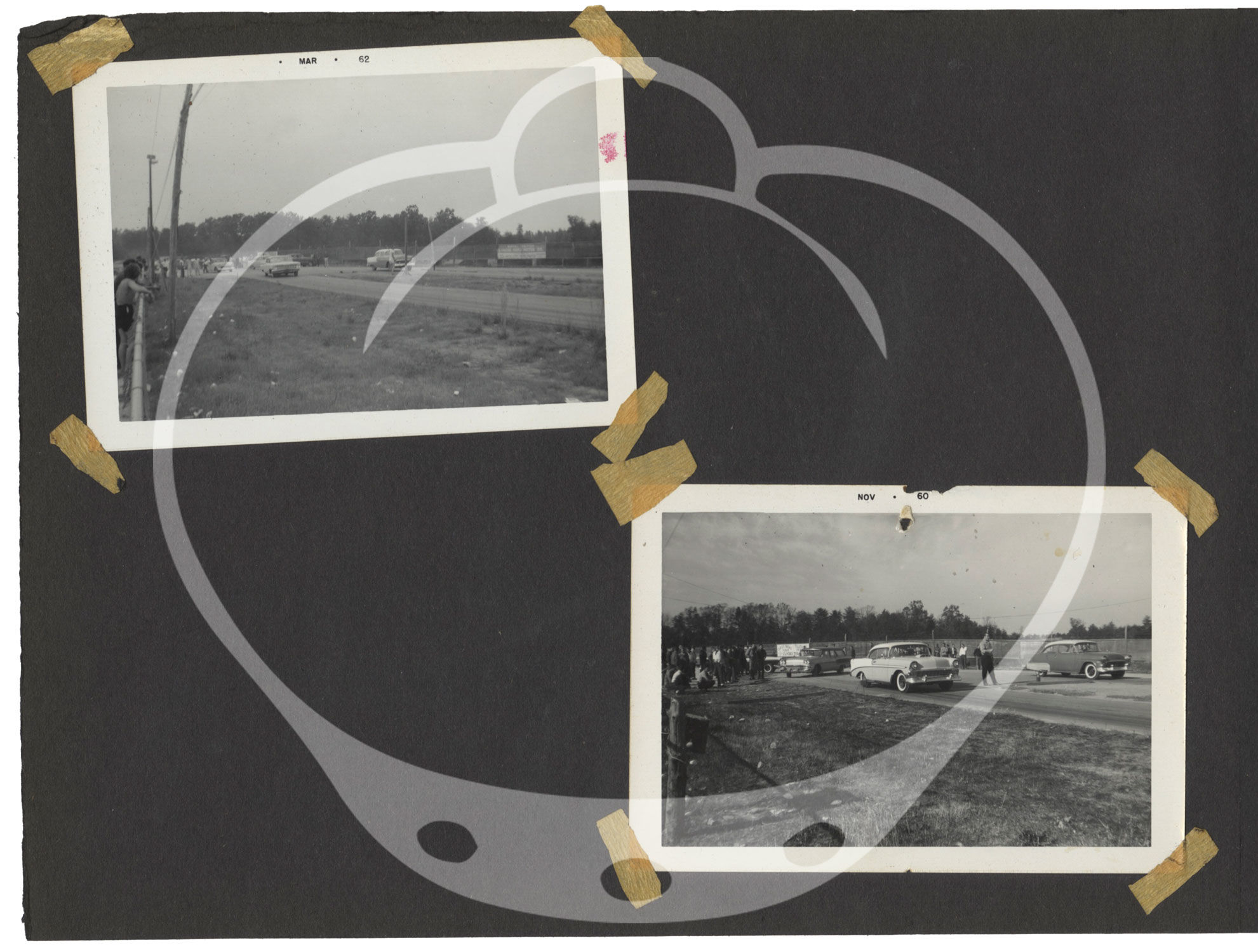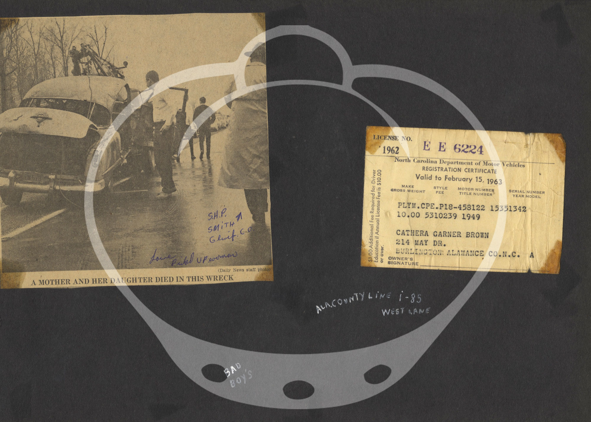 The archive, assembled by Brown when in his early twenties, documents his preoccupation with automobiles, automobile accidents, and racing, at a time when Brown was first employed as a tow truck driver for Cobb Motor Company, and later as part of a rescue unit (as seen in one of the newspaper clippings). In his later years, Brown would serve as an Alamance County Deputy Sheriff for 34 years. A copious and insightful vernacular documentation of the relationship of southern culture and automobiles in the early to mid 1960s.