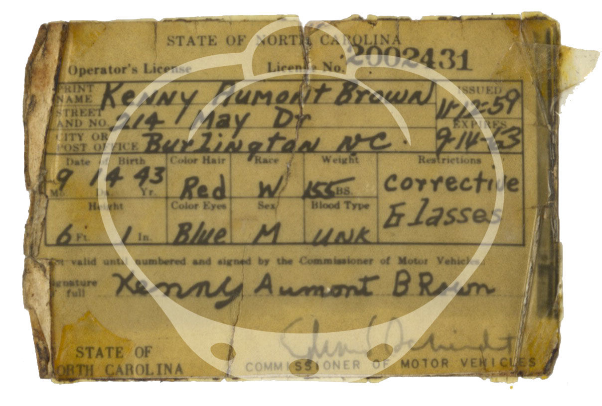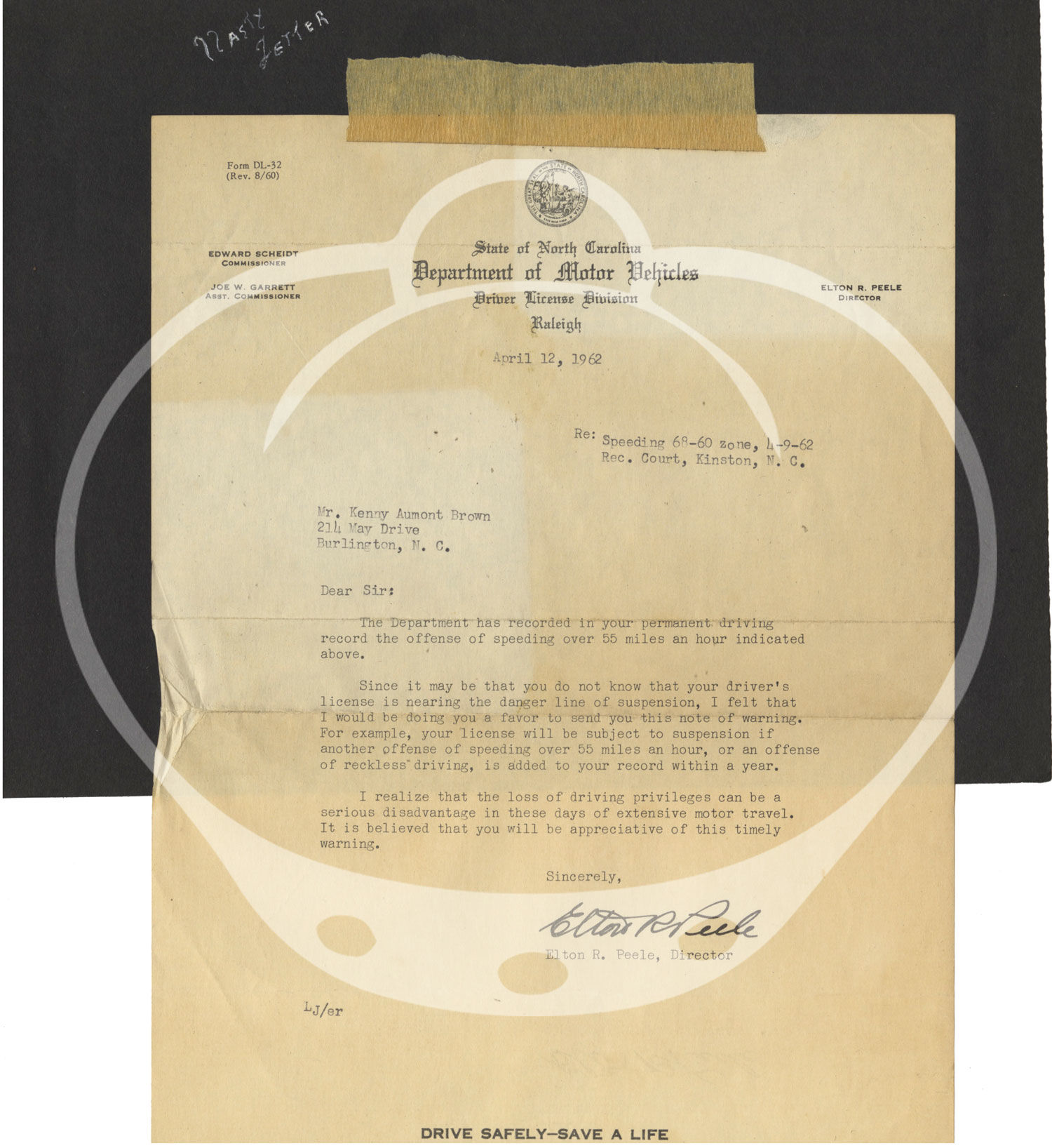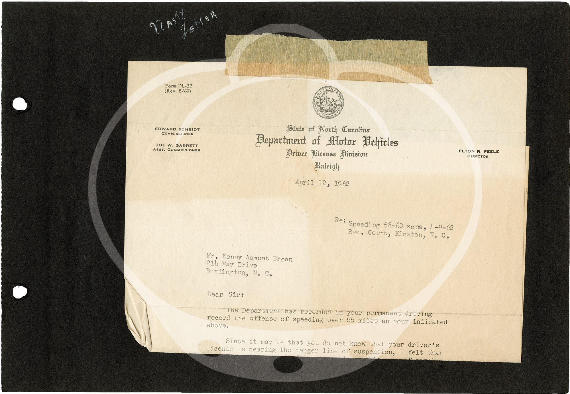 As well as the photographs and newspaper clippings, the archive includes various personal effects which include Brown's driver's license, two car registrations belonging to his mother, Cathera Garner Brown, a 1962 Dion and Sam Cook concert ticket, and a letter from the North Carolina Department of Motor Vehicles warning Brown his license is in danger of suspension from speeding violations (with an adjacent "Nasty Letter" annotation). Also included are much older family artifacts including a 1914 postcard receipt from Burlington Coffin Company, a 1917 postcard receipt from Piedmont Railway and Electric, and a 1919 receipt from Souther Bell Telephone and Telegraph Company, all belonging to a presumed grandfather, W.L. Burke, of Burlington.