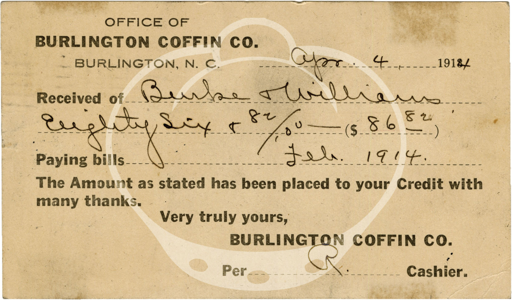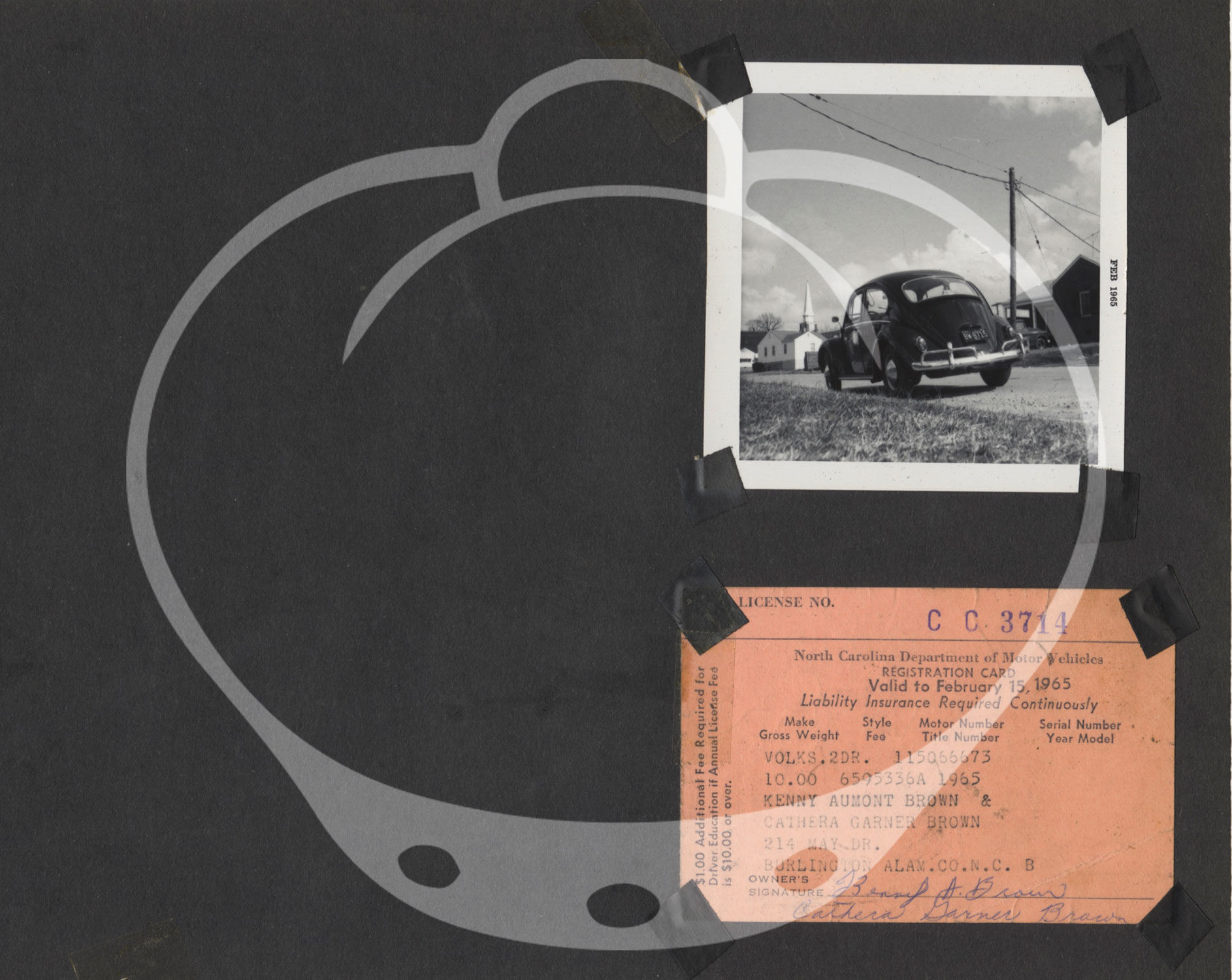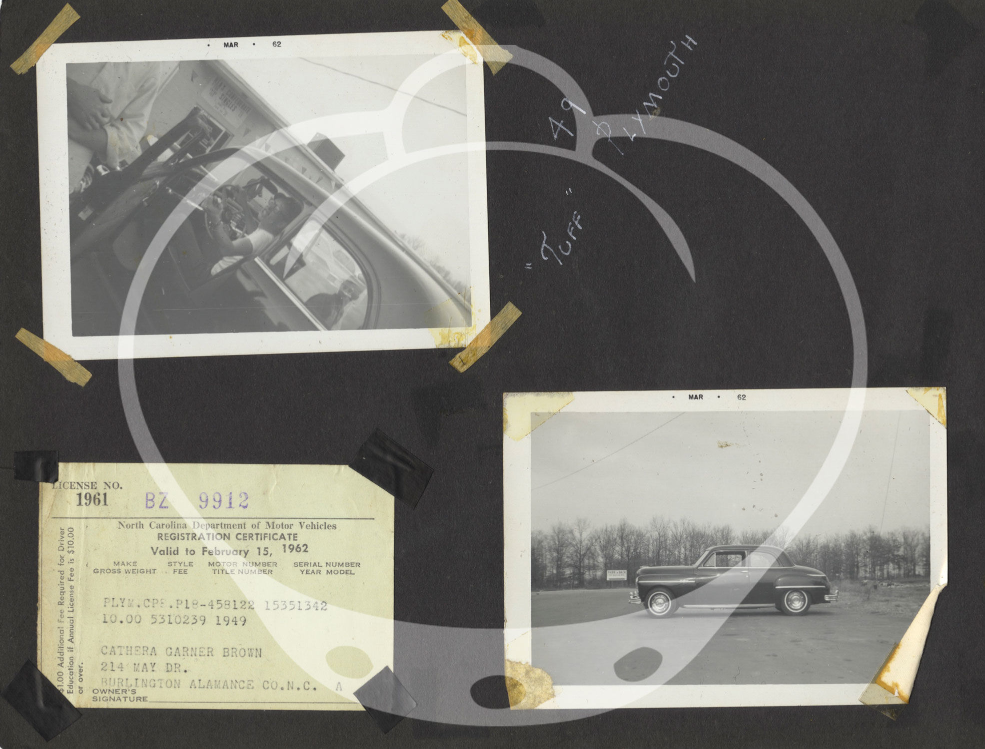 As well as the photographs and newspaper clippings, the archive includes various personal effects which include Brown's driver's license, two car registrations belonging to his mother, Cathera Garner Brown, a 1962 Dion and Sam Cook concert ticket, and a letter from the North Carolina Department of Motor Vehicles warning Brown his license is in danger of suspension from speeding violations (with an adjacent "Nasty Letter" annotation). Also included are much older family artifacts including a 1914 postcard receipt from Burlington Coffin Company, a 1917 postcard receipt from Piedmont Railway and Electric, and a 1919 receipt from Souther Bell Telephone and Telegraph Company, all belonging to a presumed grandfather, W.L. Burke, of Burlington.