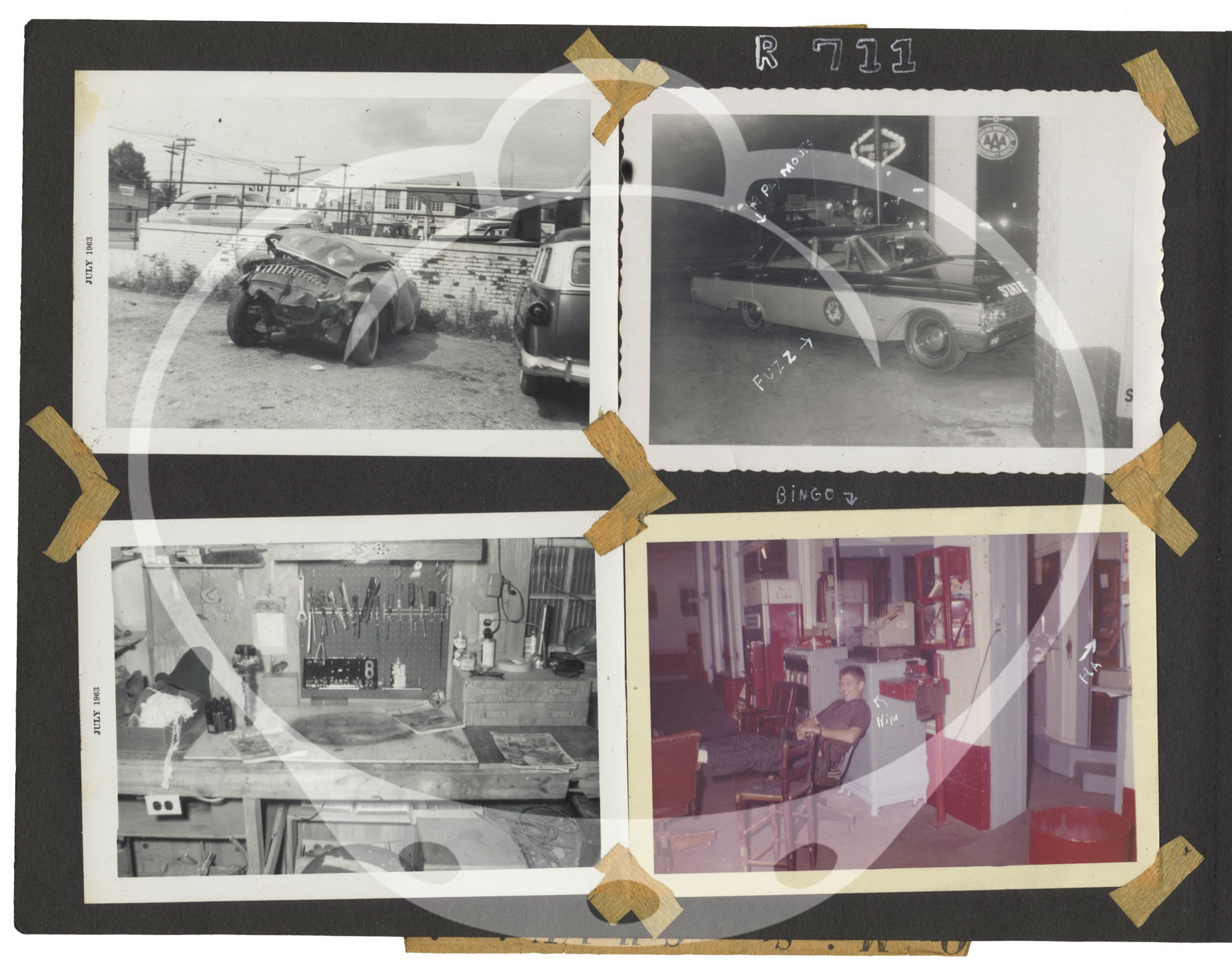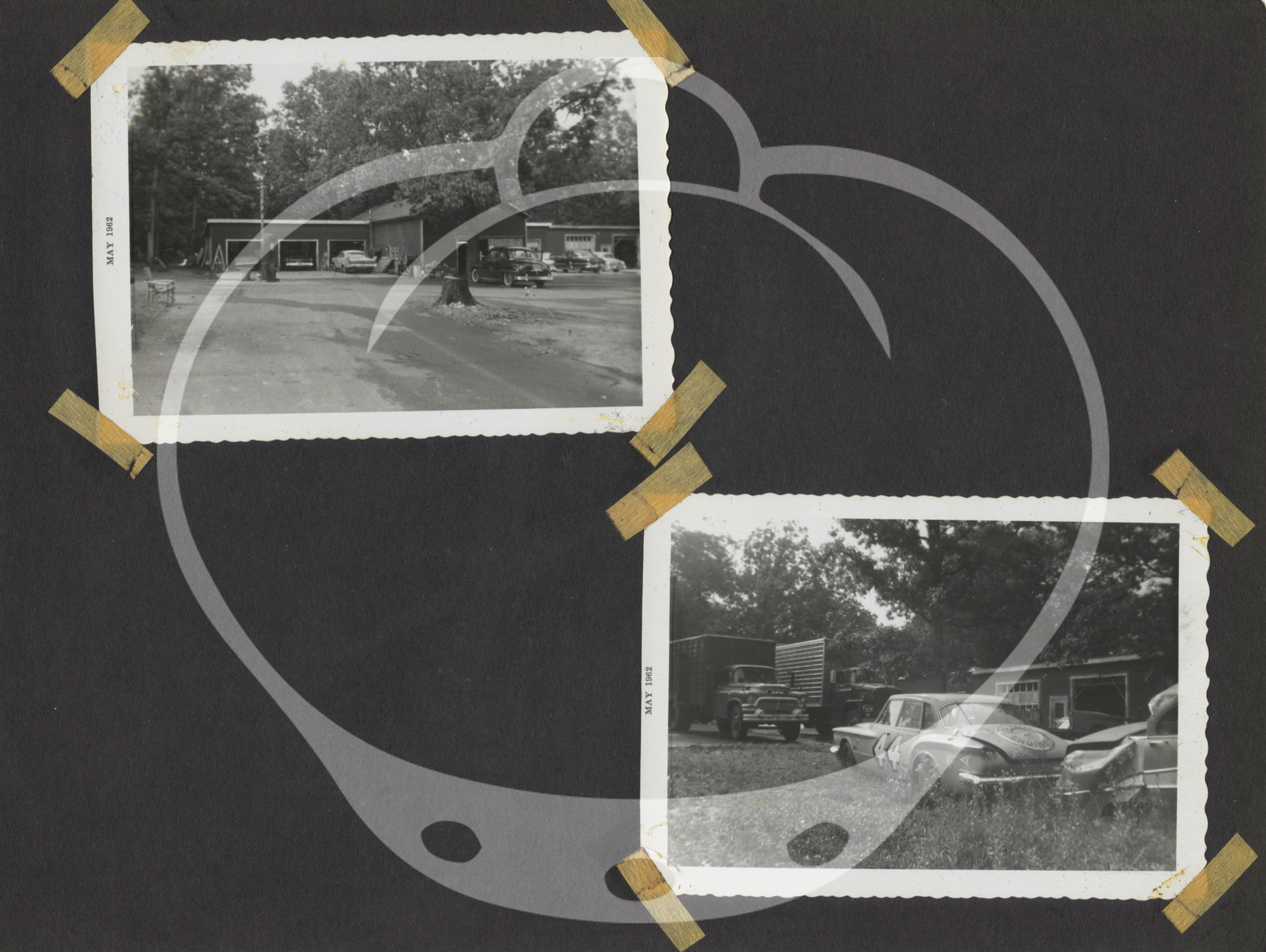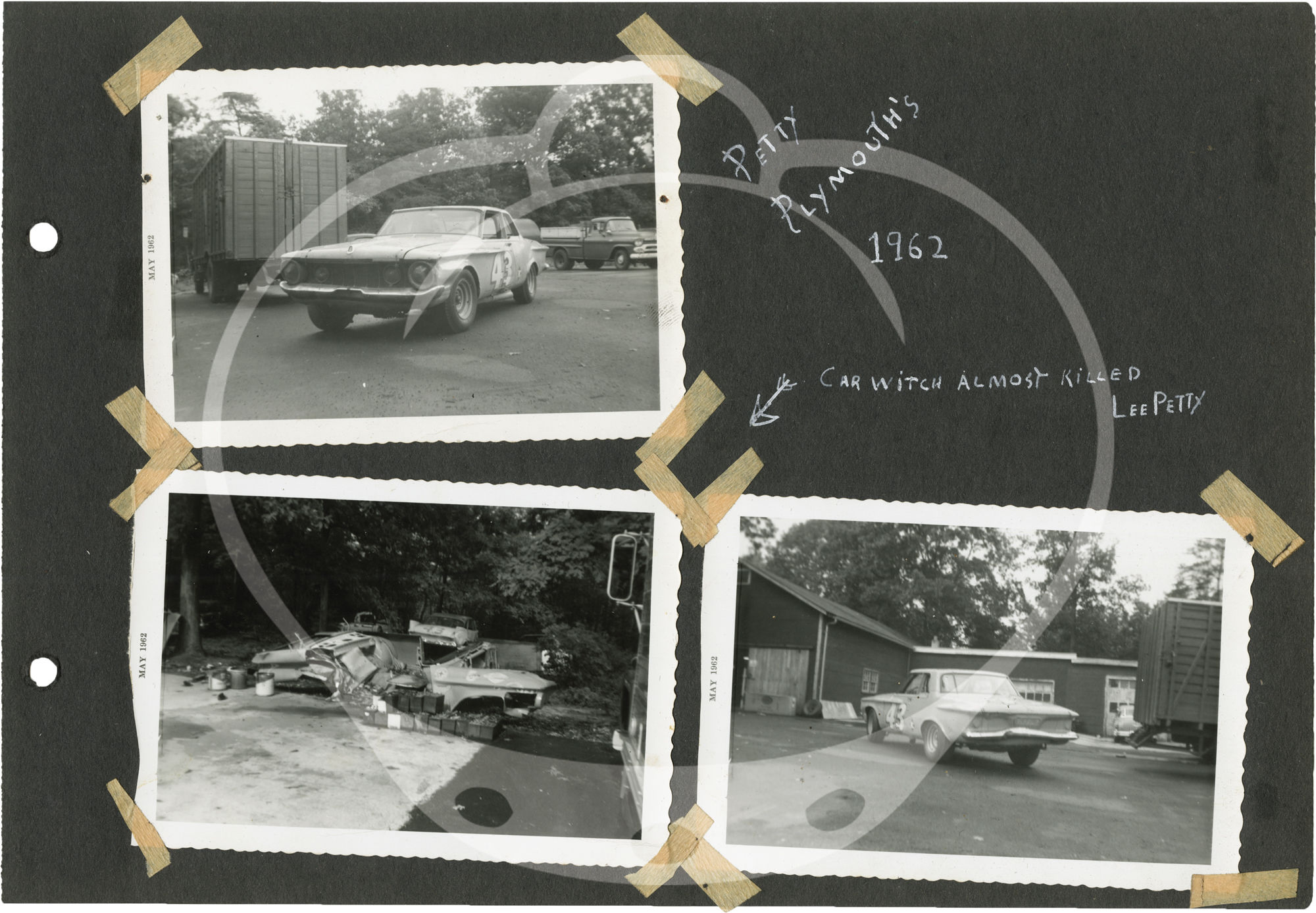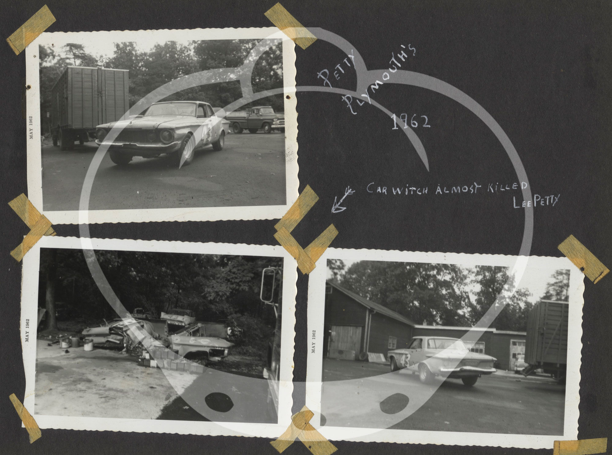 The photographs in the archive include shots of Cobb Motor Company vehicles and shop, including a circa 1930s photograph of a 1930s Cobb vehicle laid in, various crashed vehicles, with annotations including location and fatalities, wrecked NASCAR vehicles (one page including the annotations of "Petty Plymouth's 1962" and "Car witch (sic) almost killed Lee Perry"), three of local drag races, and several of friends and family vehicles, including Brown's own cherished 1949 Plymouth, which he identifies as "My Own True Love KAB." Many of the photographs include developer dates stamped into the margin which range from 1958, 1960, 1962, and 1965.