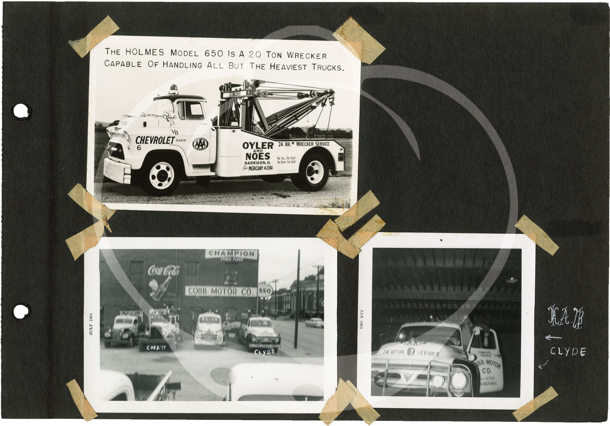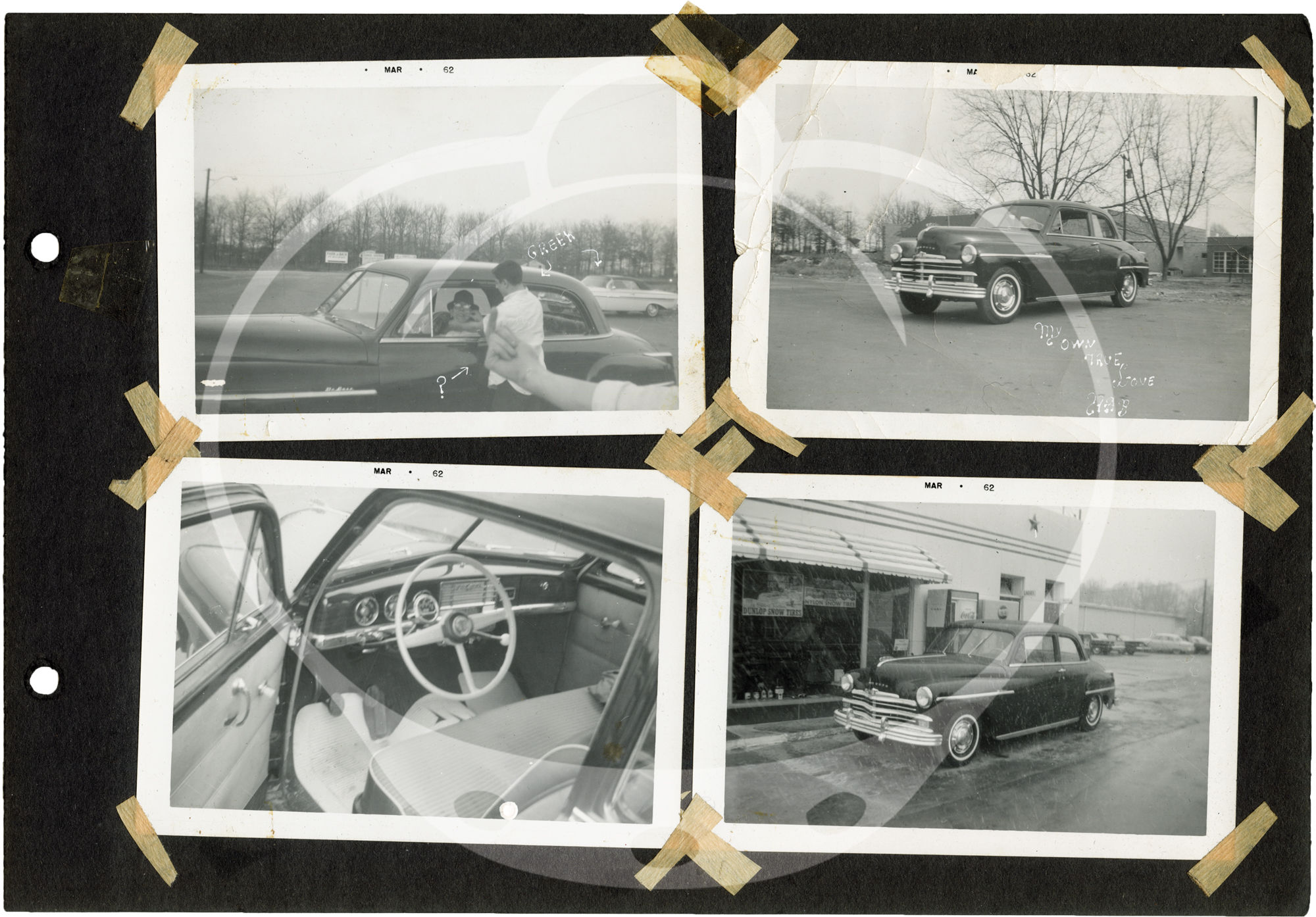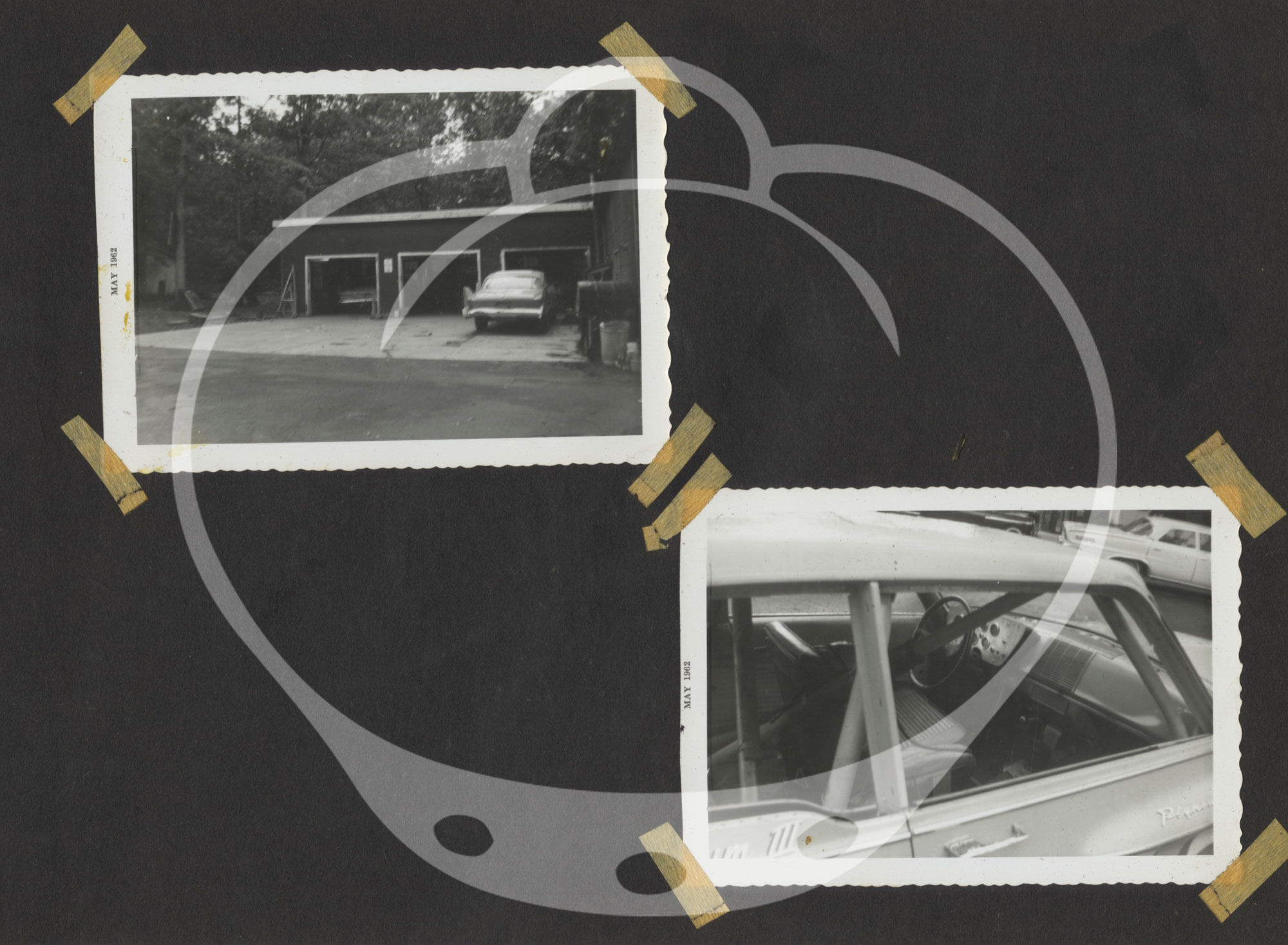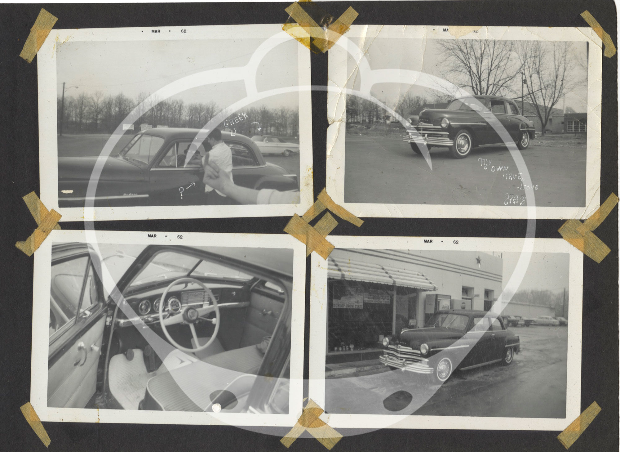 The photographs in the archive include shots of Cobb Motor Company vehicles and shop, including a circa 1930s photograph of a 1930s Cobb vehicle laid in, various crashed vehicles, with annotations including location and fatalities, wrecked NASCAR vehicles (one page including the annotations of "Petty Plymouth's 1962" and "Car witch (sic) almost killed Lee Perry"), three of local drag races, and several of friends and family vehicles, including Brown's own cherished 1949 Plymouth, which he identifies as "My Own True Love KAB." Many of the photographs include developer dates stamped into the margin which range from 1958, 1960, 1962, and 1965.