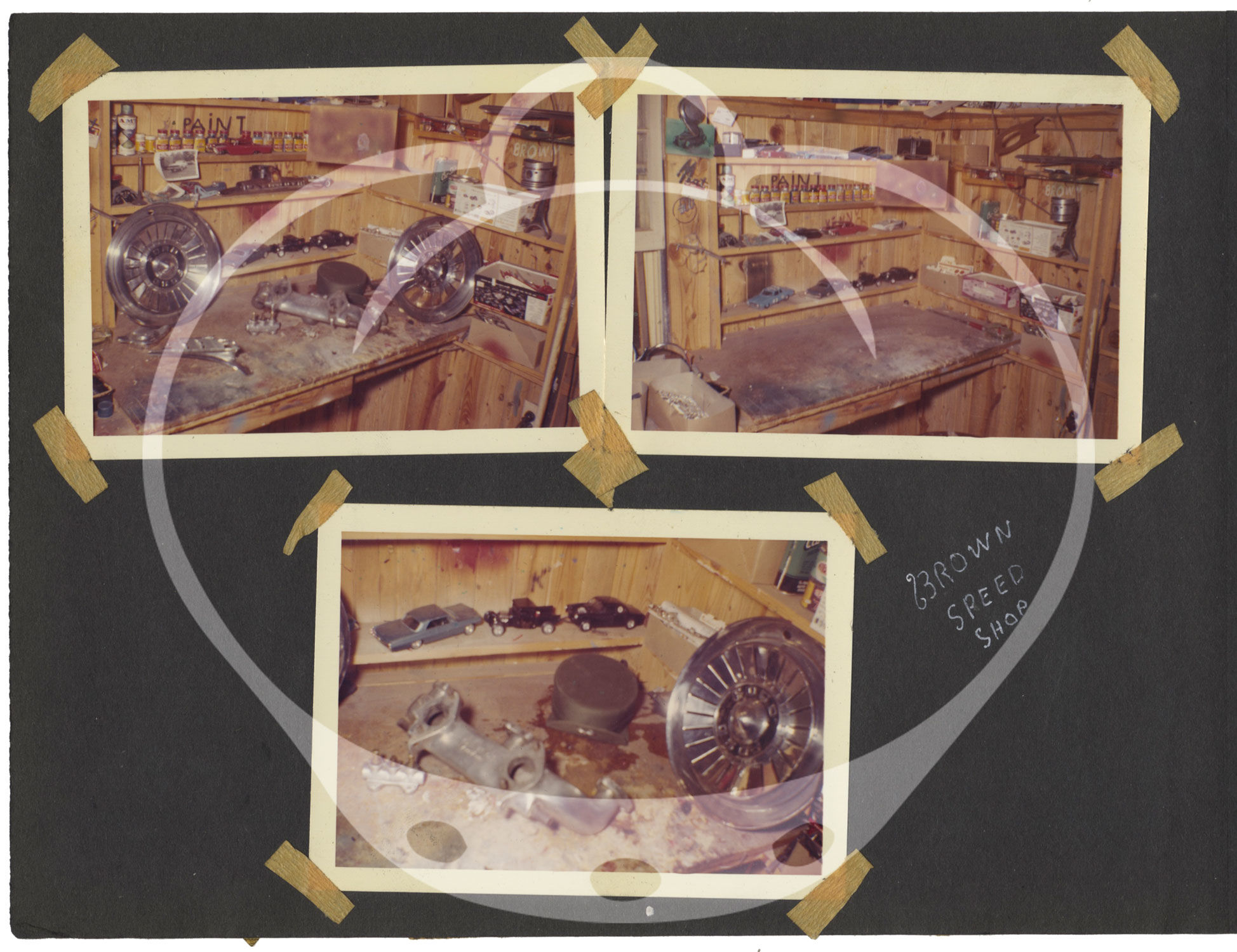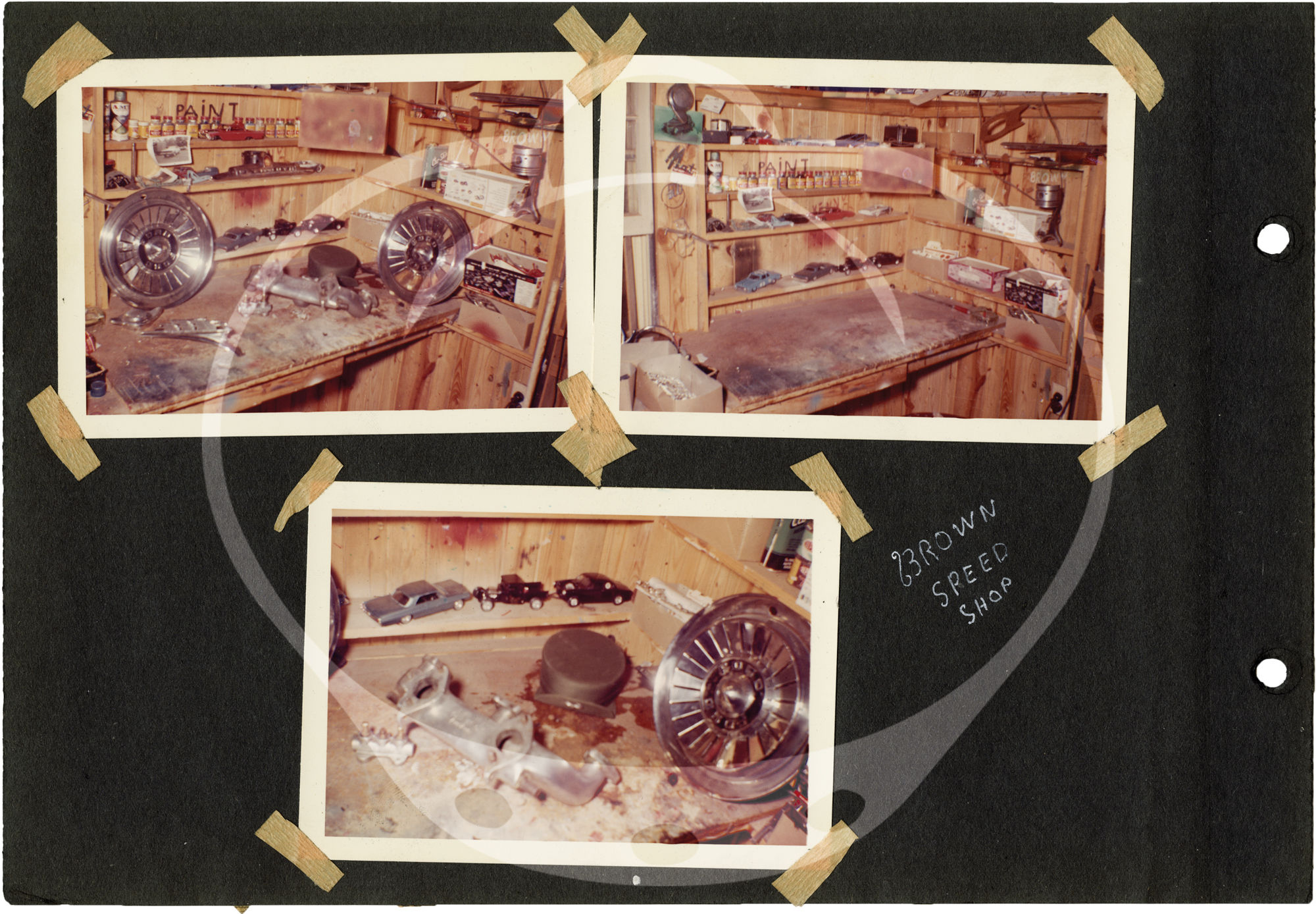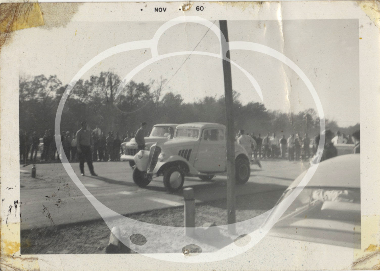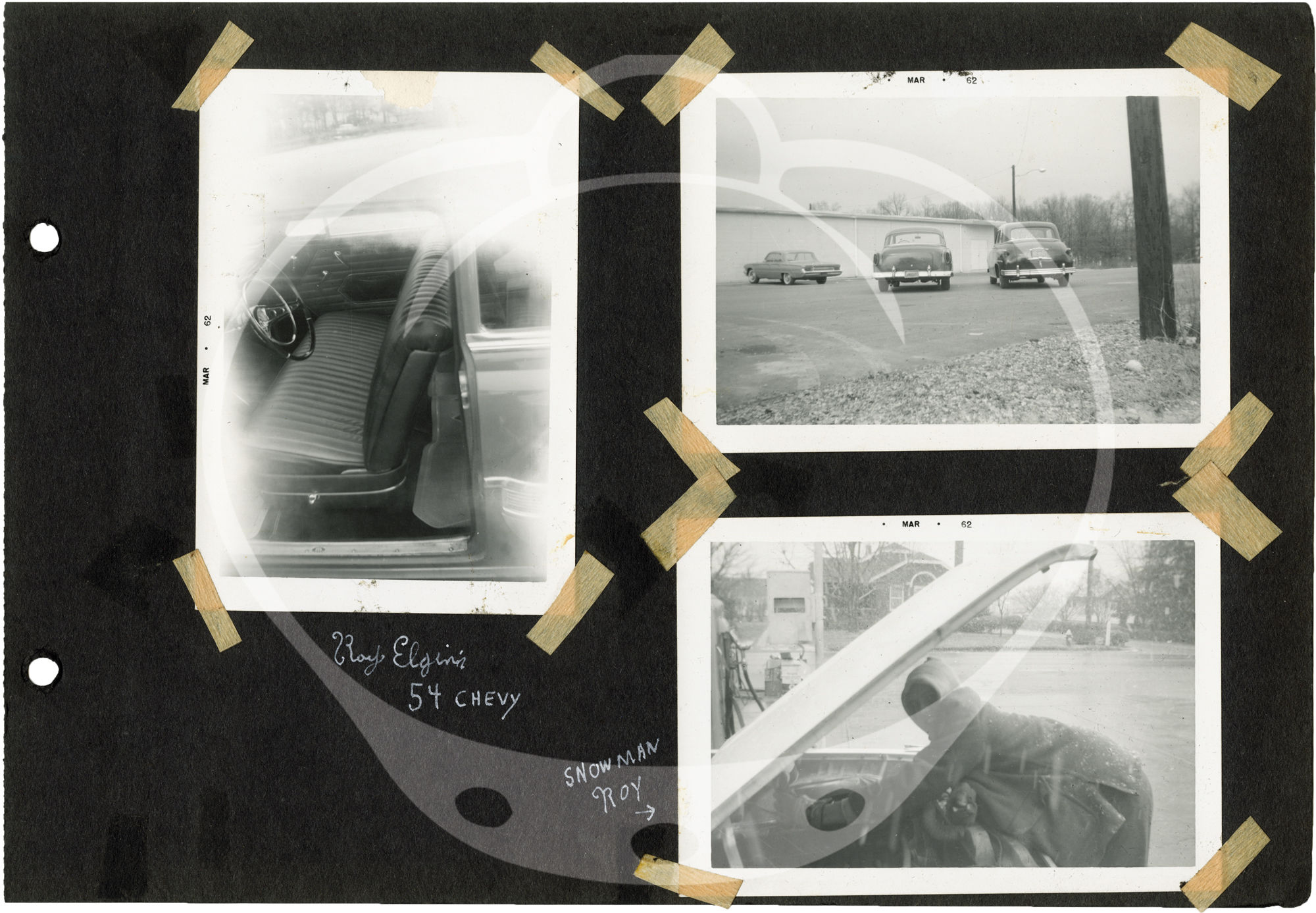 The photographs in the archive include shots of Cobb Motor Company vehicles and shop, including a circa 1930s photograph of a 1930s Cobb vehicle laid in, various crashed vehicles, with annotations including location and fatalities, wrecked NASCAR vehicles (one page including the annotations of "Petty Plymouth's 1962" and "Car witch (sic) almost killed Lee Perry"), three of local drag races, and several of friends and family vehicles, including Brown's own cherished 1949 Plymouth, which he identifies as "My Own True Love KAB." Many of the photographs include developer dates stamped into the margin which range from 1958, 1960, 1962, and 1965.