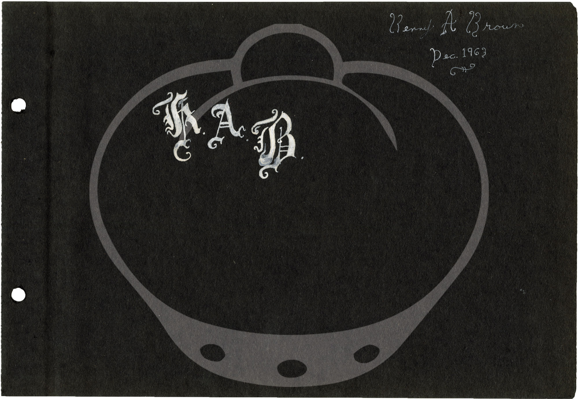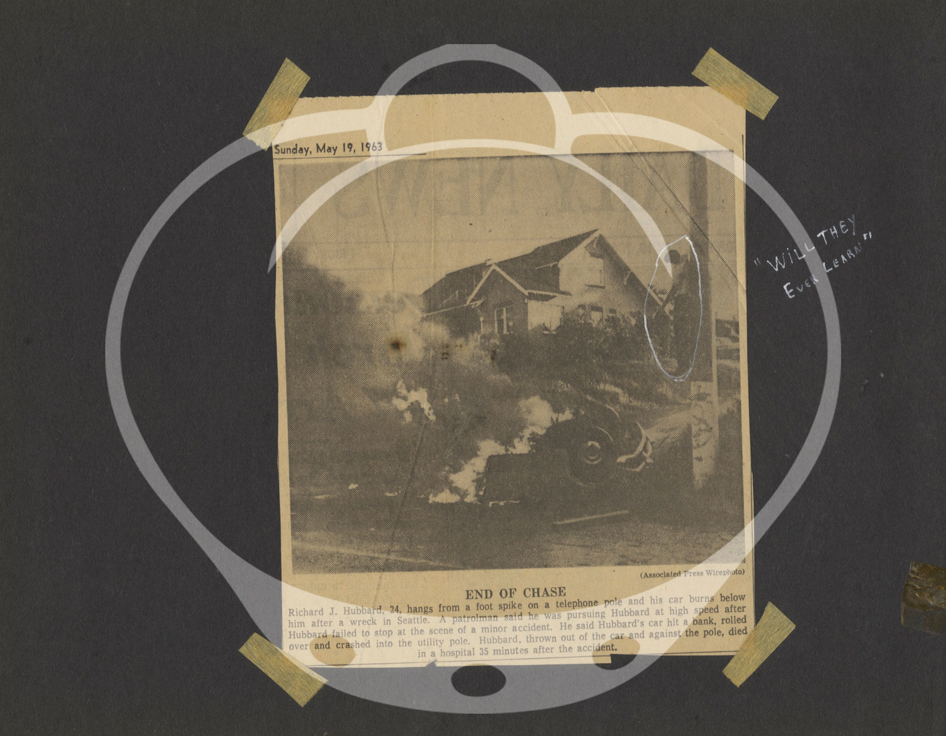 On the first leaf of the album is Brown's name, dated "Dec. 1963," and his initials in bold Gothic calligraphy in white. On the verso of the first leaf is a Sunday, May 19, 1963 newspaper clipping of an accident featuring a strikingly disturbing photograph of a man hanging from a telephone pole upon which his body was thrown, his car burning below him, with the adjacent annotation "Will They Ever Learn." The photograph in the clipping is of note as it was the image appropriated by Andy Warhol for his 1963 painting "Green Car Crash (Green Burning Car I)," one of the most celebrated paintings of his early "Death and Disaster" series.