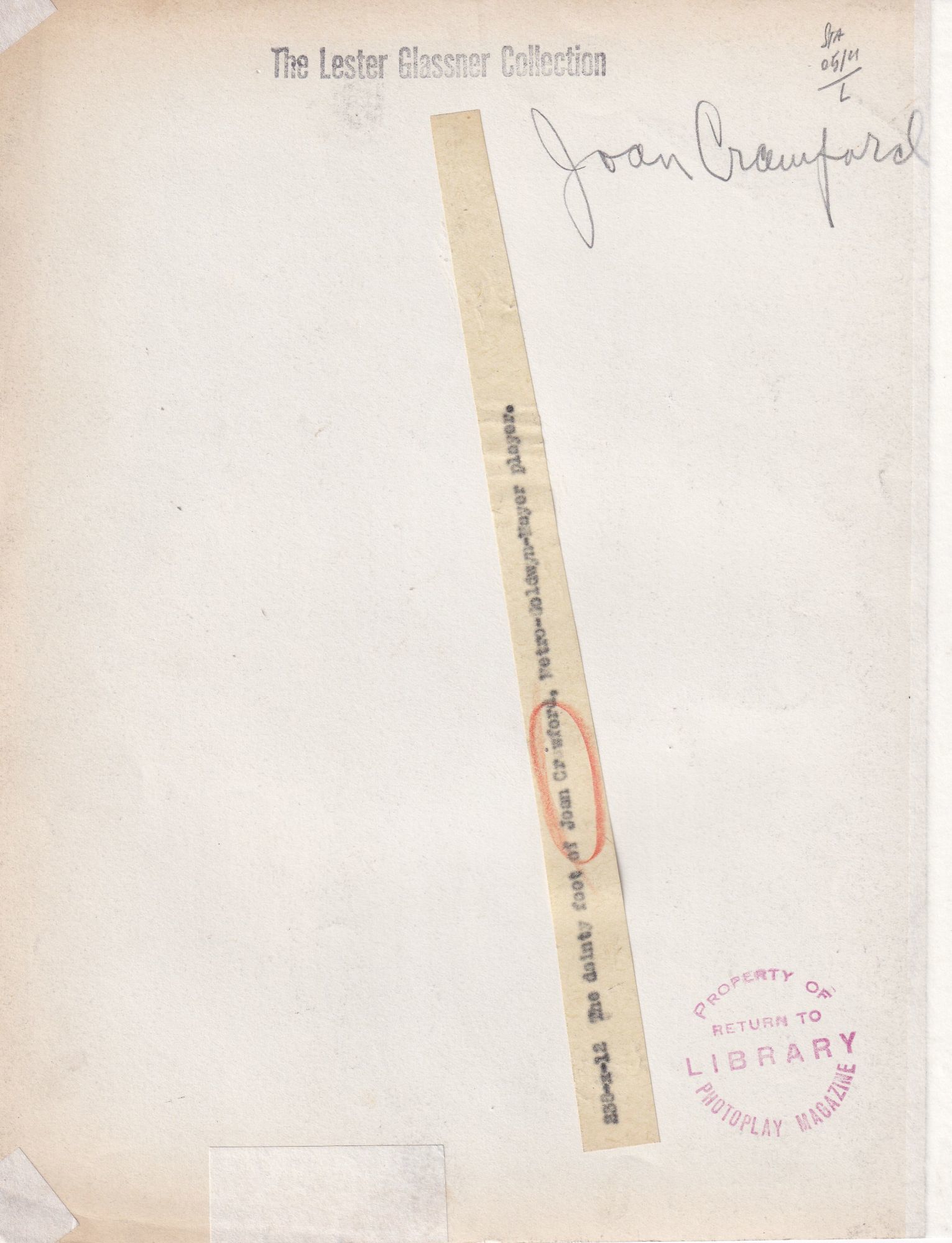 Mimeo snipe affixed to the verso, along with the stamp of Photoplay Magazine and a stamp stating provenance.