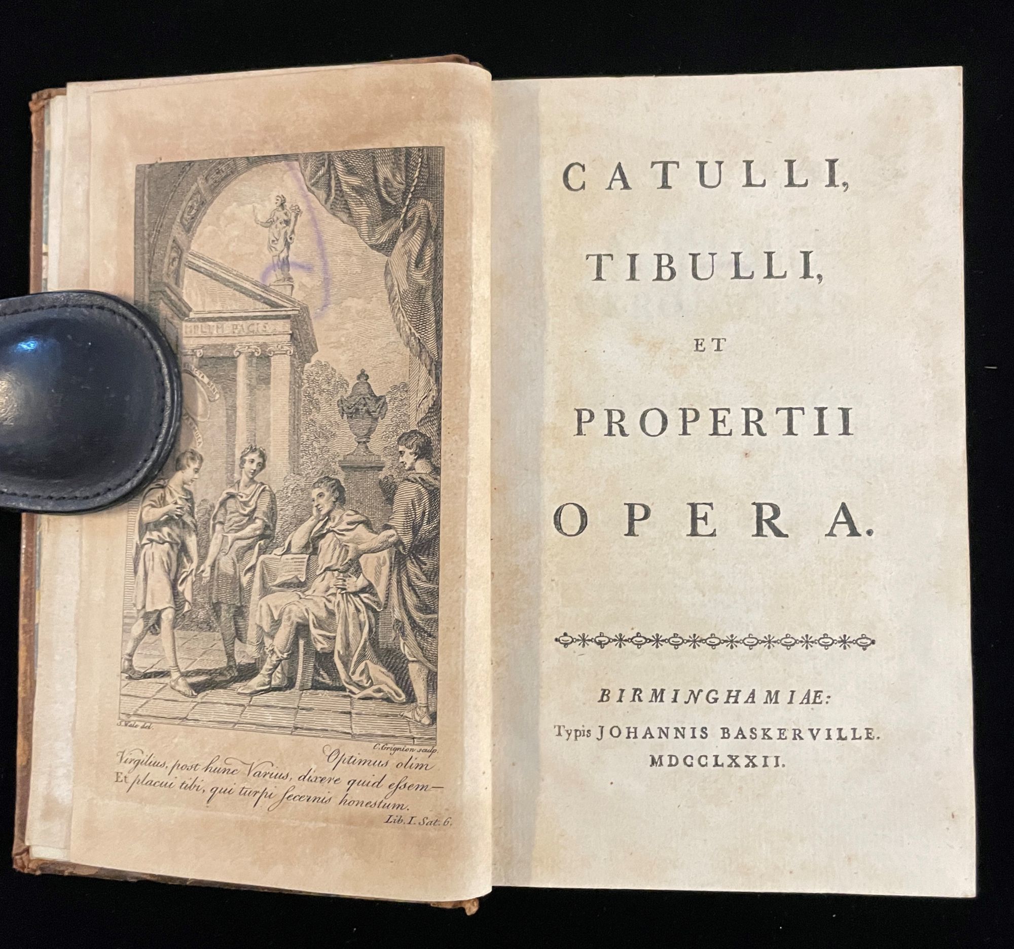 Birmingham: Johannis Baskerville, 1772. Hardcover. Very Good. 1772 edition by famous printer Baskerville. 8vo, old (perhaps original) binding of mottled calf and delicately designed compartments in gilt to spine, marbleized endpapers. Front hinge revealed but holding. Numeral 6 indelicately written in purple marker on fly. Engraved frontispiece. (6) 276 (2).