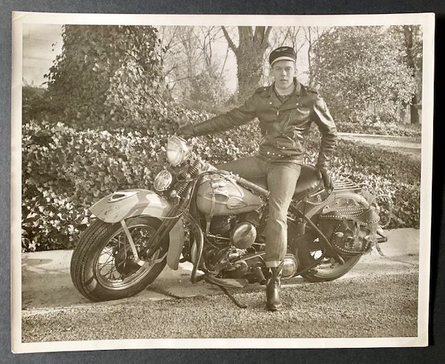 Photograph. Near Fine. Wonderful early photograph --circa 1940s-- of a motorcyclist sitting in a provocative pose on his Harley-Davidson. The photo is clean and very sharp, measures 8" x 10" and was taken by professional photojournalist Marshall Hathaway.