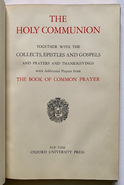 New York: Oxford University Press, 1929. Leather bound. Near Fine. A handsome copy of this elegant 1929 edition of the Holy Communion, bound in a full dark-morocco, with 5 raised bands and bright gilt-titling along the spine. Light wear to the outer hinges, internally immaculate, with no writing or markings of any kind. Tall quarto, all edges gilt, lovely purple-silk endsheets and pastedowns.