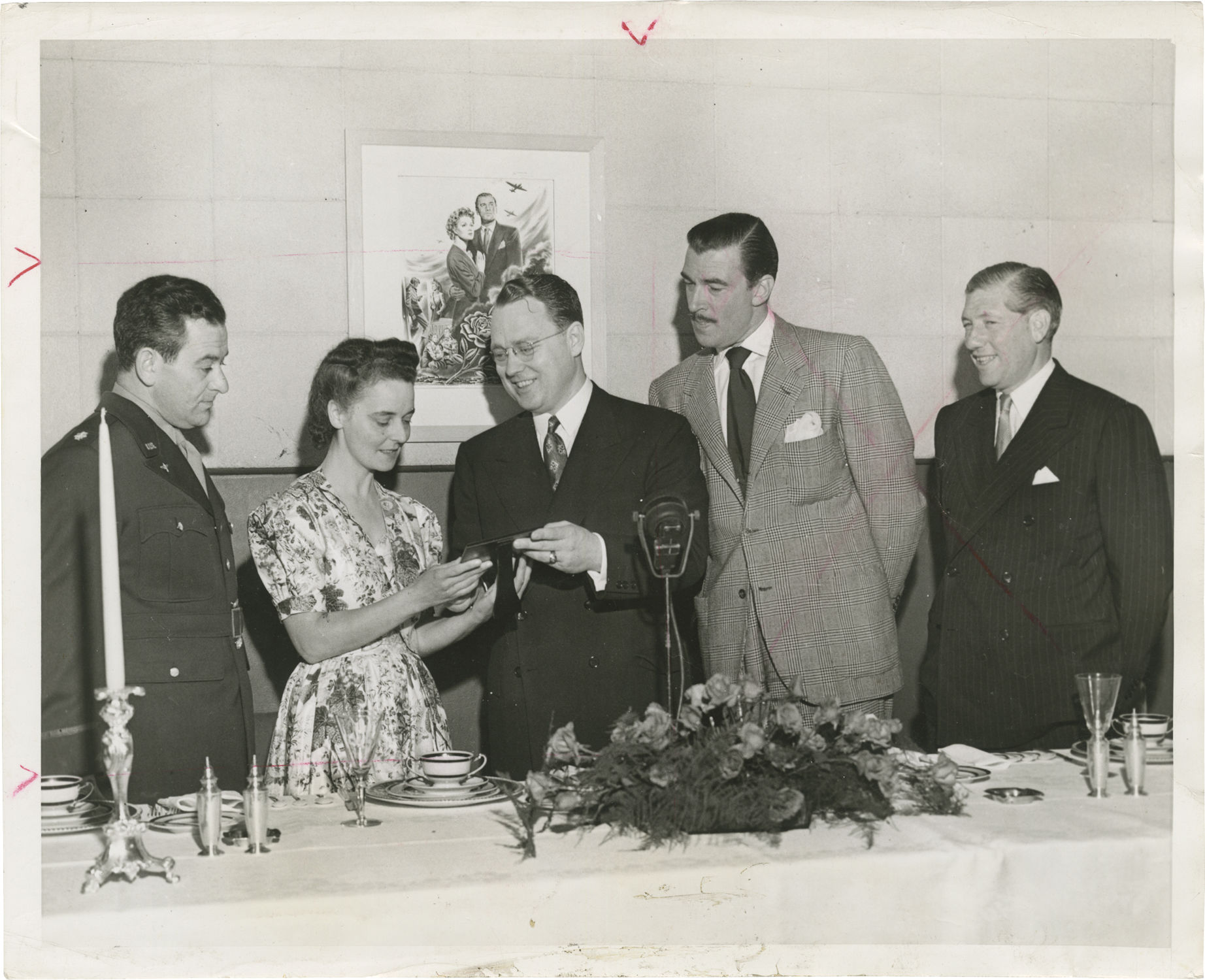 N.p.: N.p., 1942. Vintage photograph of director William Wyler, writer Jan Struther, and actor Walter Pidgeon accepting Radio City Music Hall Oscarette awards for the 1942 film "Mrs. Miniver." Printed mimeo snipe affixed to the verso, along with file stamps.