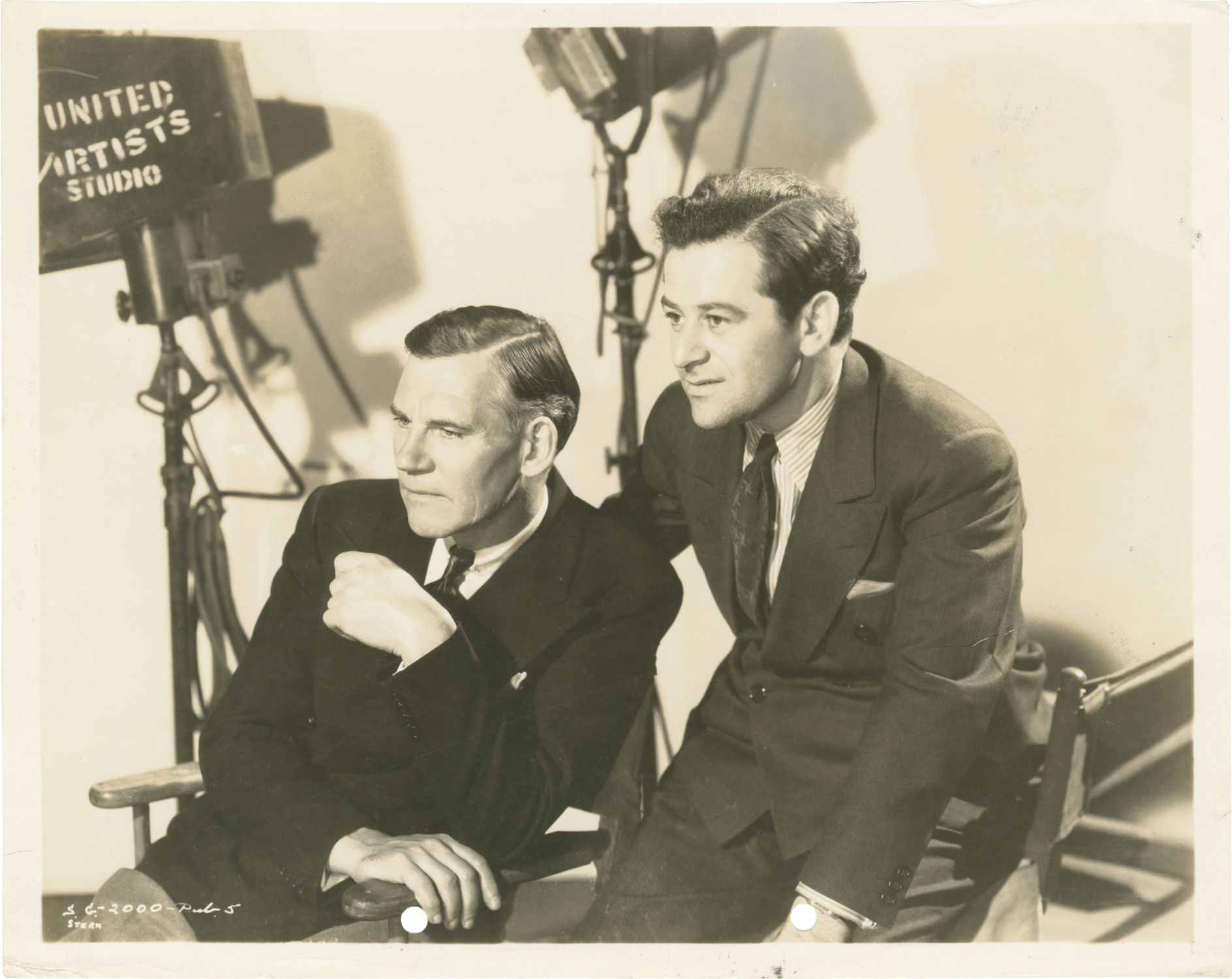 Beverly Hills, CA: United Artists, 1936. Vintage reference photograph of director William Wyler and actor Walter Huston on the set of the 1936 film. Printed mimeo snipe affixed to the verso, along with a date stamp in French, reading 30 Juil (July) 1936.