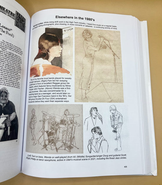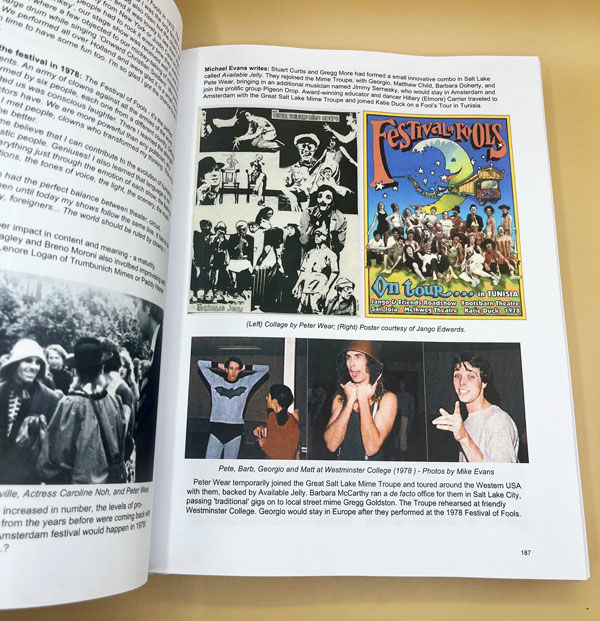 "Amsterdam’s Compleat Fools" collects reproductions of actual items and relics from five decades –nearly full-sized colorful programs that audiences held in their hands as they watched these shows in action; bright posters from the streets and theaters; artwork and photography from abroad; actual relics from the 70’s, 80’s, 90’s, and the Millennium rescued from dresser drawers, old office shelves and filing cabinets. There are eyewitness tales from both sides of the stage and on the road. These accounts also include some drawings by author Michael Evans from his vantage point in the Western USA, which includes scenes from SLC’s own history from the Cosmic Aeroplane, real SLC Punk-Rock, KRCL Community Radio, the Zephyr, and more!