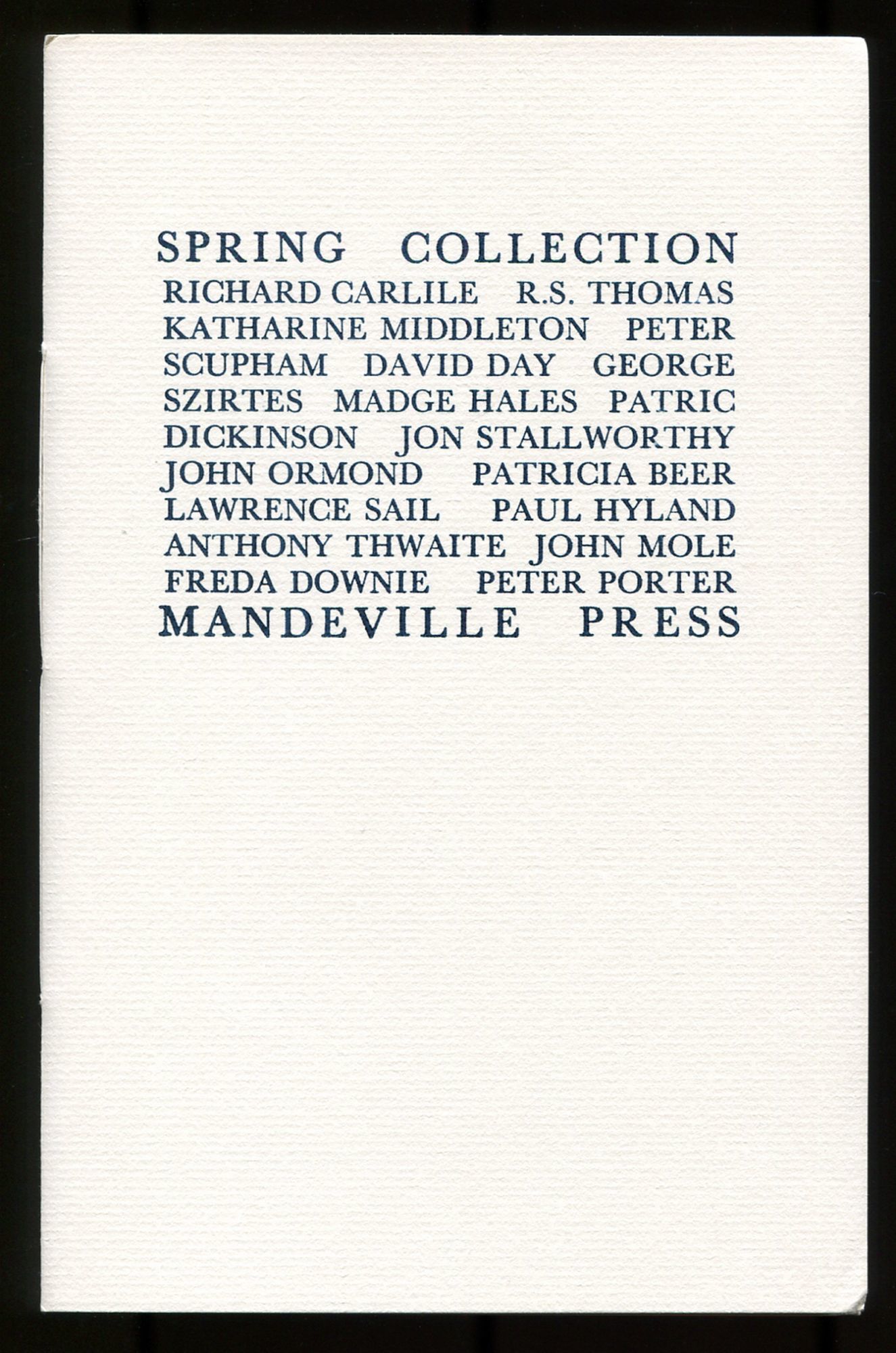 (Hitchin, Hertfordshire): Mandeville Press, 1977. Softcover. Fine. First edition. Printed sewn wrappers. A fine copy. Poems by R. S. Thomas, Richard Carlile, Katharine Middleton, Peter Scupham, David Day, George Szirtes, Madge Hales, Patric Dickinson, Jon Stallworthy, John Ormond, Patricia Beer, Lawrence Sail, Paul Hyland, Anthony Thwaite, John Mole, Freda Downie, and Peter Porter.