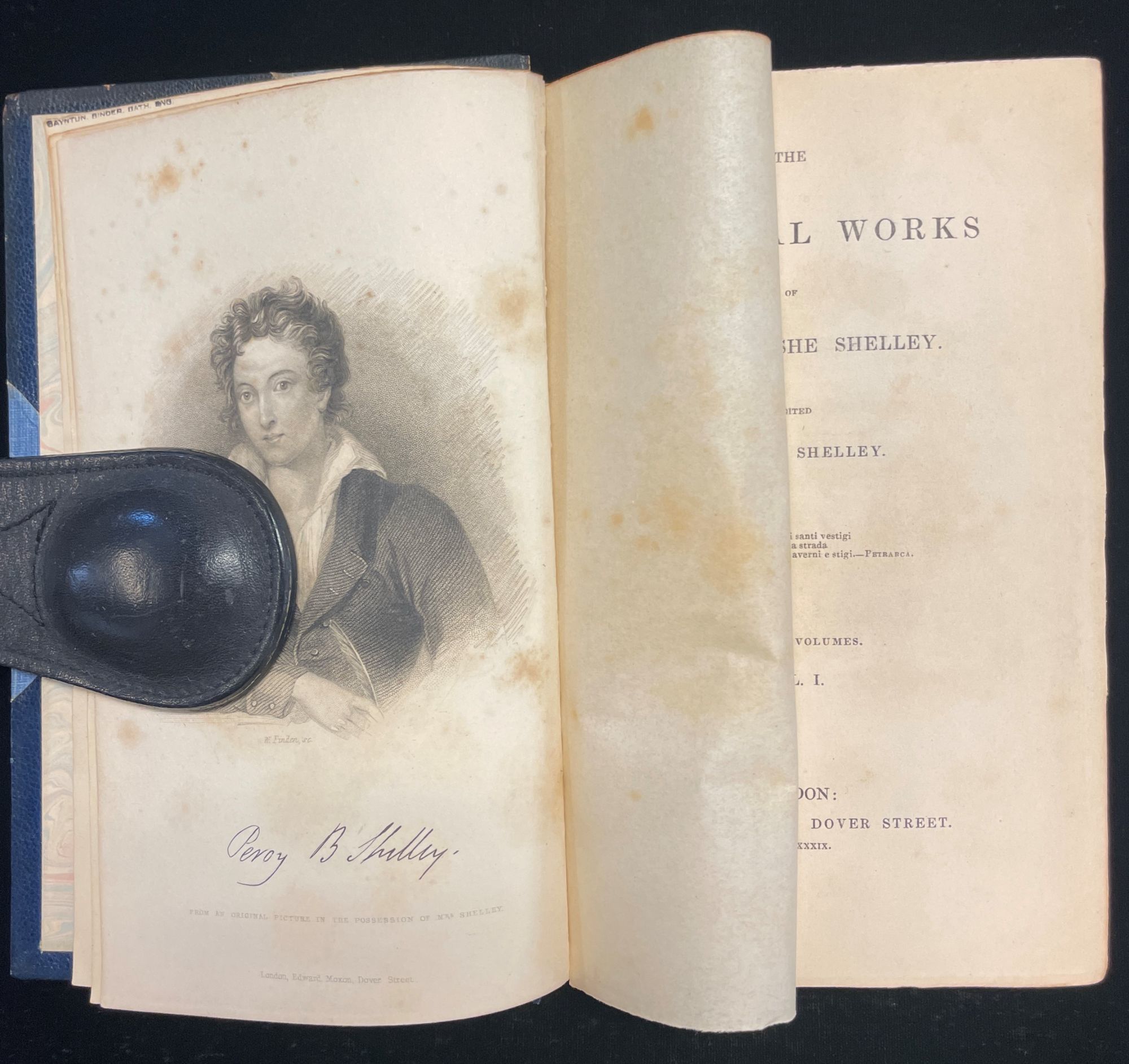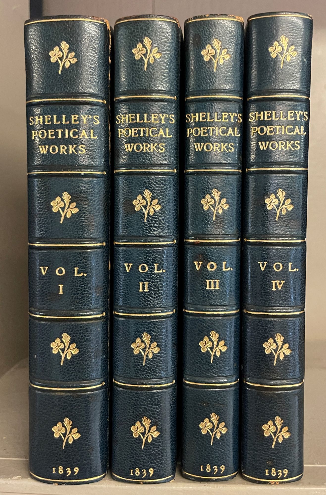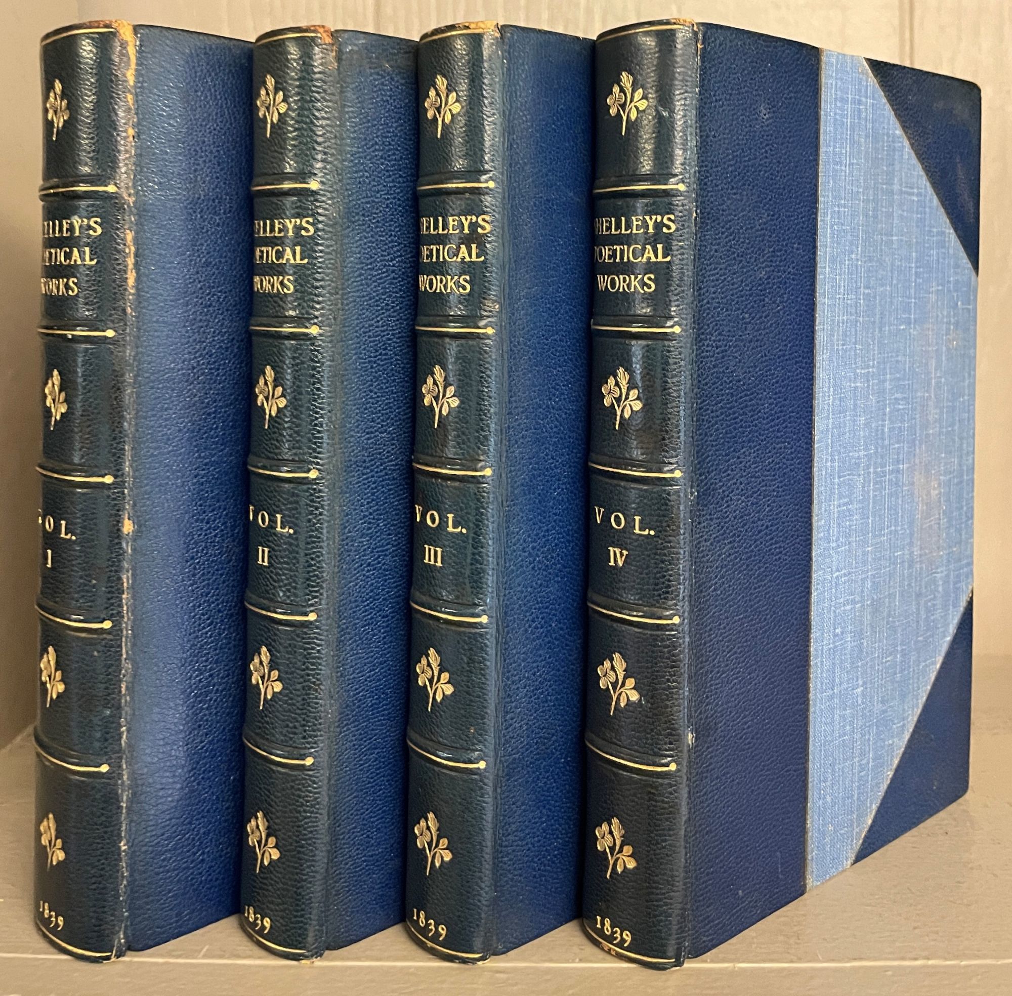 London: Edward Moxon, 1829. 1st Edition. Hardcover. Near Fine. First collected edition of Shelley's works, with Queen Mab bound in at rear of volume 1. Bound by Bayntun in polished blue half leather, gilt to spine, over light blue linen, teg. Some wear to spine tips and edges. Trace spotting confined to prelims, titles.