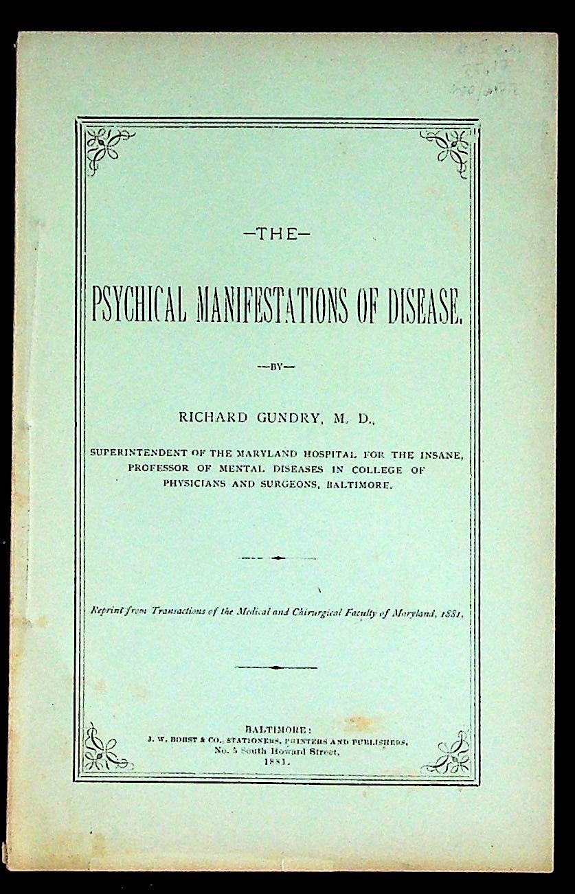 Baltimore: J.W. Borst & Co, 1881. Paperback. Very Good. Paperback. Gundry was the superintendent of the Maryland Hospital for the Insane and a professor of Mental Disease in the College of Physicians and Surgeons in Baltimore. This article is reprinted from the Transactions of the Medical and Chirurgical Faculty of Maryland, 1881. Sewn with green paper wrappers titled in black on front wrapper. Minor wear to edges and light foxing to covers. Clean interior. 22 pages. MED/060722.