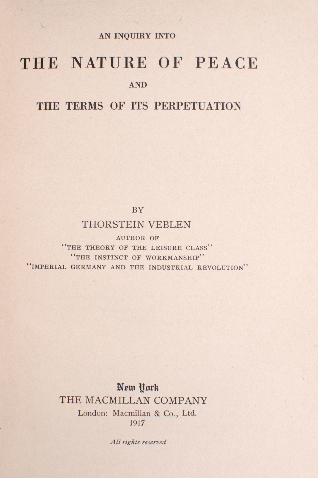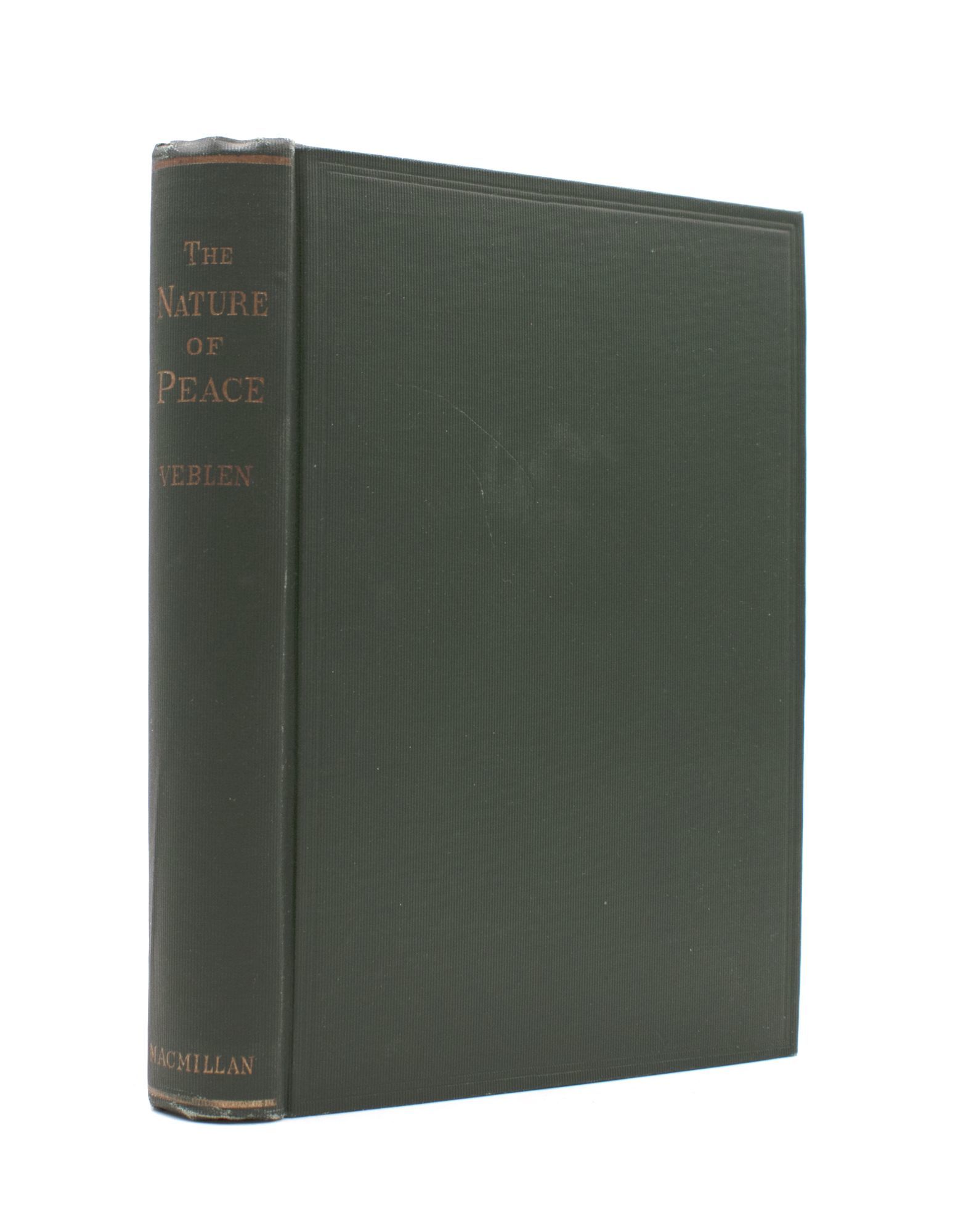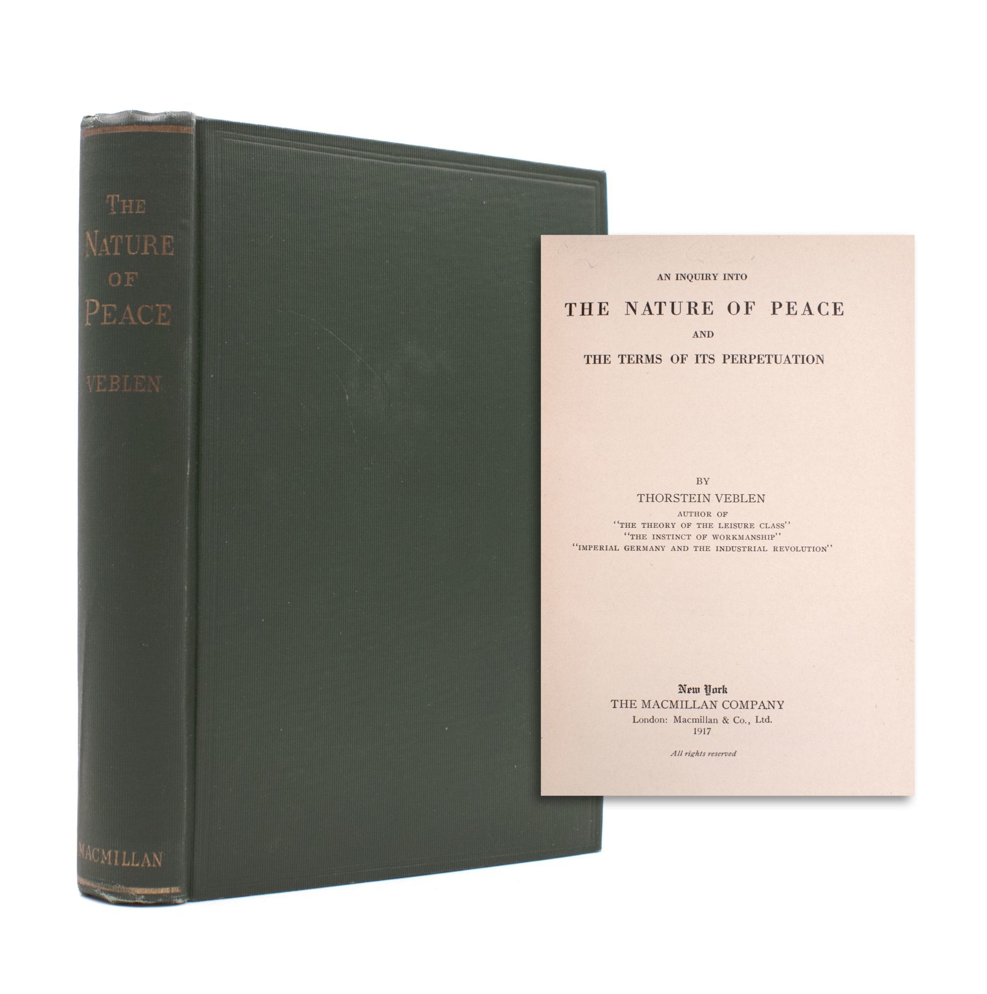 New York: The Macmillan Company, 1917. First edition. xiii,[3], 367, 7, ads] pp. 1 vols. 8vo. Publisher's green cloth. Fine. First edition. xiii,[3], 367, 7, ads] pp. 1 vols. 8vo. Veblen's work on peace, how it may be achieved and maintained, as well as the possible effects of perpetual peace on society.