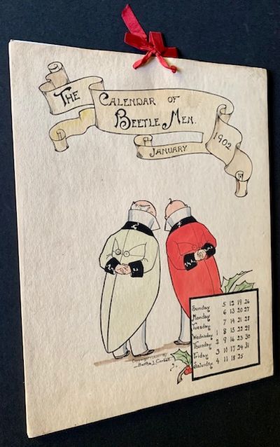 1901. Very Good +. Bertha Corbett. Uncommon 1902 calendar depicting men-as-beetles. No publication information included. The calendar consists of 12 leaves of thick tan paper (9 1/2" x 12"), bound with the original red ribbon at the top. Light spot on the first leaf, otherwise bright and Near Fine. Each month of the year features a pair of humanized beetles engaging in activities pertinent to that month. Featuring large color illustrations by Bertha Corbett similar to her Sunbonnet Babies in that you don't see the faces of the beetles. The pictures appear to be hand-colored and are quite charming. (Corbett was an American cartoonist and illustrator who studied under Howard Pyle at the Drexel Institute.).