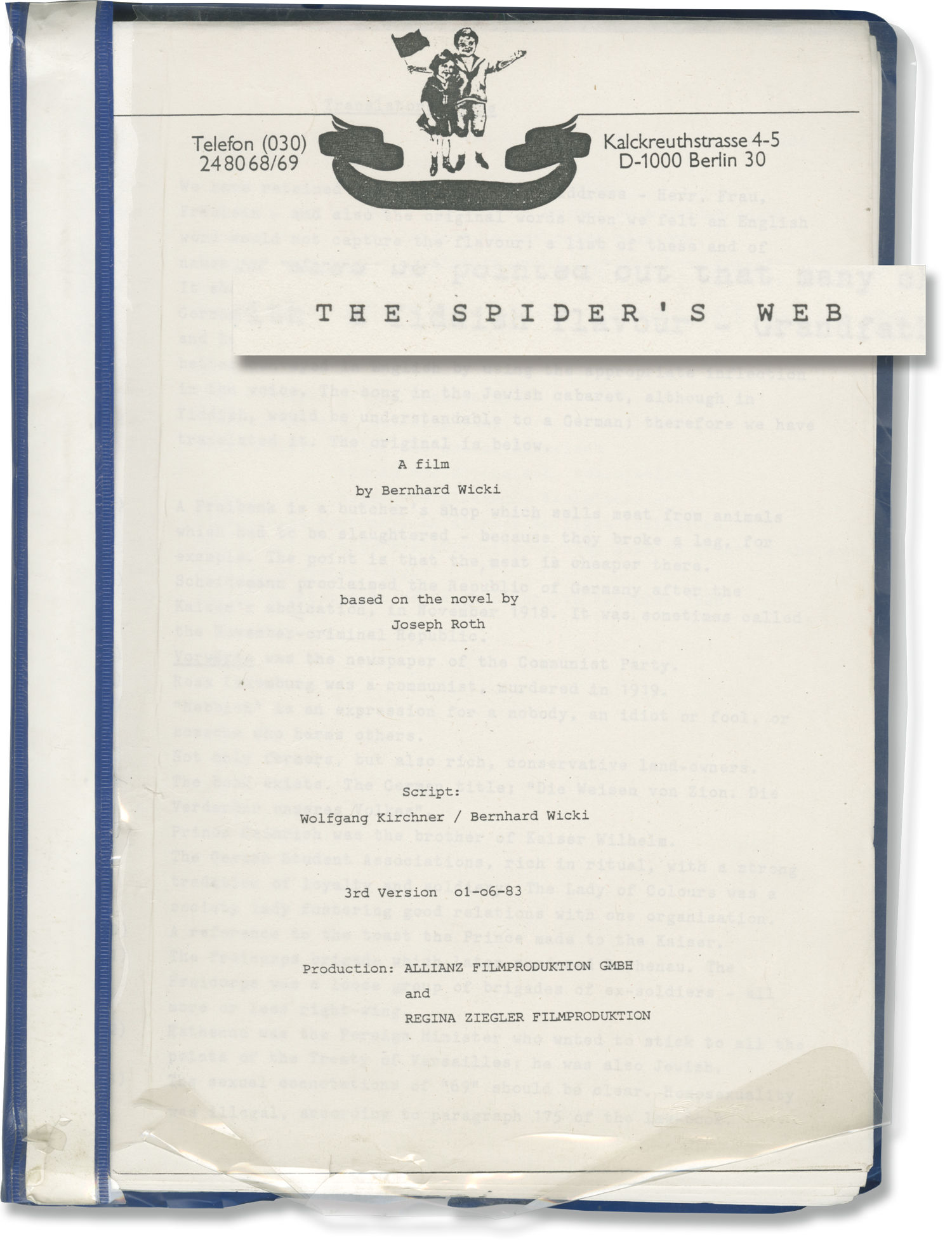 Clear mylar front wrapper, blue rear wrapper. Title page present, dated 01-06-83, noted as 3rd Version, with credits for director Bernhard Wicki, screenwriter Wolfgang Kirchner, and novelist Joseph Roth. 133 leaves, with last page of text numbered 130. Xerographic duplication, rectos only. Pages Very Good plus, wrapper Very Good, bound with two gold brads.