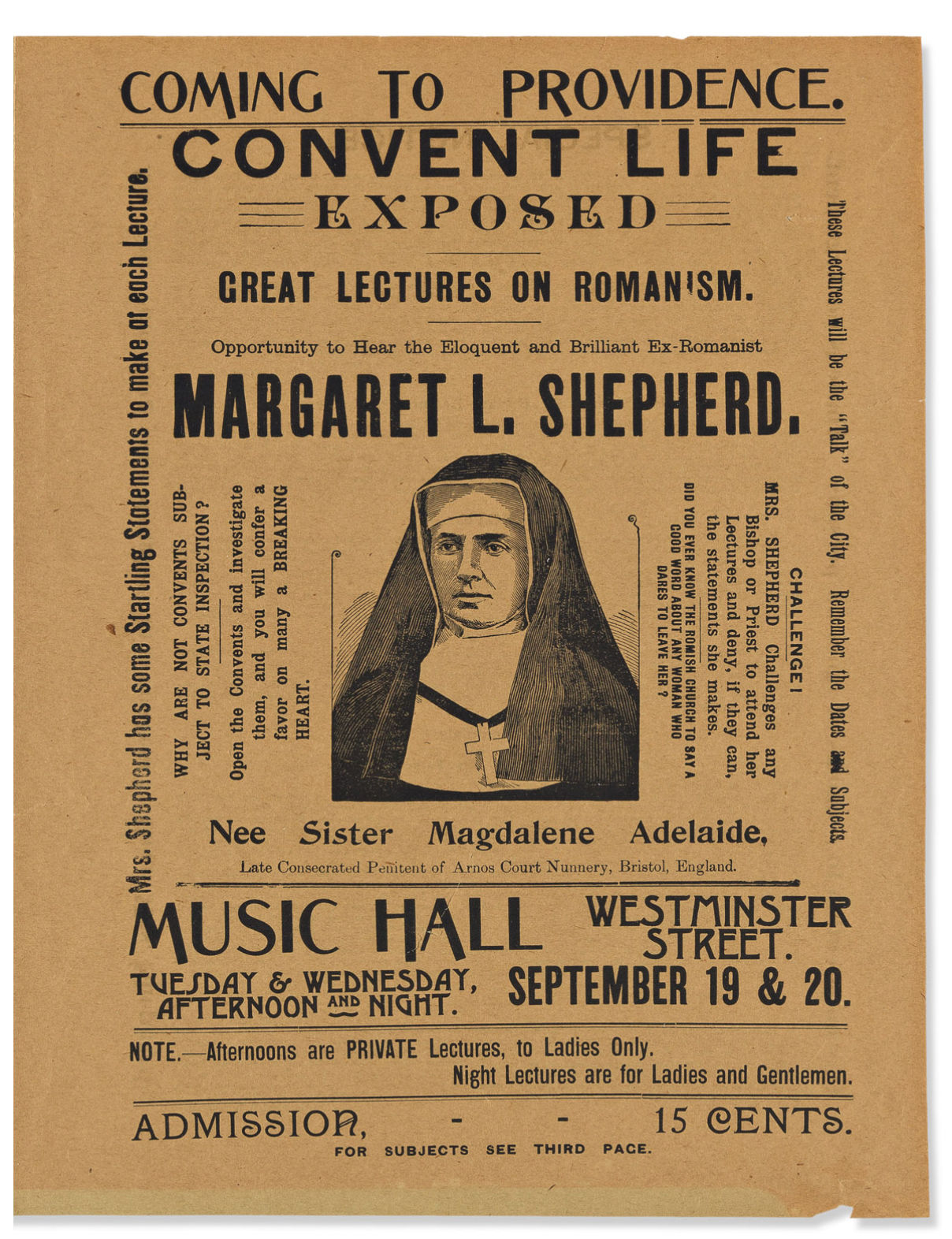 Providence, 1899. First Edition. 4 pages, 12 x 9 1/4 inches, on one folding sheet; thin paper, light chipping at edges. Very Good. A broadside advertising an appearance by Margaret Shepherd, a nativist speaker who passed as an ex-nun, lecturing prolifically on Catholicism and helping fuel nativist sentiment in the years following the publication of her likely fictitious autobiography, My Life in the Convent: Or the Marvellous Personal Experiences of Margaret L. Shepherd (Sister Magdalene Adelaide), Consecrated Penitent of the Arno’s Court Convent, Bristol, England (1893). Anti-Catholic sentiment was a fundamental part of nativist organizations during the period, including the KKK, and Shepherd was one of several “ex-nuns” who lectured on the subject.