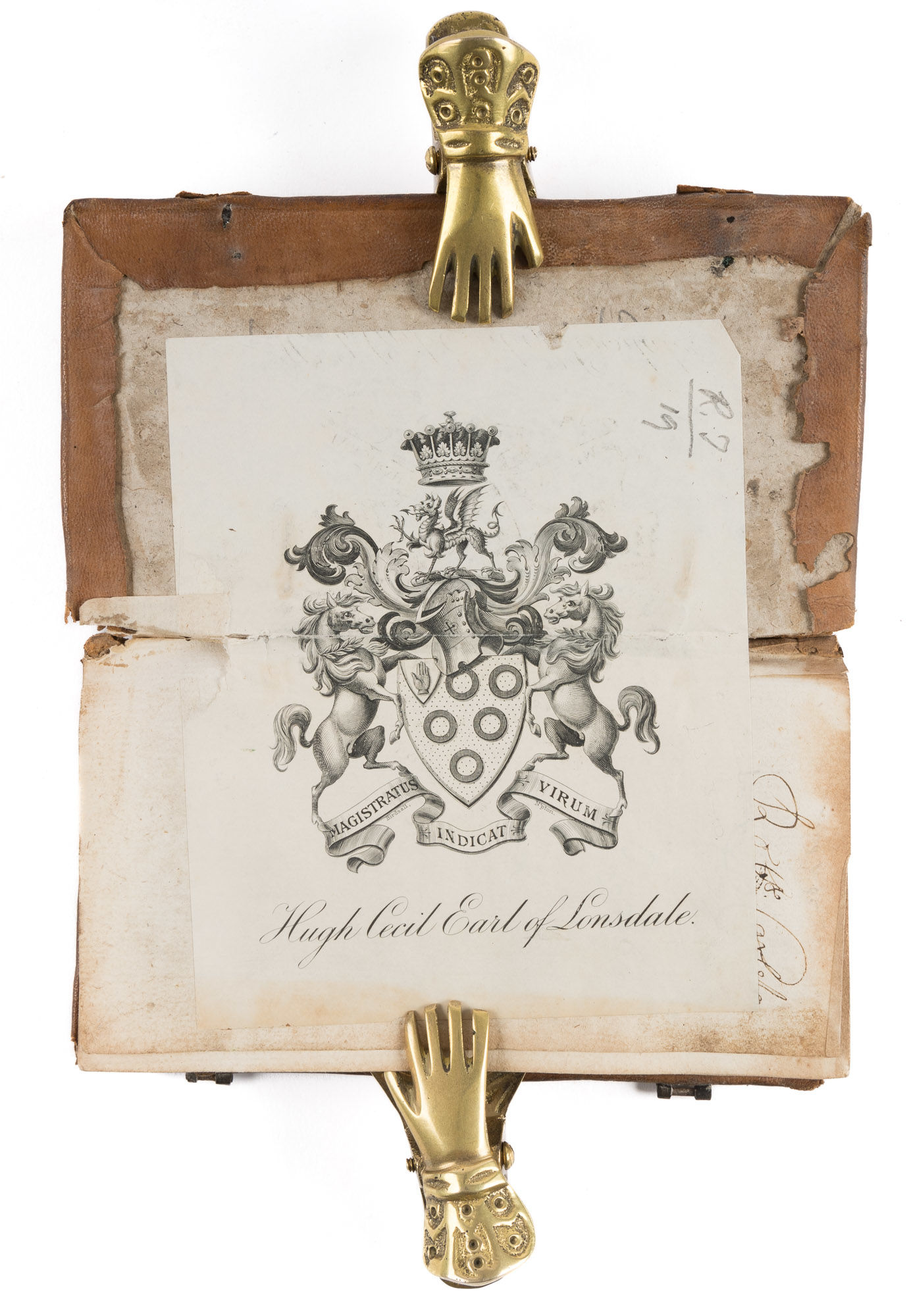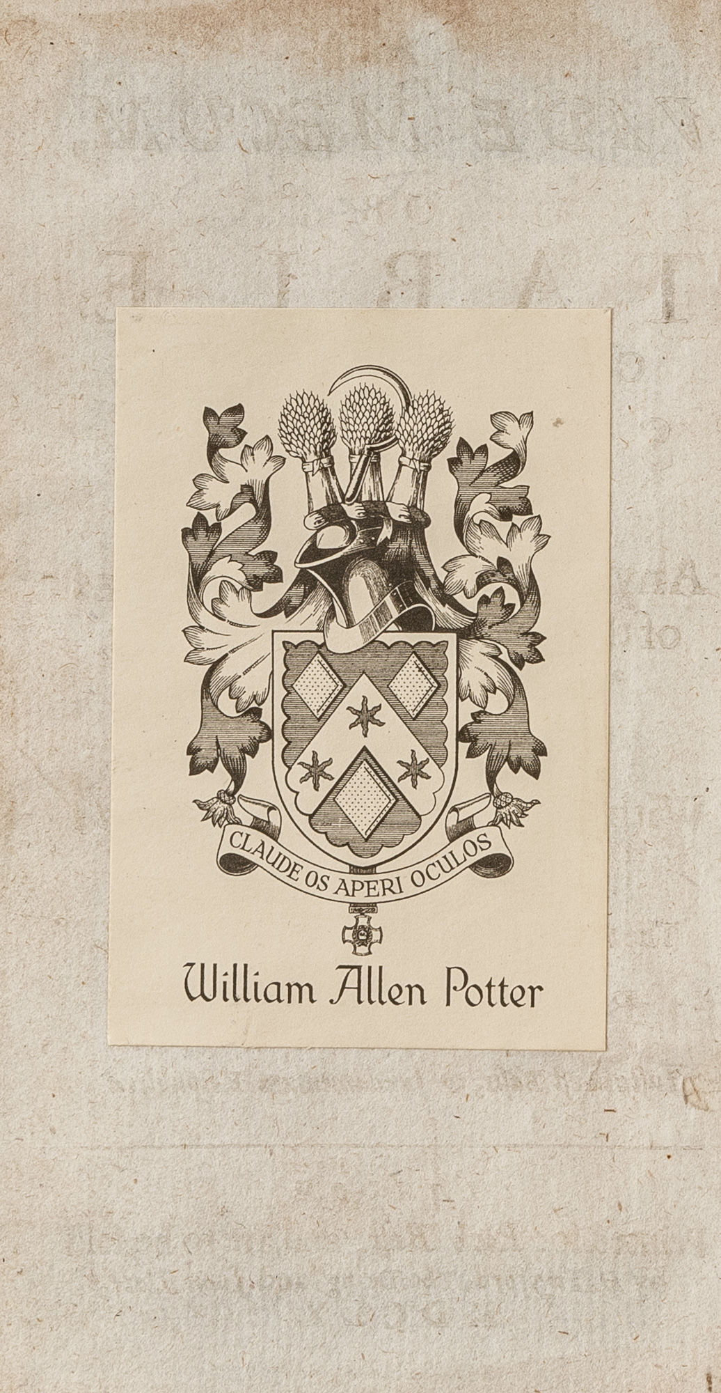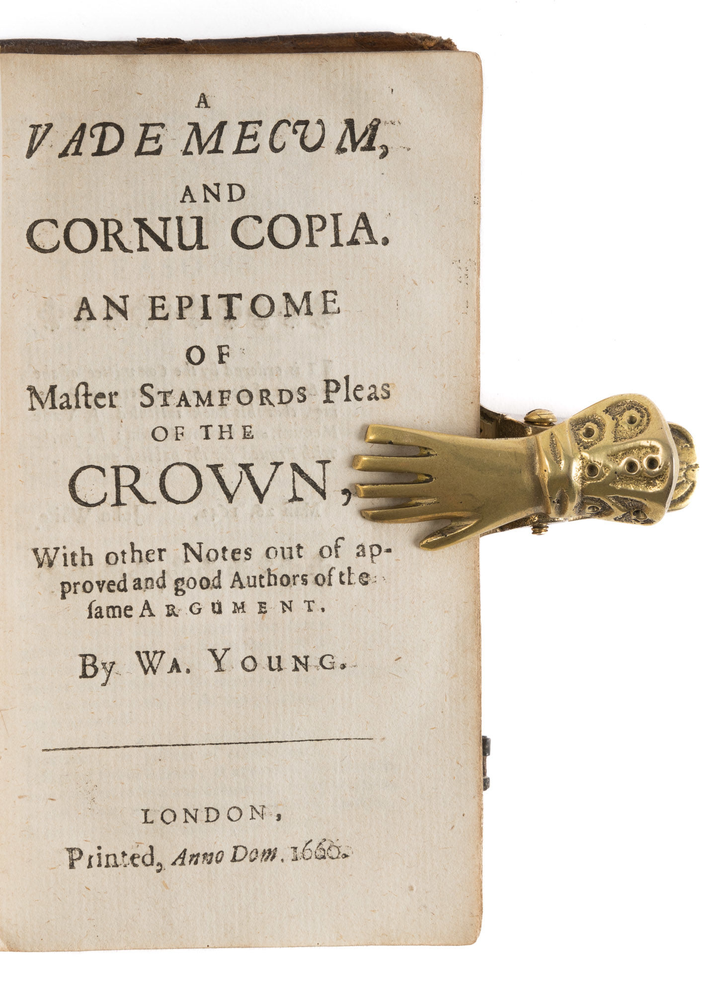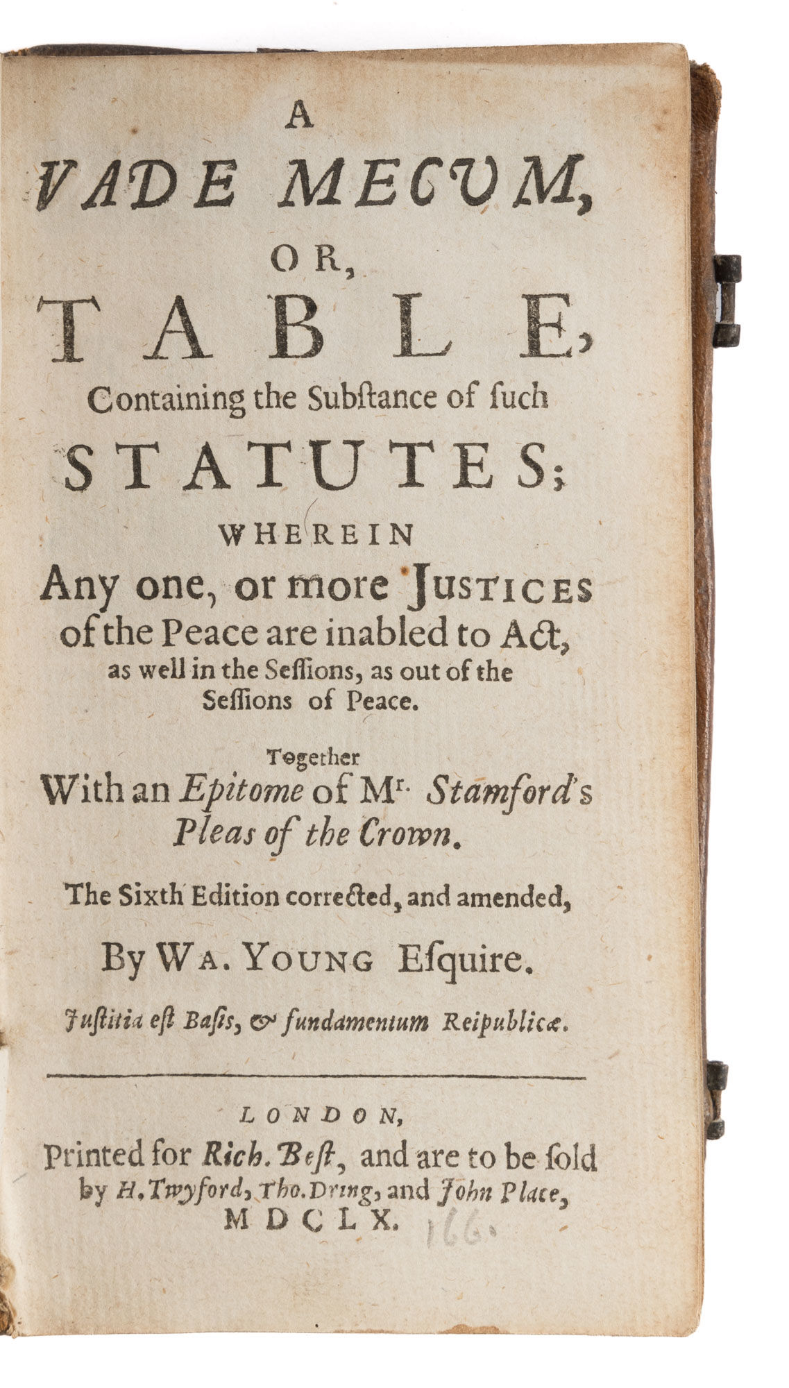 1661. London: Printed for Rich. Best, 1660. London: Printed for Rich. Best, 1660. A Scarce JP Manual Yonge, Walter [1581?-1649]. [Staunford, Sir William (1509-1558)]. A Vade Mecum, Or, Table, Containing the Substance of Such Statutes; Wherein Any One, Or More Justices of the Peace are Inabled to Act, As Well in the Sessions, As Out of the Sessions of Peace. Together with an Epitome of Mr. Stamford's Pleas of the Crown. Corrected, And Amended. London: Printed for Rich. Best, 1660 [i.e. 1661]. [xxiv], 186, [2] pp. First leaf blank. Two parts with continuous pagination. Second part preceded by title page reading (in part) A Vade Mecum, And Cornu Copia. An Epitome of Master Stamfords Pleas of the Crown. 12mo. (5-1/2" x 3"). Contemporary sheep, blind rules to boards, blind fillets to spine, blind tooling to board edges, brass catches to fore-edge of rear board, straps lacking. Light rubbing and a few small stains to boards, chipping to spine ends with large chip to foot of spine, corners bumped and somewhat worn, no pastedowns, binding secured by cords, one of which is broken on rear hinge, armorial bookplate (of Hugh Cecil Lowther) tipped horizontally across inside of front board and first blank leaf, early ownership signature to first blank leaf (of Robert Carleton?, partially obscured by bookplate), early initials "R.C." to rear endleaf, recent bookplate (of William Allen Potter) opposite title page. Light toning to interior, text clean. $1,250. * Sixth (stated) edition. As suggested by its title, this is a manual for justices of the peace. The first part is arranged in tabular form. Each entry lists an offense, conditions for an action, the number of justices required to hear the case, the appropriate punishment and references to authorities. The second part is a condensed version of Staunford's Plees del Coron (1st. ed. 1557), a standard treatise on criminal law in the fifteenth and sixteenth centuries. Published as the sixth edition, it is actually the third. The first, second and fourth were published in 1643, 1650 and 1663. Sweet & Maxwell list a 1620 edition titled Justices, Their Vade Mecum and Cornucopia, but it appears to be a ghost. Hugh Cecil Lowther [1857-1944], 5th Earl of Lonsdale, was a soldier, traveler and passionate sportsman. Lieutenant-Colonel William Allen Potter [1888-1953] was High Sheriff of Nottinghamshire and an important collector of manuals, almanacs and gui.