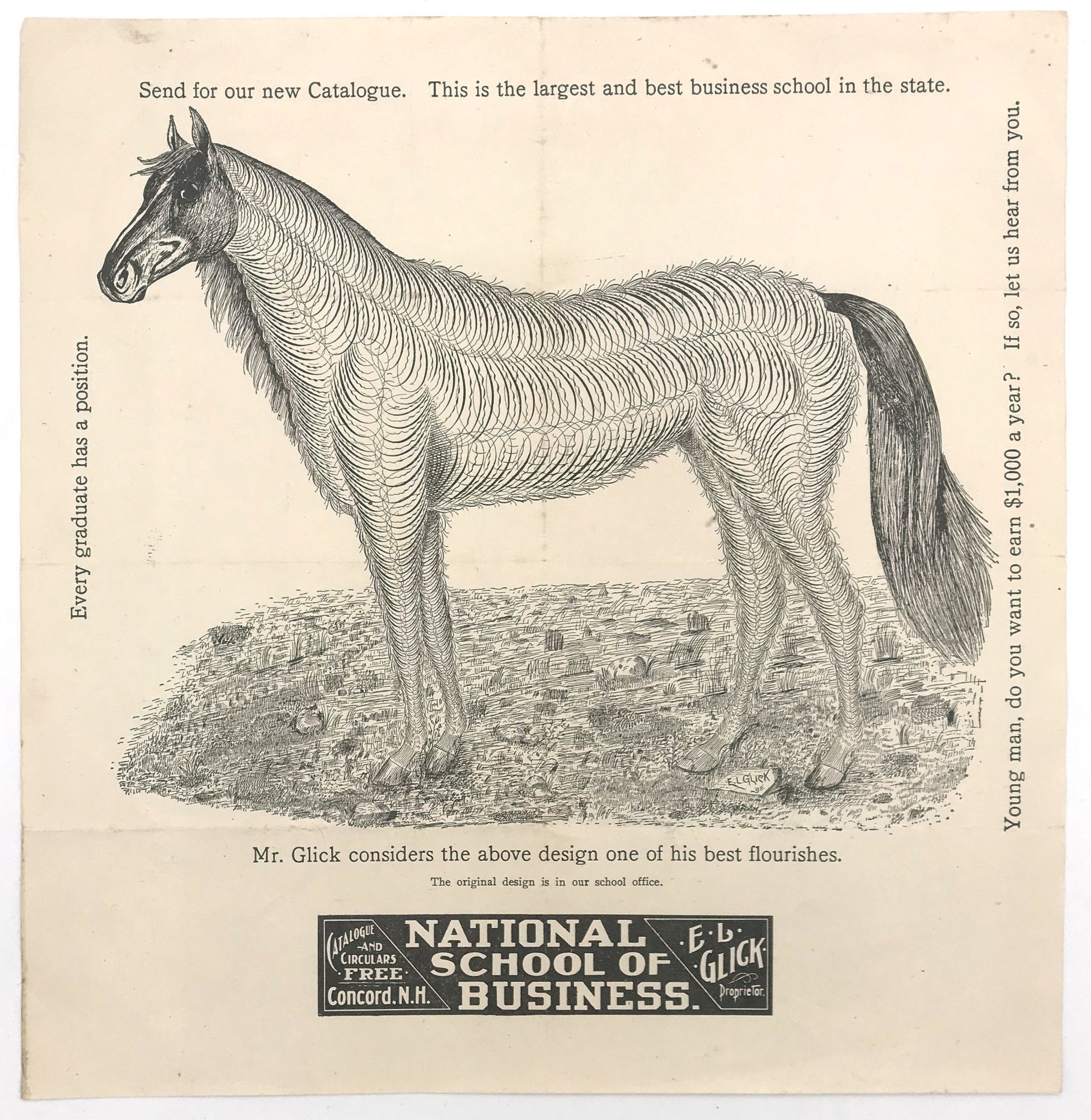 Concord, New Hampshire: National School of Business, 1900. Fine; letter folds.. Printed advertisement for E.L. Glick's National School of Business, with a striking visual: an engraved reproduction of a calligraphic drawing of a horse, made almost entirely of flourishes. Aside from being the proprietor of one of the most successful business schools of the day, Glick (b.1867) was also "a penman of remarkable versatility and skill. The pages of the National Penman, the recognized organ of penmanship in America, has been adorned in successive numbers for many years with Mr. Glick's work, both in handwriting and the more ornate branches of penmanship, and many of the prizes offered by that journal for the finest work in penmanship have fallen into Mr. Glick's hands" (State Builders: An Illustrated Historical and Biographical Record of the State of New Hampshire, p. 375). Measures 9.75" by 9.5"; verso blank.