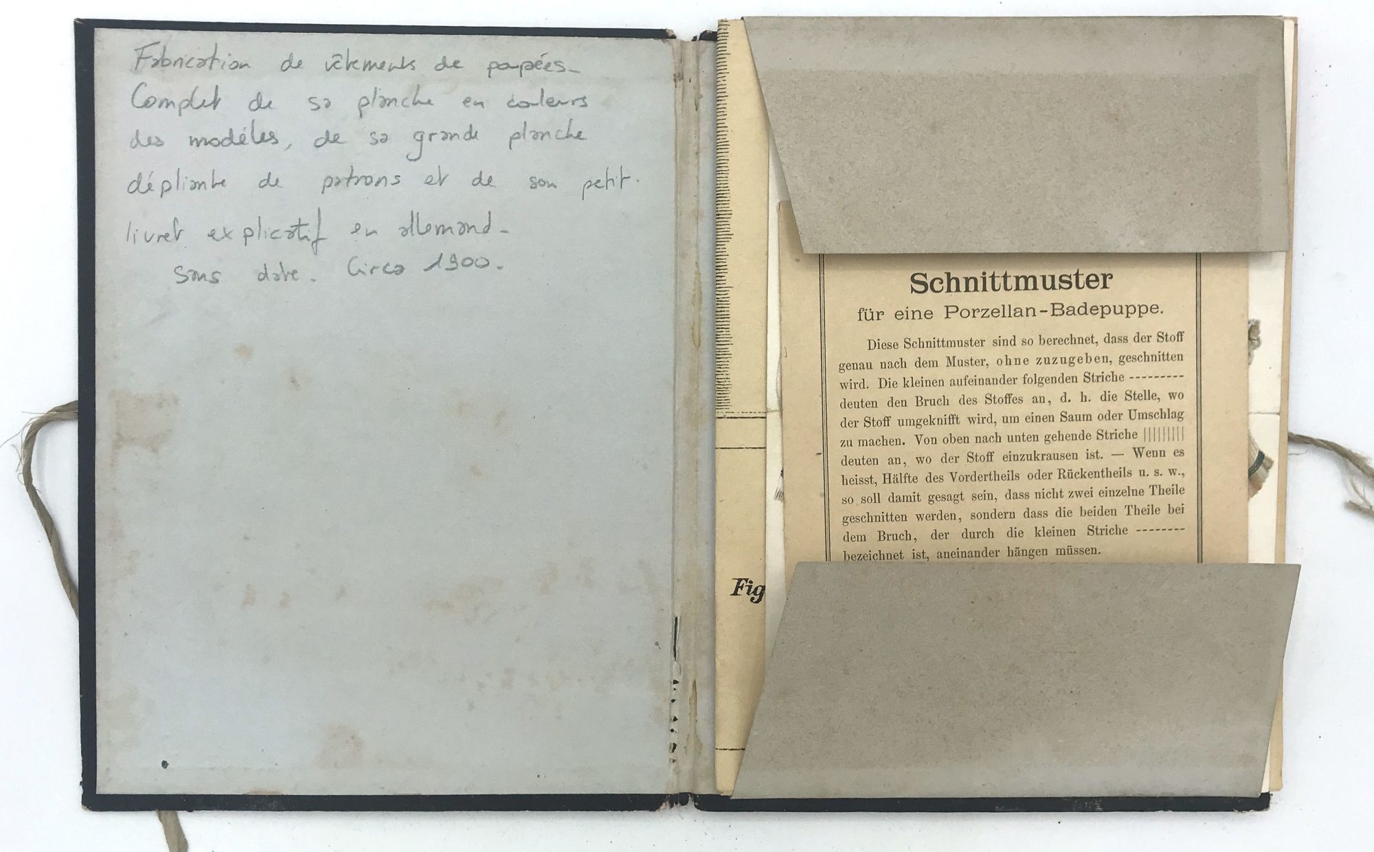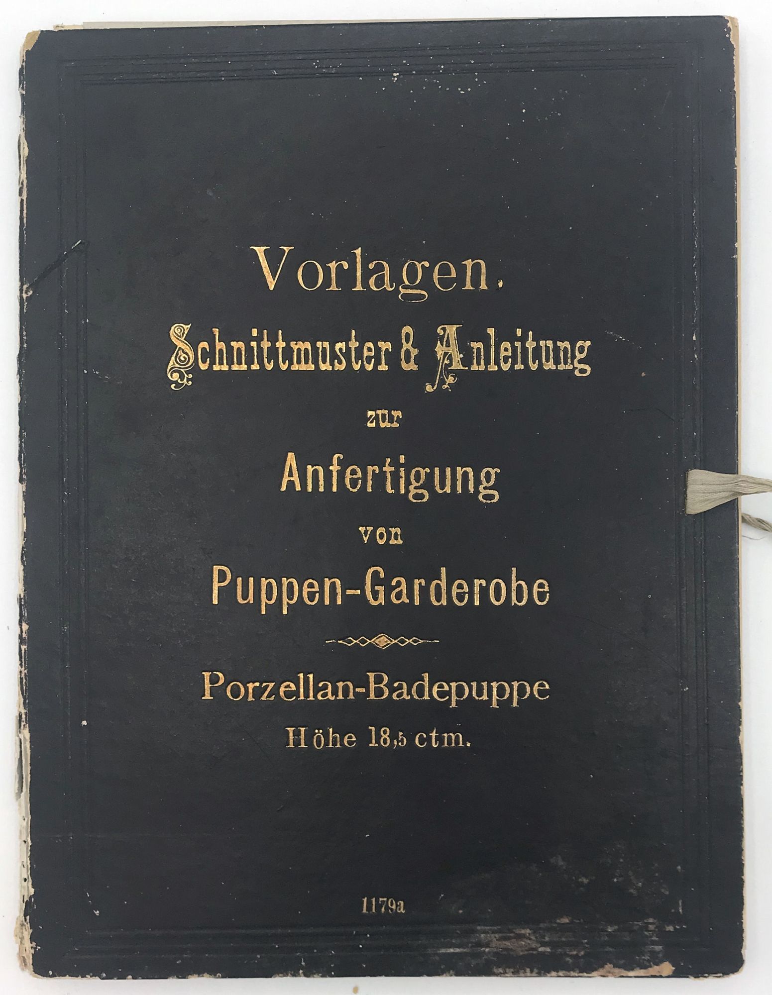 Germany, 1900. Very good to fine. Extremities of portfolio worn, minor toning to paper.. German sewing patterns and instructions for making bathing costumes and accessories for a porcelain doll, housed in the original publisher's portfolio. The contents include: one loose chromolithographed plate with illustrations of the finished garments (7.25" by 5", verso blank); one [4] pp. printed instructions booklet (5.25" by 4.5"); and one large printed sheet of transfer patterns (10.75" by 28"). Housed in original publisher's portfolio with dark navy paper-covered boards stamped in blind and gilt, pale blue silk ties intact.