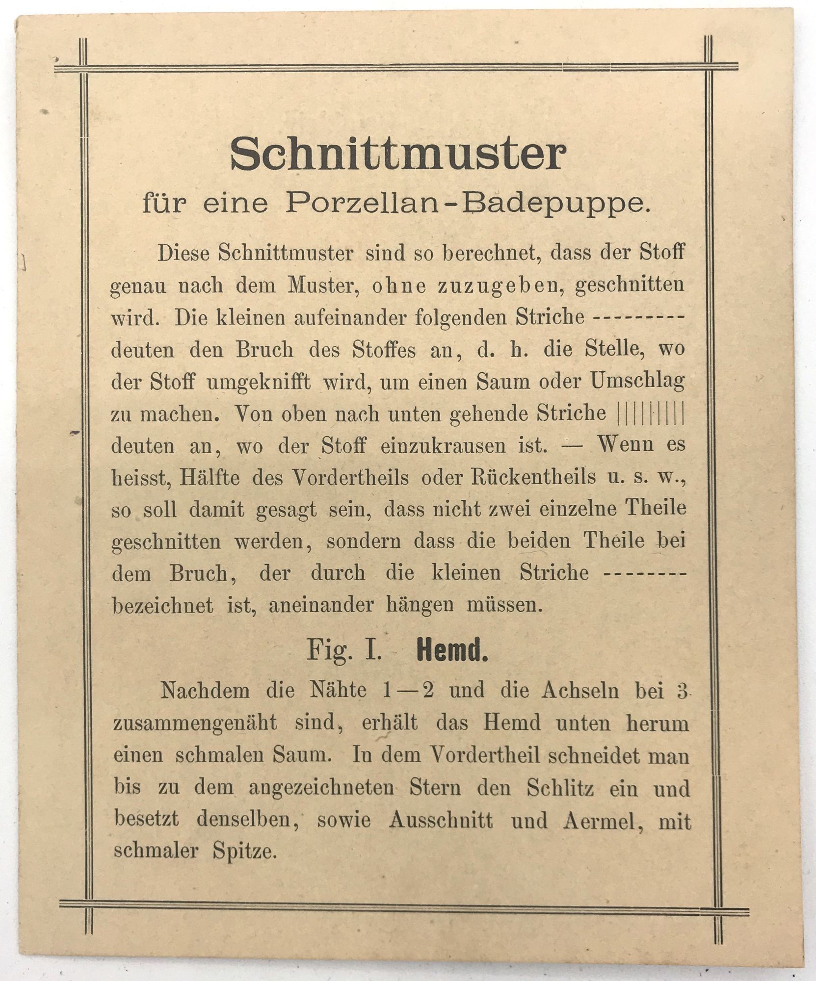 Vorlagen, Schnittmuster & Anleitung zur Anfertigung von Puppen-Garderobe Porzellan-Badepuppe Höhe 18,5 ctm. ("Templates, patterns and instructions for making a doll's wardrobe [for a] Porcelain bathing doll, height 18.5 centimeters.")