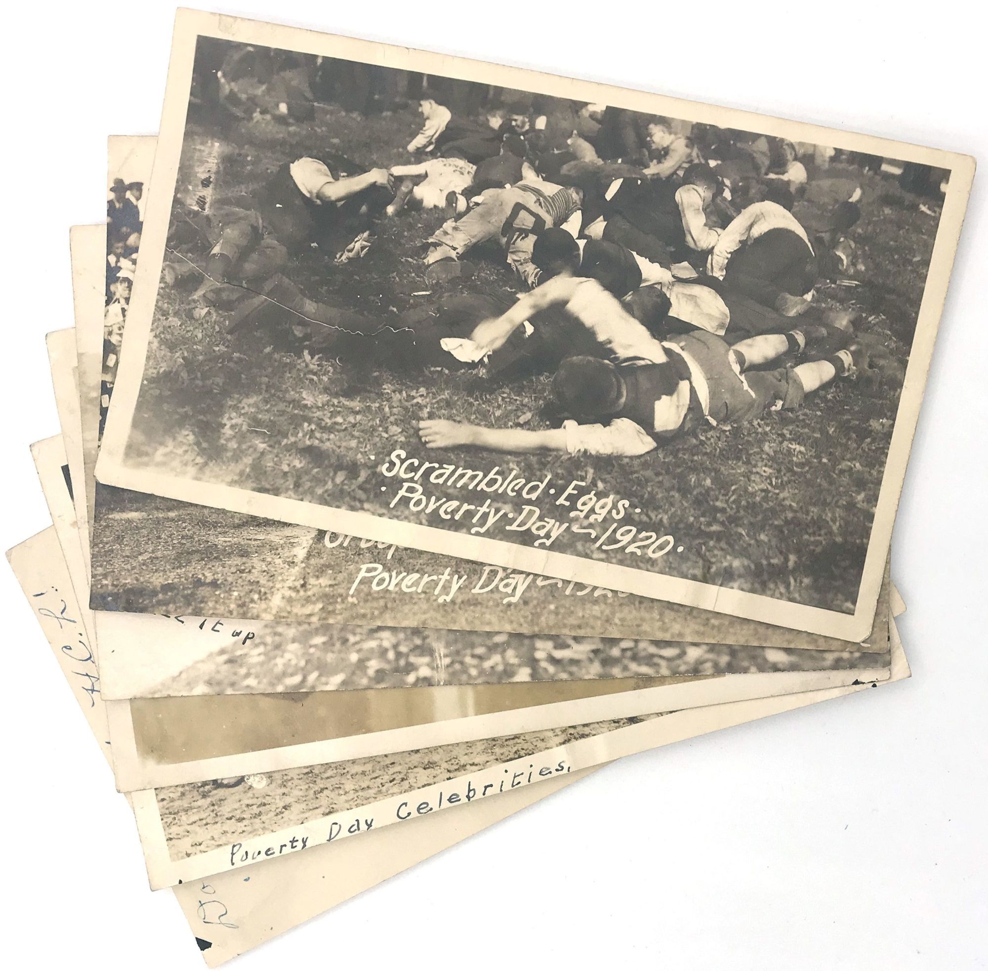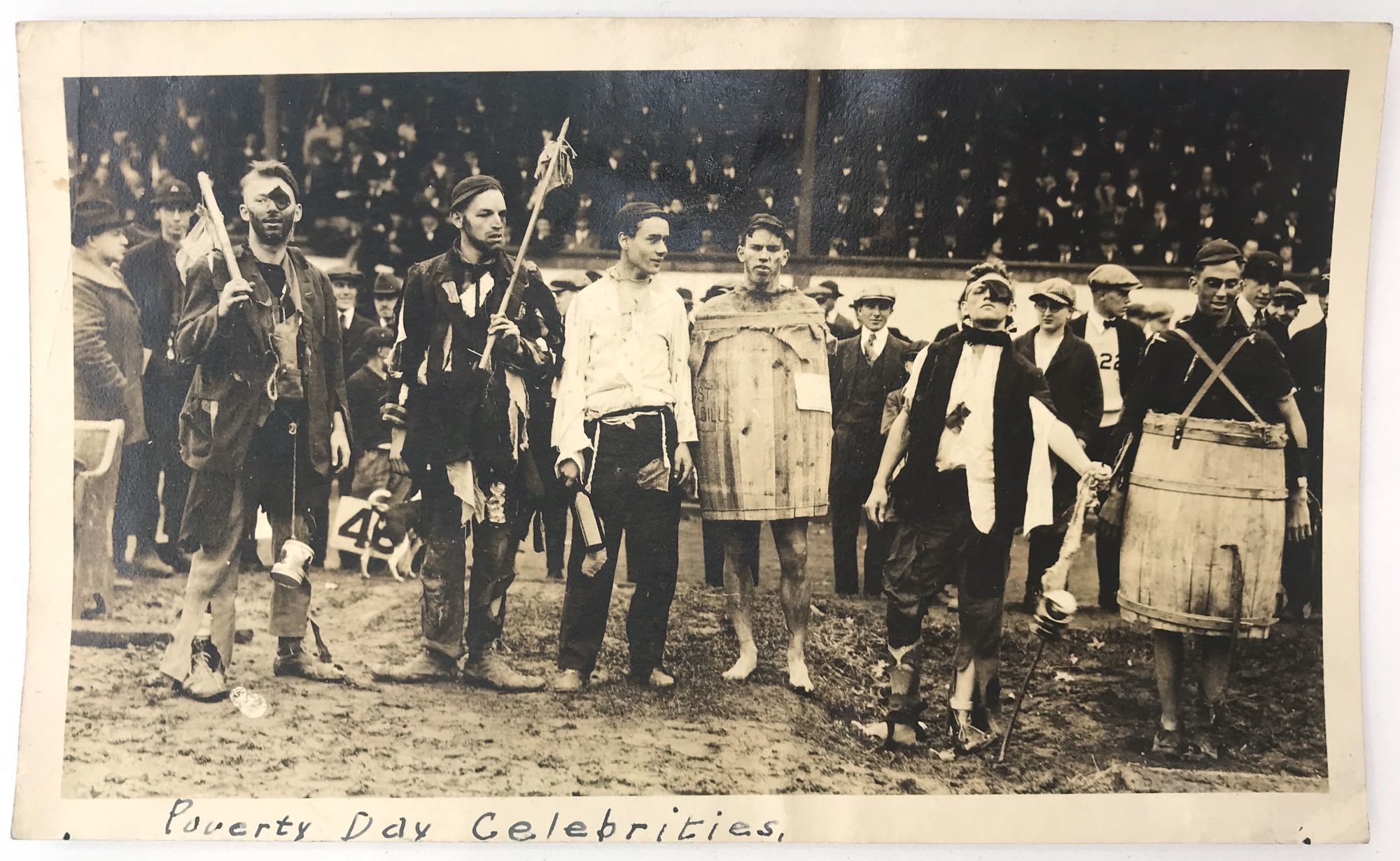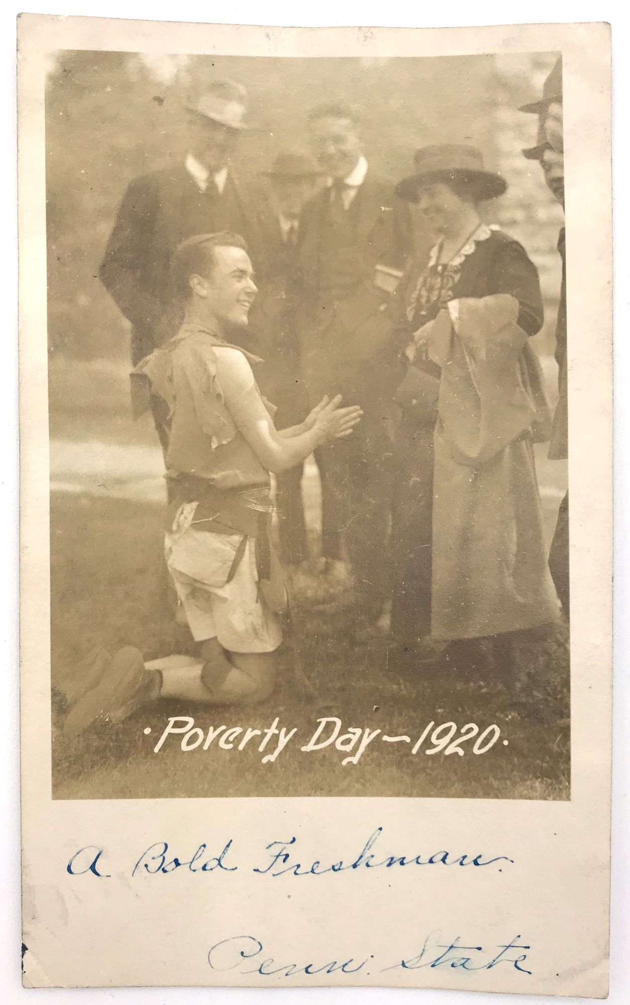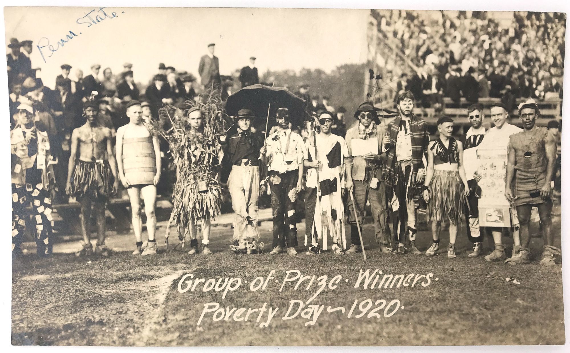 [State College, Pennsylvania], 1920. Poverty Day" was a light-hearted tradition at Penn State University that required incoming freshmen to parade around campus for the day in thread-bare clothing. The present six (6) photographs convey the jovial atmosphere and good times had by all. One photo of Poverty Day 1920 has been captioned in contemporary blue ink, "A Bold Freshman"; it shows a cheeky young man in Poverty Day dress panhandling amongst a group of what appears to be faculty or administrators. Students are shown leap frogging around campus, piled atop each other as "scrambled eggs", and parading in front of what appears to be a school-wide assembly. A couple of the photos have pencil inscriptions on their versos: "Penn State fashion parade a great success. A great variety of gowns were displayed. Many people think the [venue] is a little too well ventilated for fall wear. But no matter how fastidious ones tastes may be, they were sure to have them met."