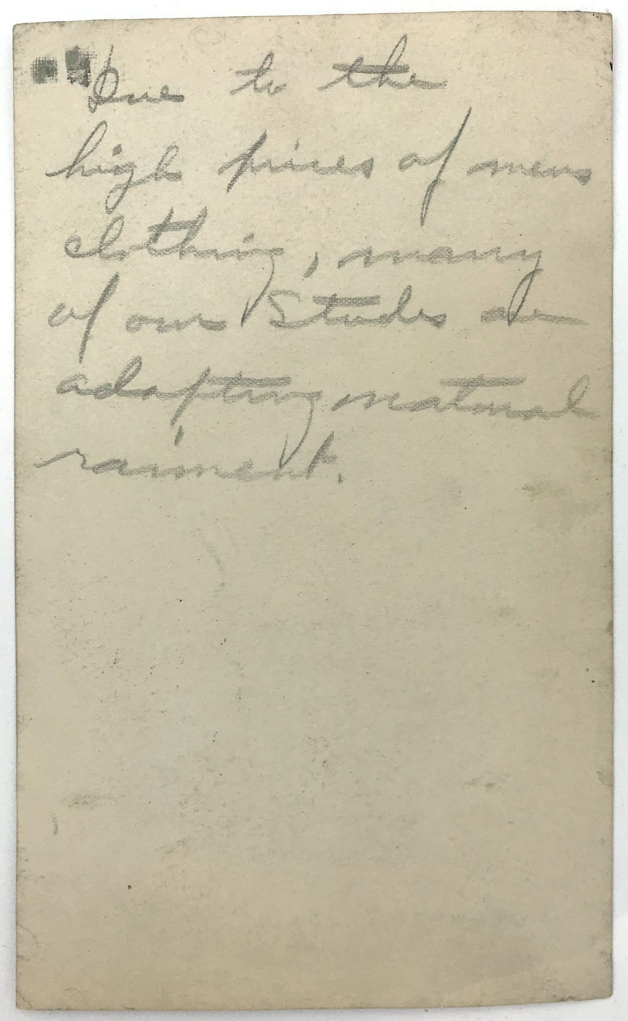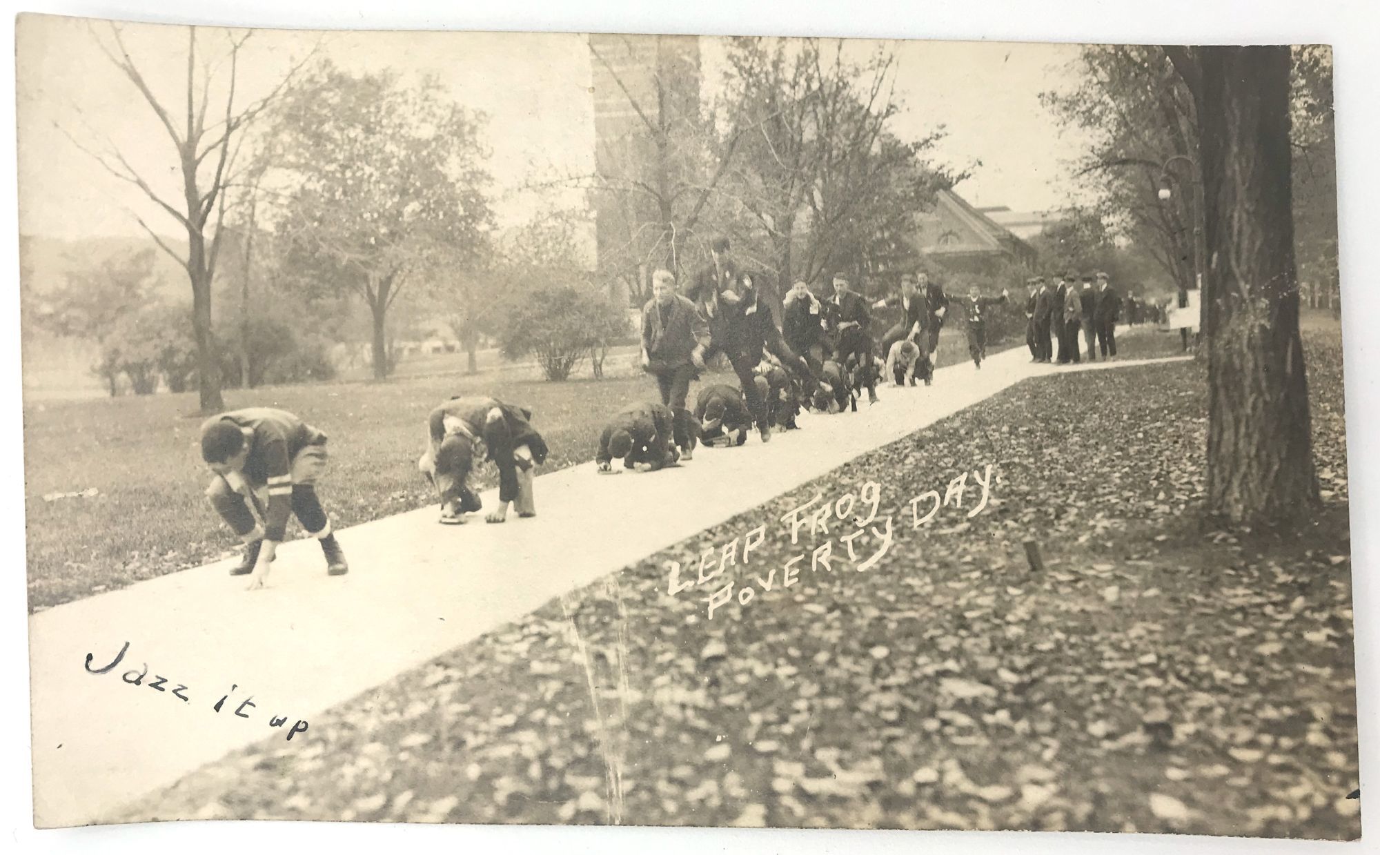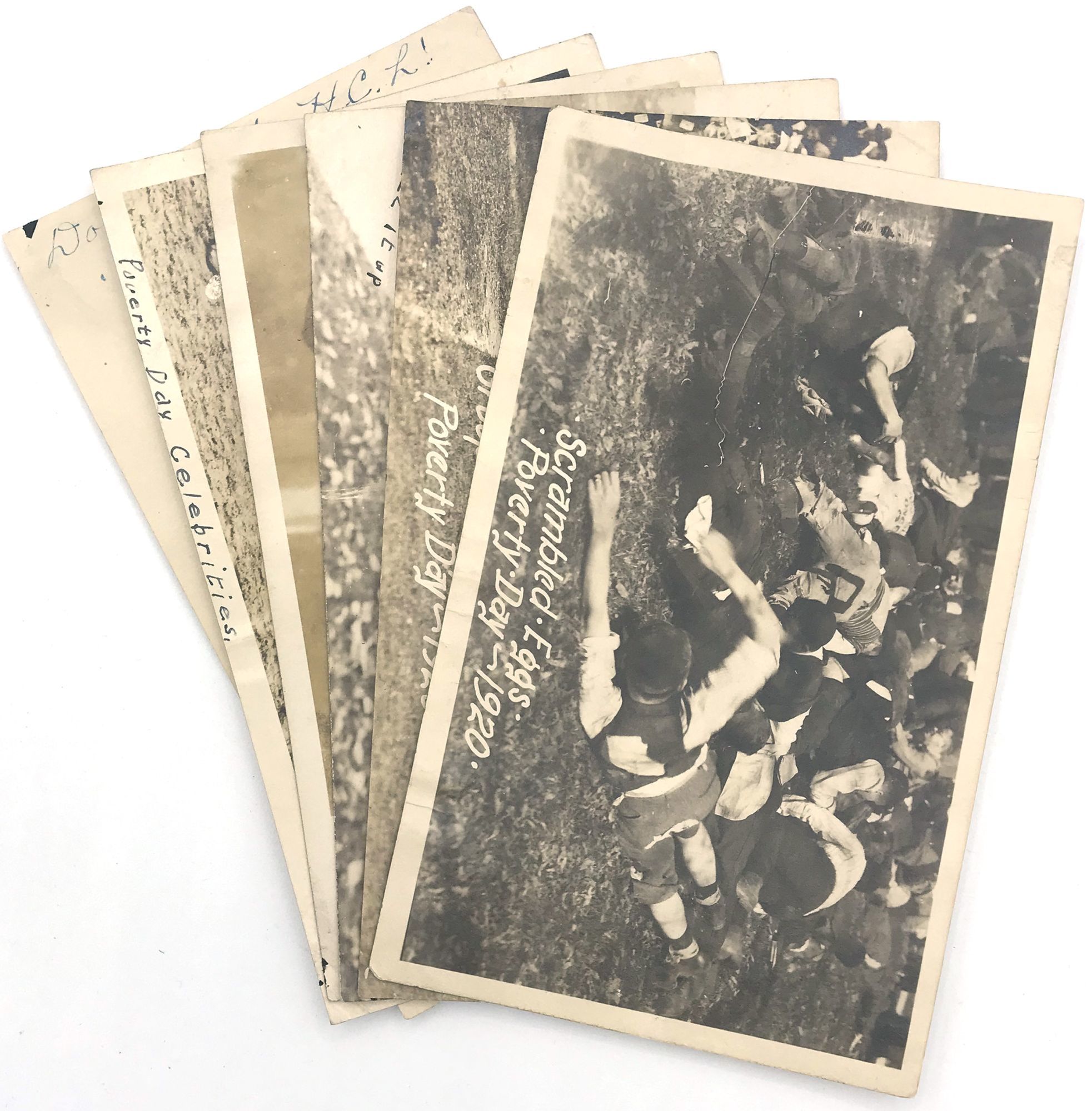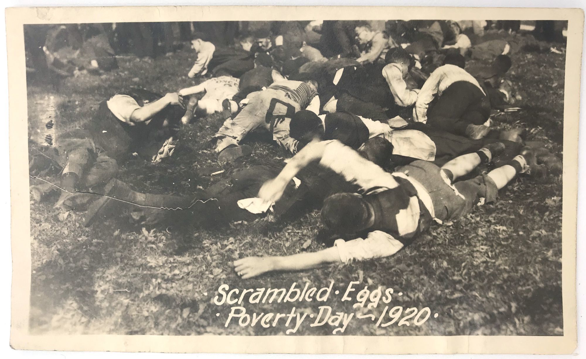 [State College, Pennsylvania], 1920. Poverty Day" was a light-hearted tradition at Penn State University that required incoming freshmen to parade around campus for the day in thread-bare clothing. The present six (6) photographs convey the jovial atmosphere and good times had by all. One photo of Poverty Day 1920 has been captioned in contemporary blue ink, "A Bold Freshman"; it shows a cheeky young man in Poverty Day dress panhandling amongst a group of what appears to be faculty or administrators. Students are shown leap frogging around campus, piled atop each other as "scrambled eggs", and parading in front of what appears to be a school-wide assembly. A couple of the photos have pencil inscriptions on their versos: "Penn State fashion parade a great success. A great variety of gowns were displayed. Many people think the [venue] is a little too well ventilated for fall wear. But no matter how fastidious ones tastes may be, they were sure to have them met."