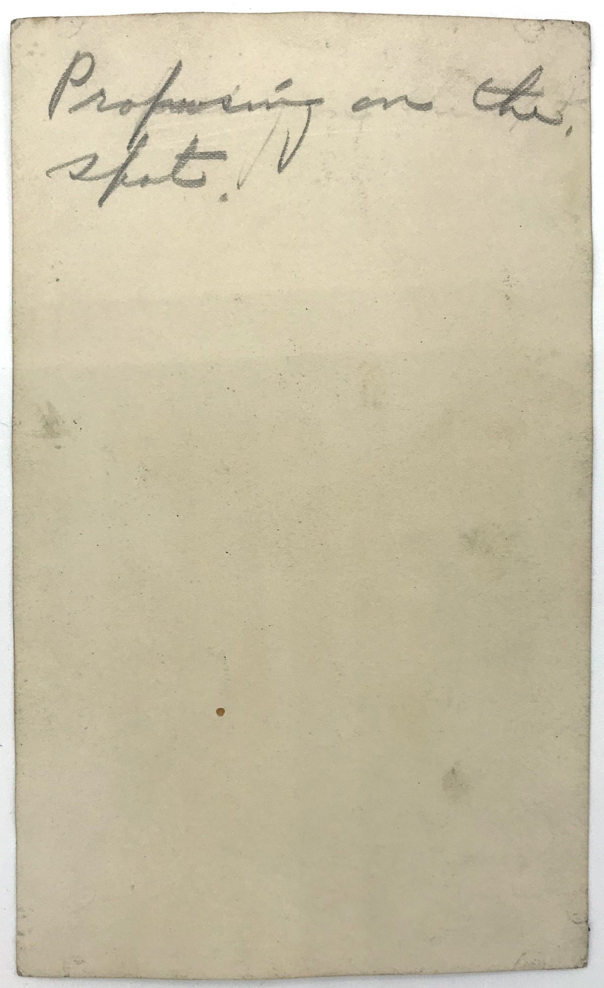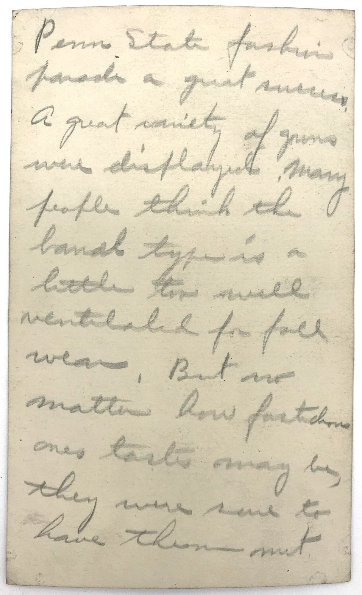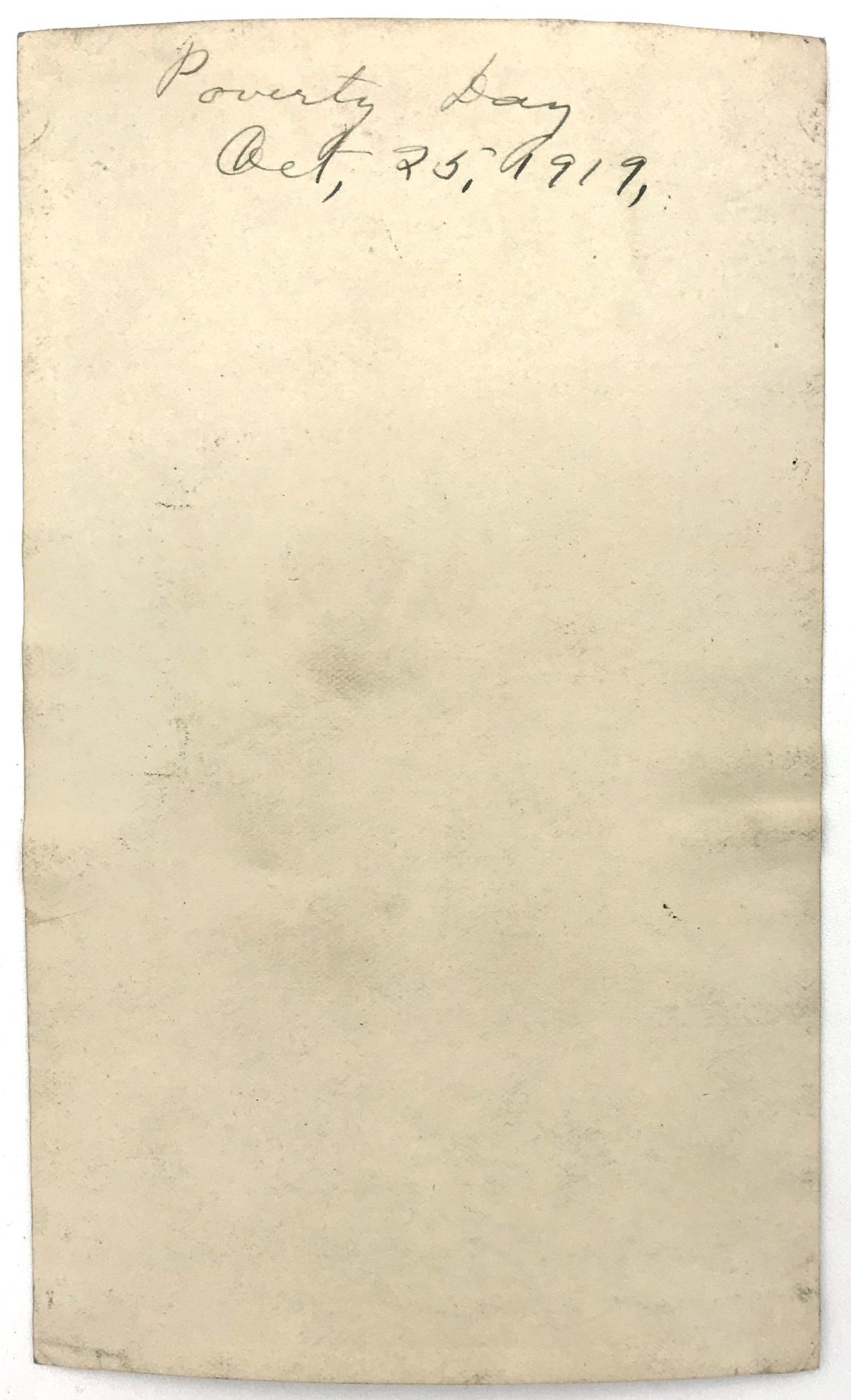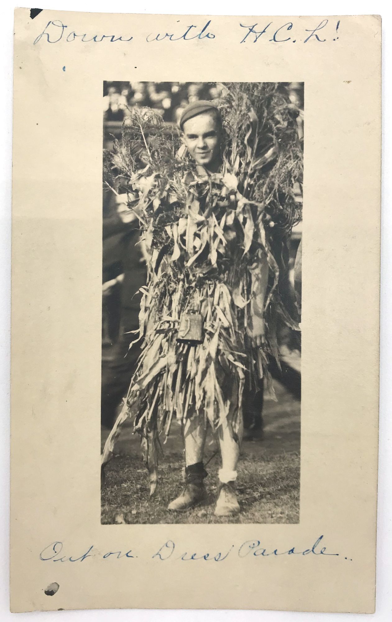 [State College, Pennsylvania], 1920. Poverty Day" was a light-hearted tradition at Penn State University that required incoming freshmen to parade around campus for the day in thread-bare clothing. The present six (6) photographs convey the jovial atmosphere and good times had by all. One photo of Poverty Day 1920 has been captioned in contemporary blue ink, "A Bold Freshman"; it shows a cheeky young man in Poverty Day dress panhandling amongst a group of what appears to be faculty or administrators. Students are shown leap frogging around campus, piled atop each other as "scrambled eggs", and parading in front of what appears to be a school-wide assembly. A couple of the photos have pencil inscriptions on their versos: "Penn State fashion parade a great success. A great variety of gowns were displayed. Many people think the [venue] is a little too well ventilated for fall wear. But no matter how fastidious ones tastes may be, they were sure to have them met."