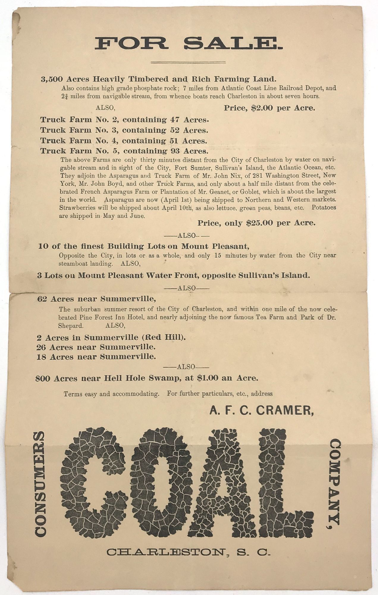 Charleston, South Carolina: Consumers Coal Company, 1890. Very good to fine. Letter folds. 1-inch short tear to left-hand margin.. Printed broadside advertising large swaths of farm land for sale in South Carolina by Consumers Coal Company, with a quirky typographical inclusion: the word "coal" has been designed out of small coal-like black shapes. Prices for parcels ranged from $2 to $25 per acre.