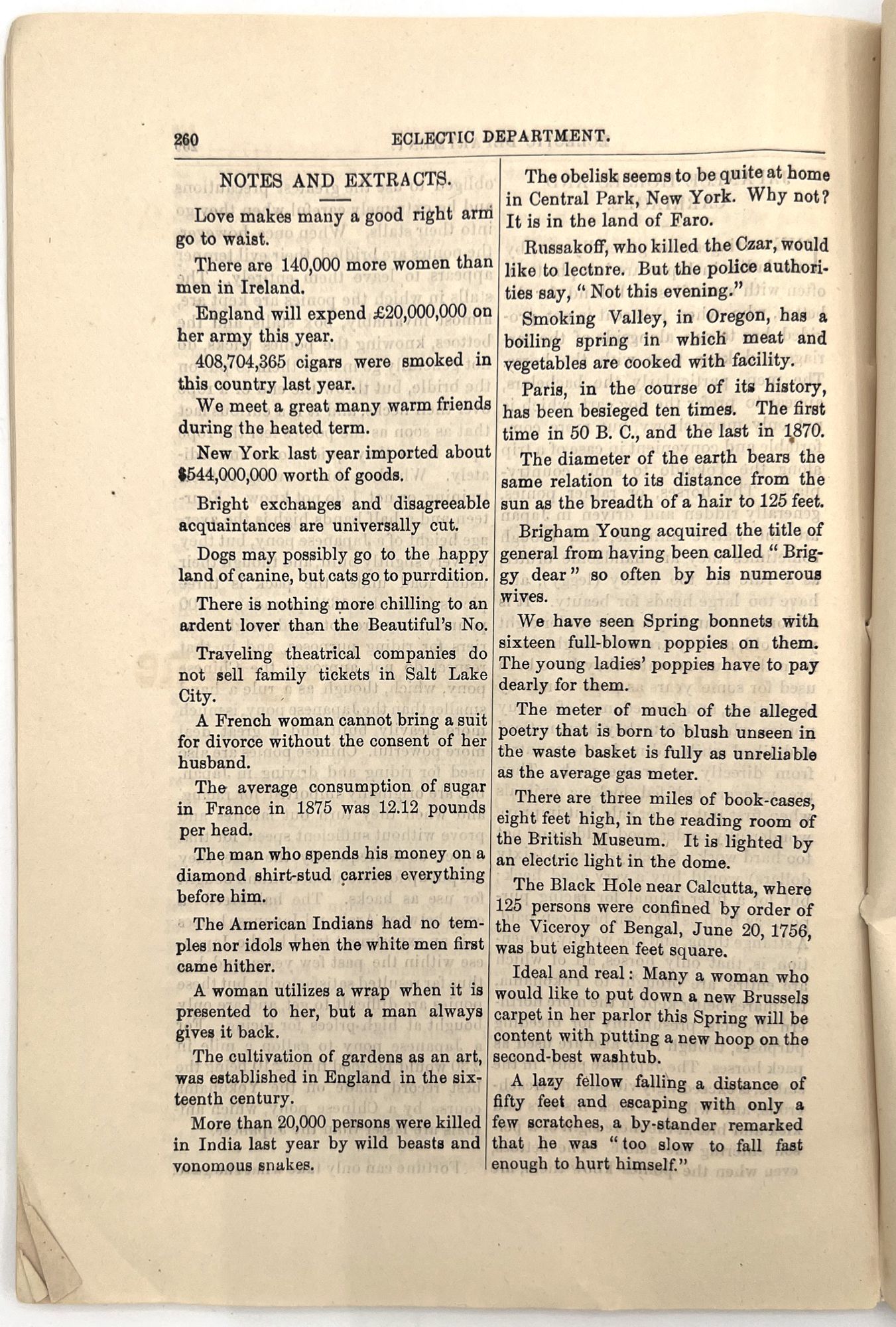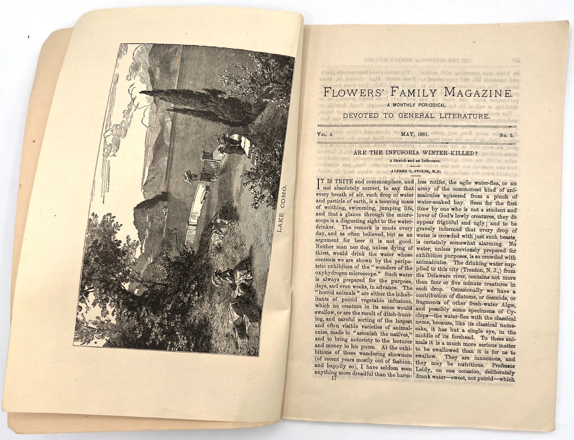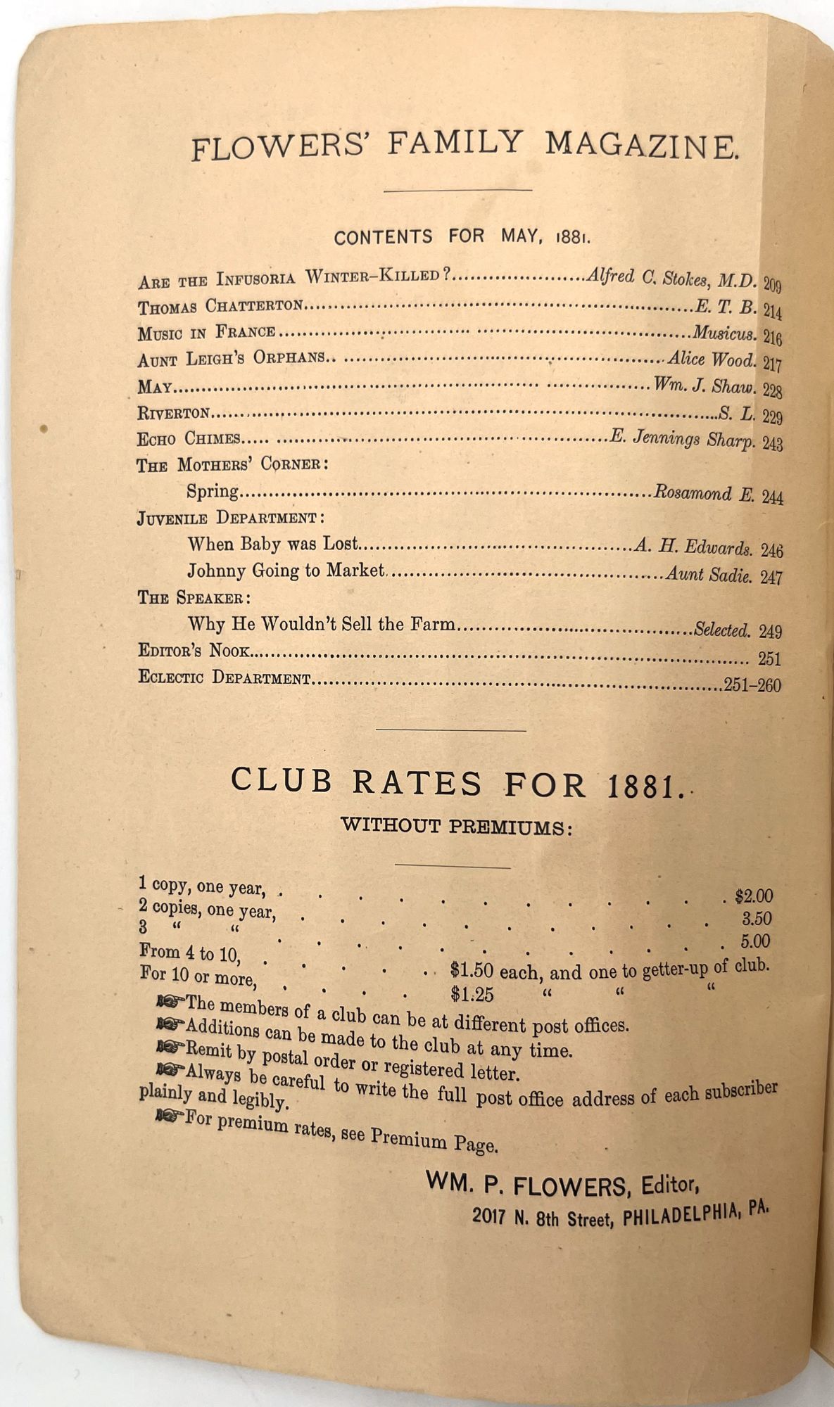 Philadelphia, Pennsylvania, 1881. Very good. Toned. Minor staining to lower right-hand corner of upper wrapper.. A monthly periodical published with content for the whole family, including a charming "Juvenile Department" with stories for children. This particular issue is of note for an article that mentions "animalcules", an early conception of microorganisms, and explores their role in the potability of water ("Are the Infusoria Winter-Killed?"). Also includes a biographical sketch of the poet Thomas Chatterton (1752-1770), a Sentimental story ("Aunt Leigh's Orphans"), and "The Mother's Corner", which offers housekeeping and gardening advice. The "Eclectic Department" in the rear delivers on its promise, offering articles on the Edelweiss flower, pig raising, life among the Jesuits, and "Japanese Horses and Carriages". 8vo (9.75" by 6.5"), pp. [3], 210-260, [4], in original printed light peach-colored wrappers.