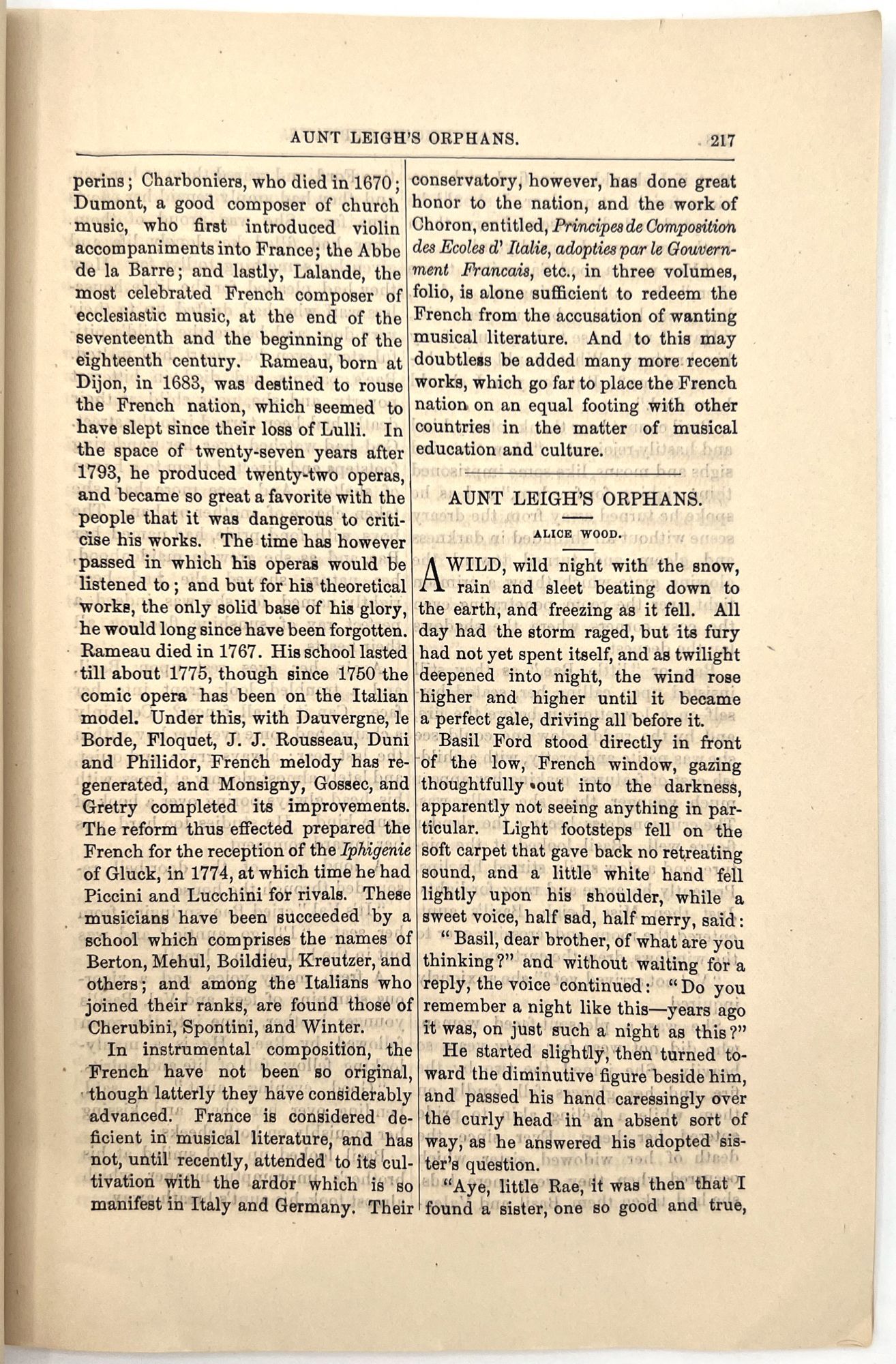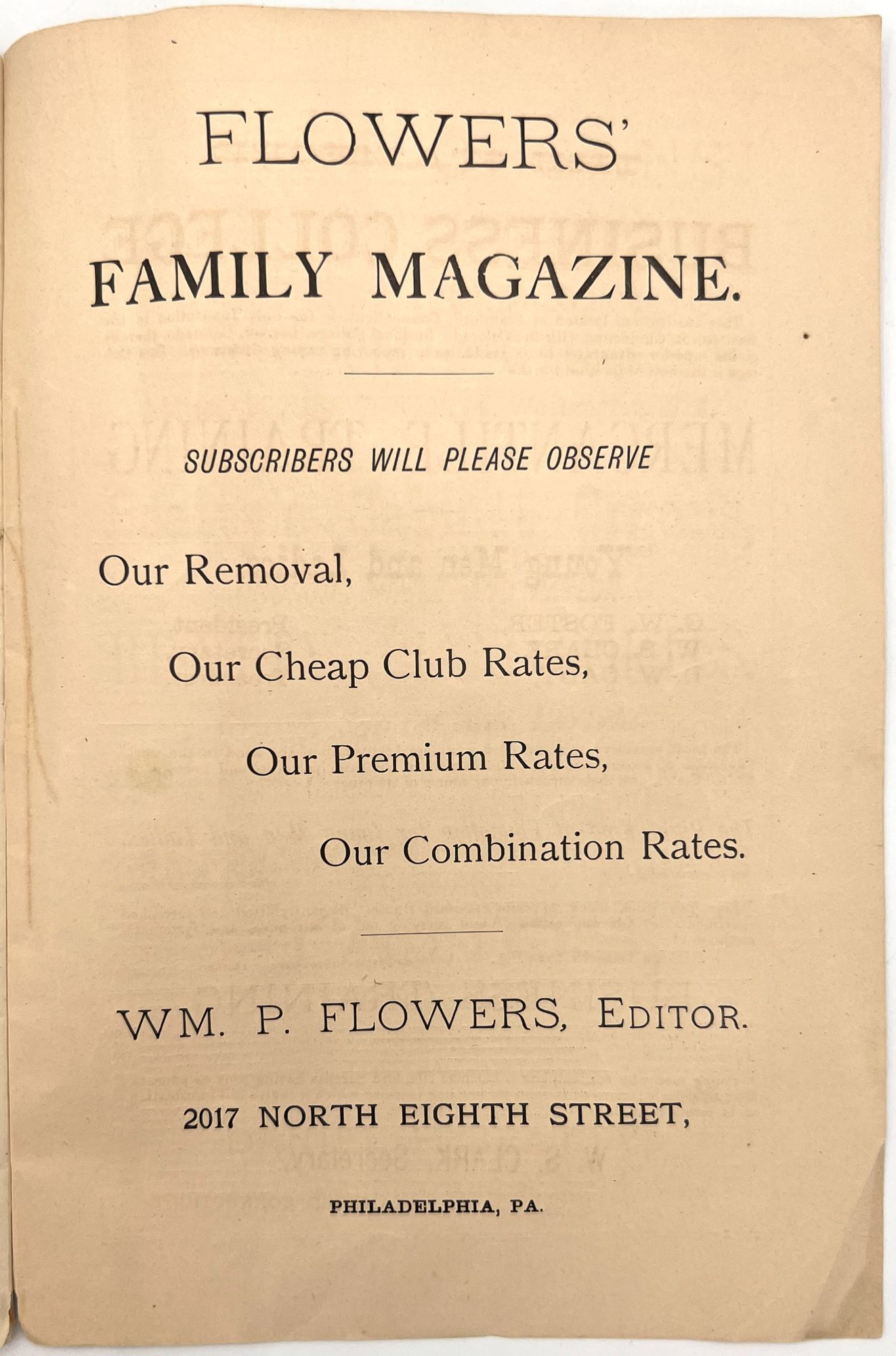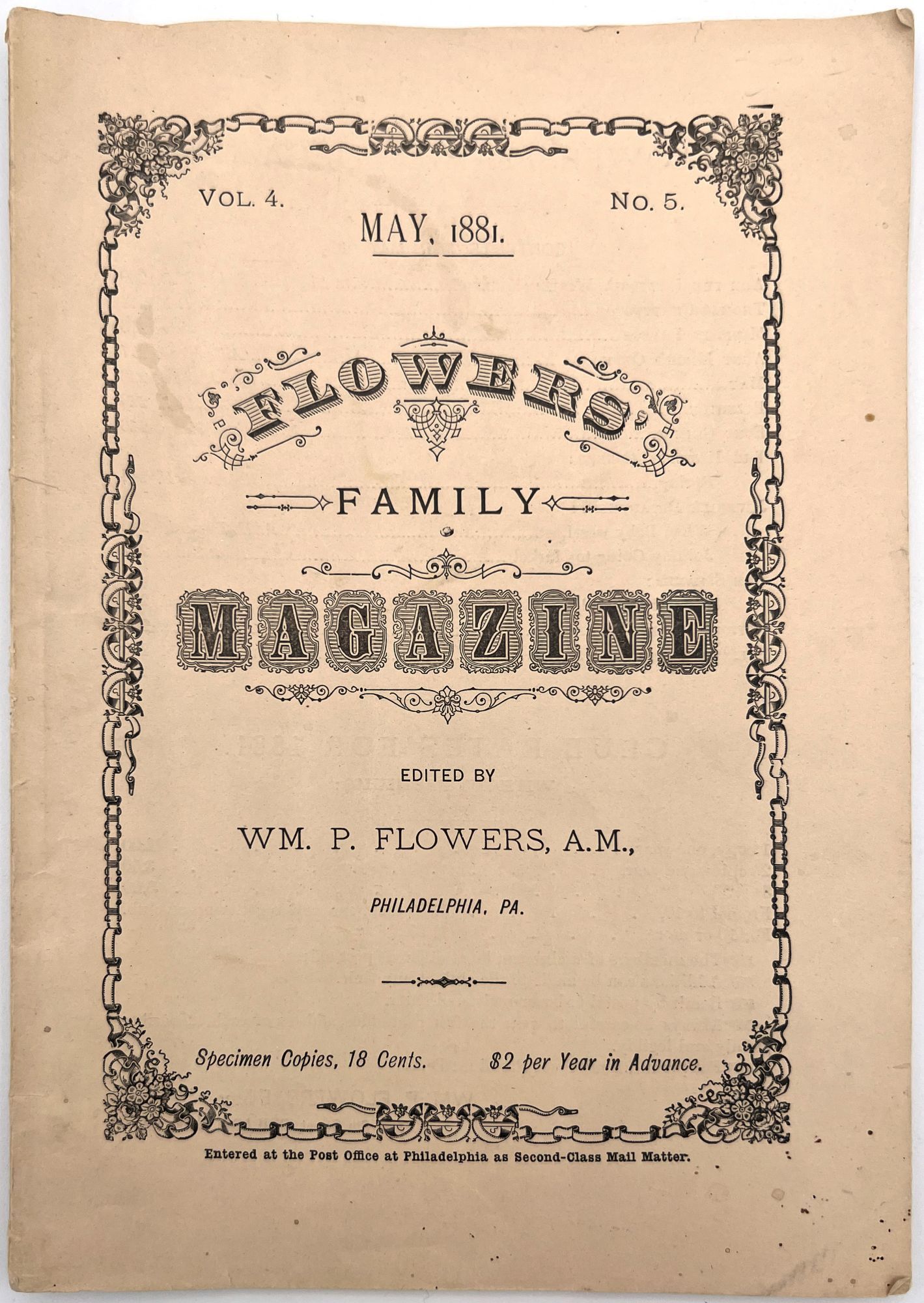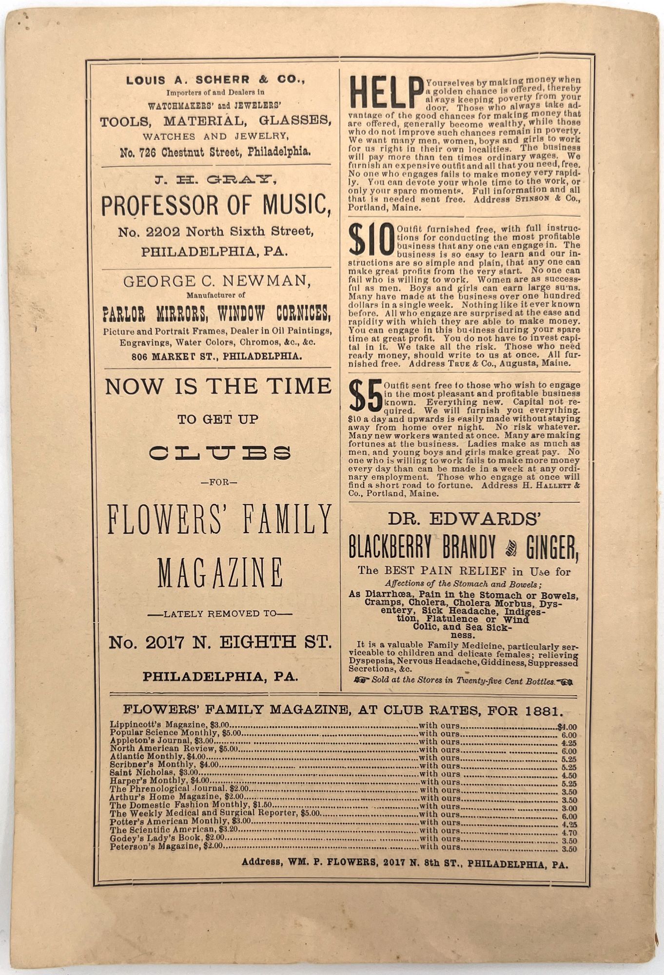 Philadelphia, Pennsylvania, 1881. Very good. Toned. Minor staining to lower right-hand corner of upper wrapper.. A monthly periodical published with content for the whole family, including a charming "Juvenile Department" with stories for children. This particular issue is of note for an article that mentions "animalcules", an early conception of microorganisms, and explores their role in the potability of water ("Are the Infusoria Winter-Killed?"). Also includes a biographical sketch of the poet Thomas Chatterton (1752-1770), a Sentimental story ("Aunt Leigh's Orphans"), and "The Mother's Corner", which offers housekeeping and gardening advice. The "Eclectic Department" in the rear delivers on its promise, offering articles on the Edelweiss flower, pig raising, life among the Jesuits, and "Japanese Horses and Carriages". 8vo (9.75" by 6.5"), pp. [3], 210-260, [4], in original printed light peach-colored wrappers.