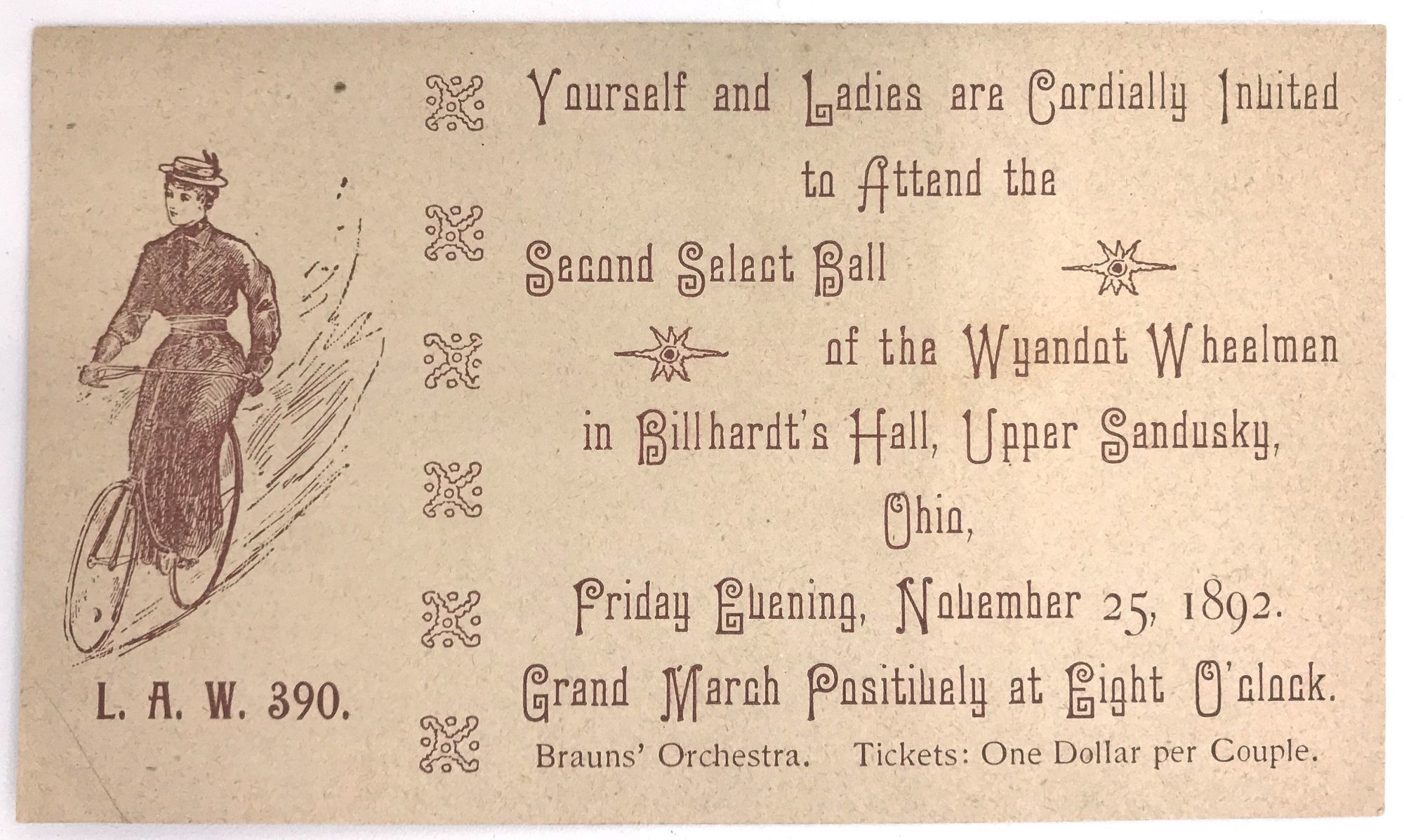 Upper Sandusky, Ohio: Wyandot Wheelmen, 1892. Fine. Lightly toned.. The Wyandot Wheelmen was a jovial group of cycling enthusiasts that hosted events for fellow bicyclists and their families. The present invitation invites "Yourself and Ladies" to their Second Select Ball, which featured a "Grand March" and music by Brauns' Orchestra. The invitation features a stylish looking young woman zooming by on her bicycle.