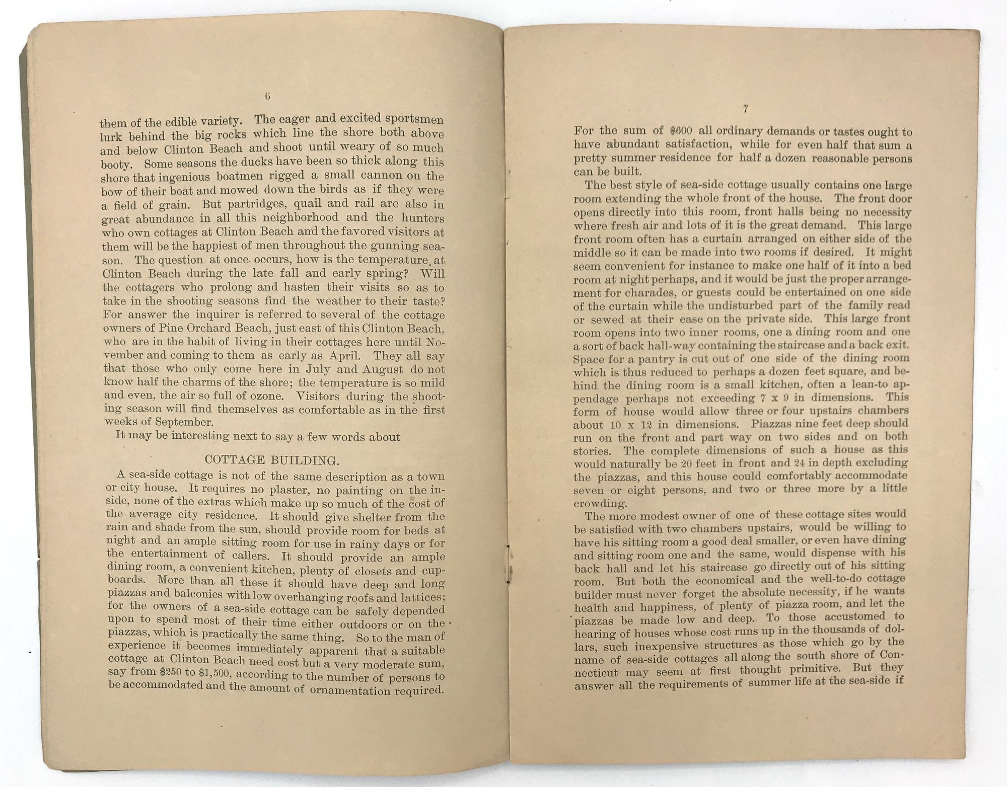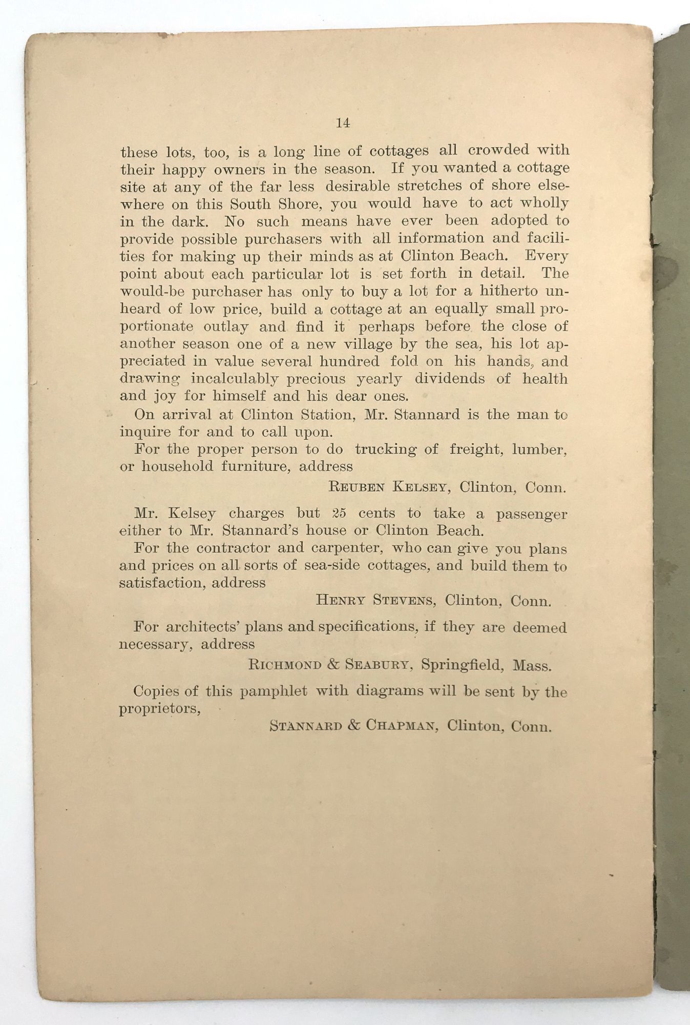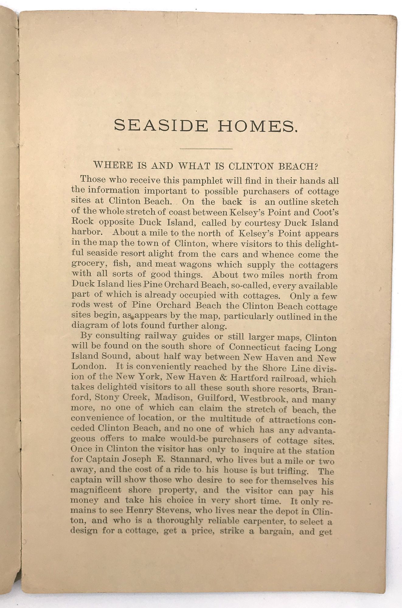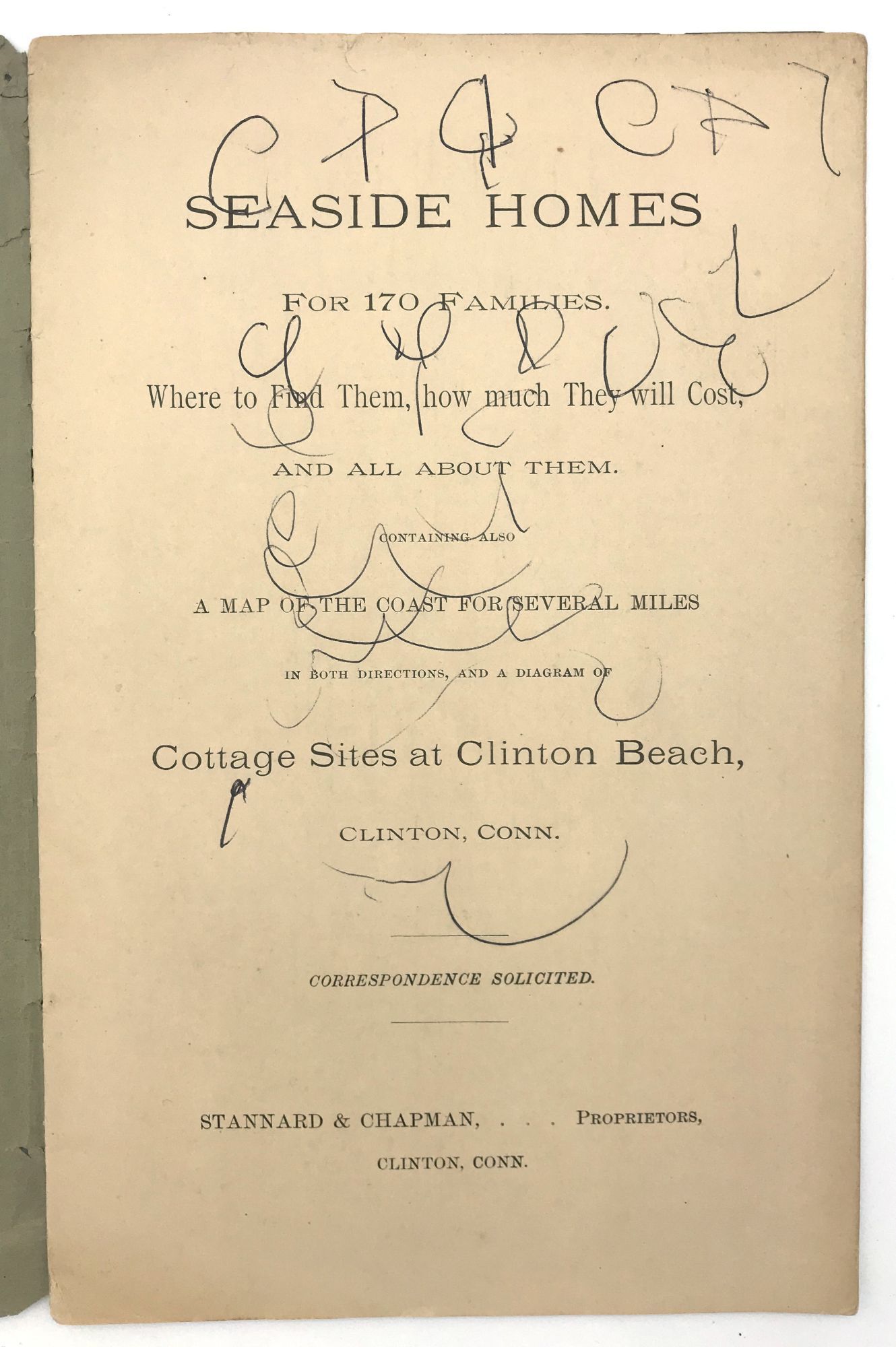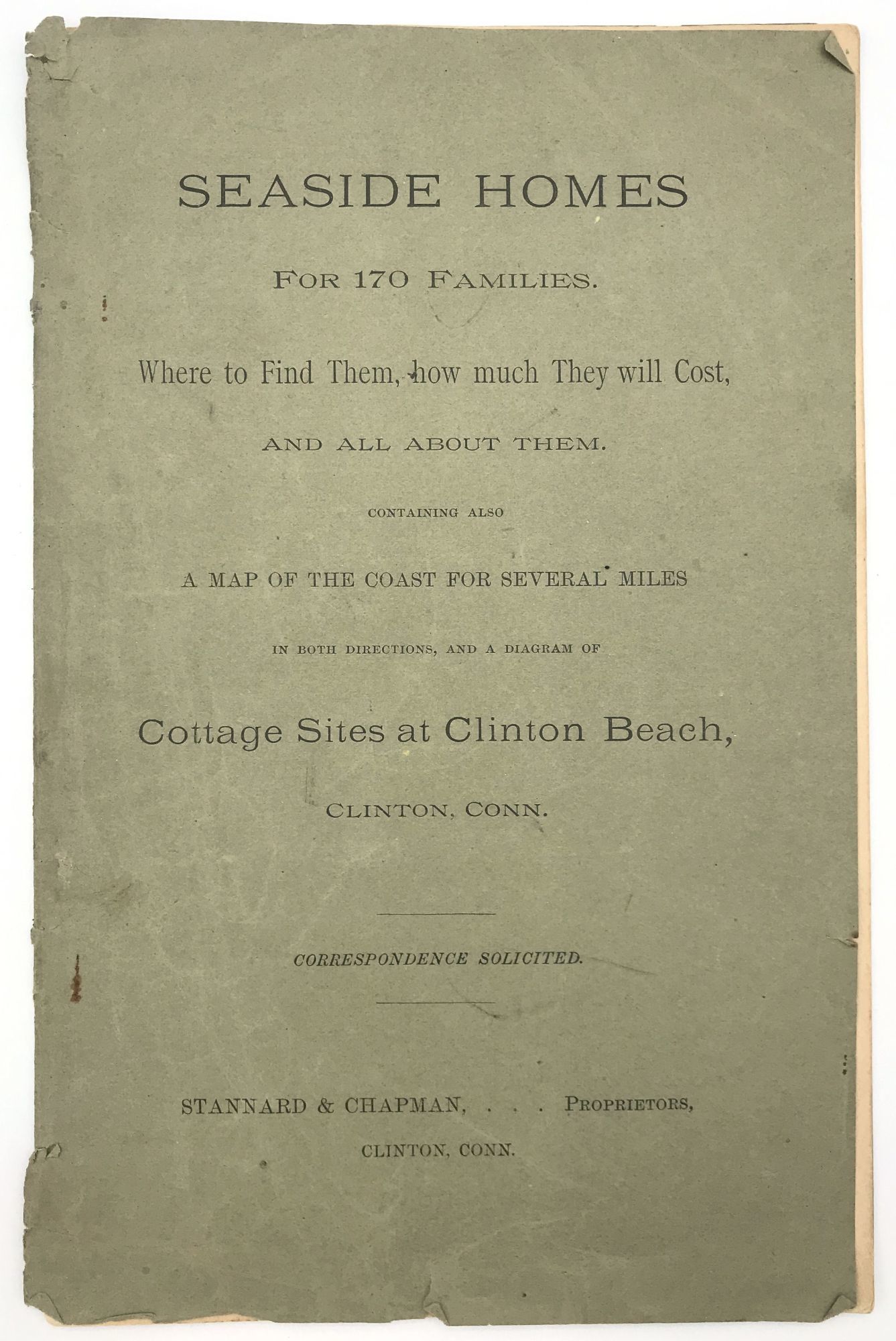 Clinton, Connecticut: Stannard & Chapman, 1900. Good. Wrappers chipped, pen trials to title-page.. A rare booklet advertising seaside homes in Clinton, Connecticut, a shoreline destination on Long Island Sound. Includes a description of opportunities for recreation and relaxation in the area (such as digging for clams, sailing, and picking berries), details about the cottages for sale, a two-page plat of the area by architects Richmond & Seabury, and miscellaneous information about the town and its sleepy seaside community.