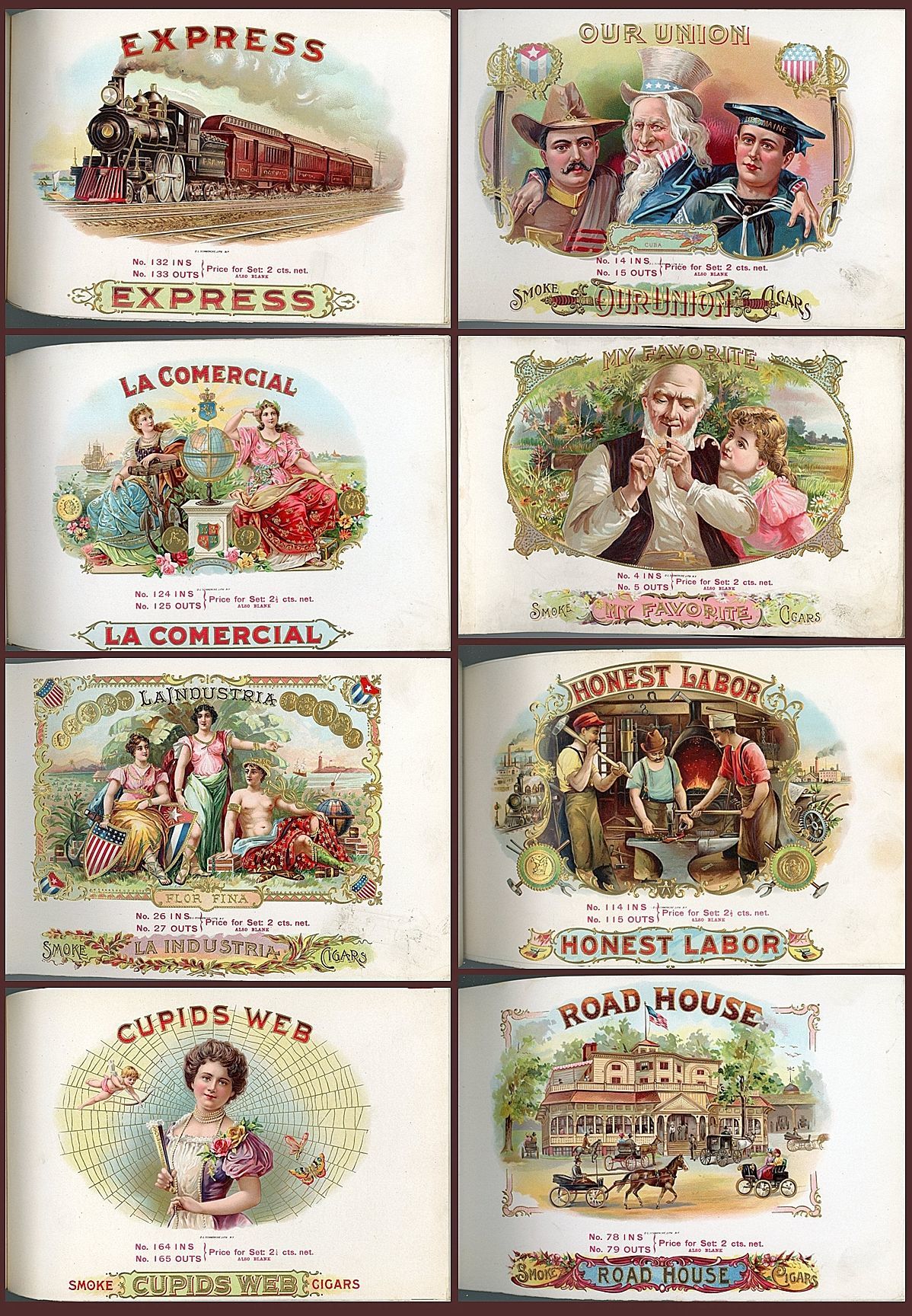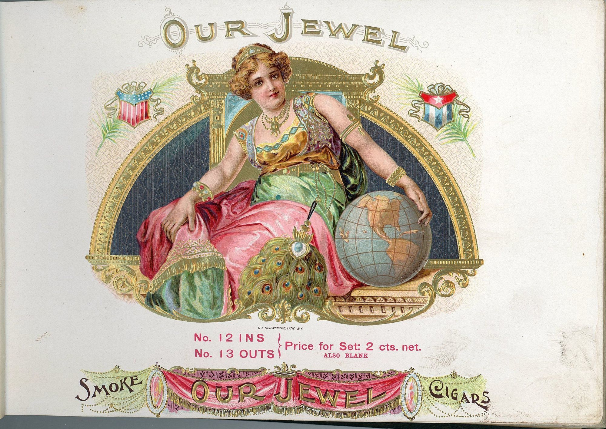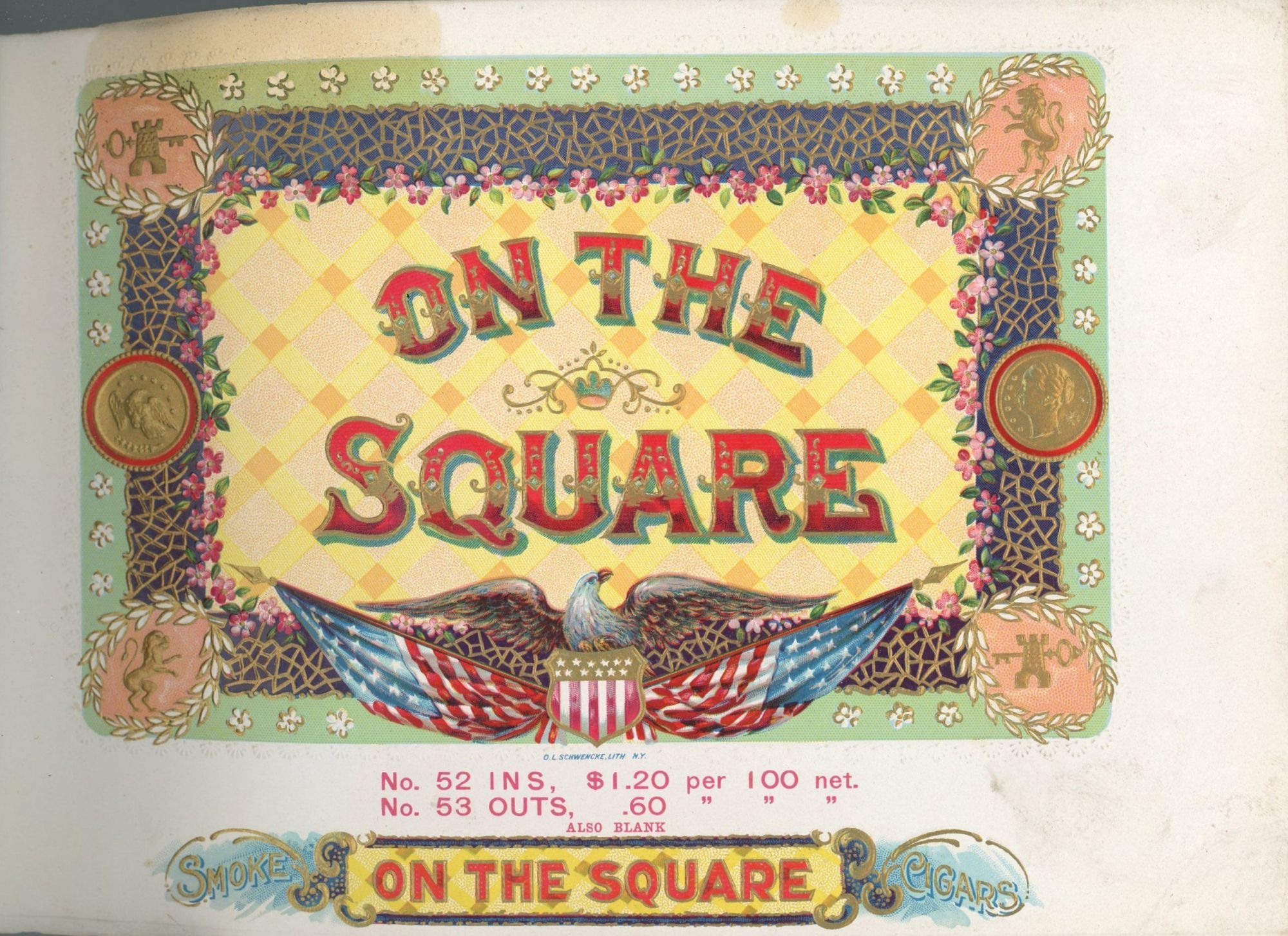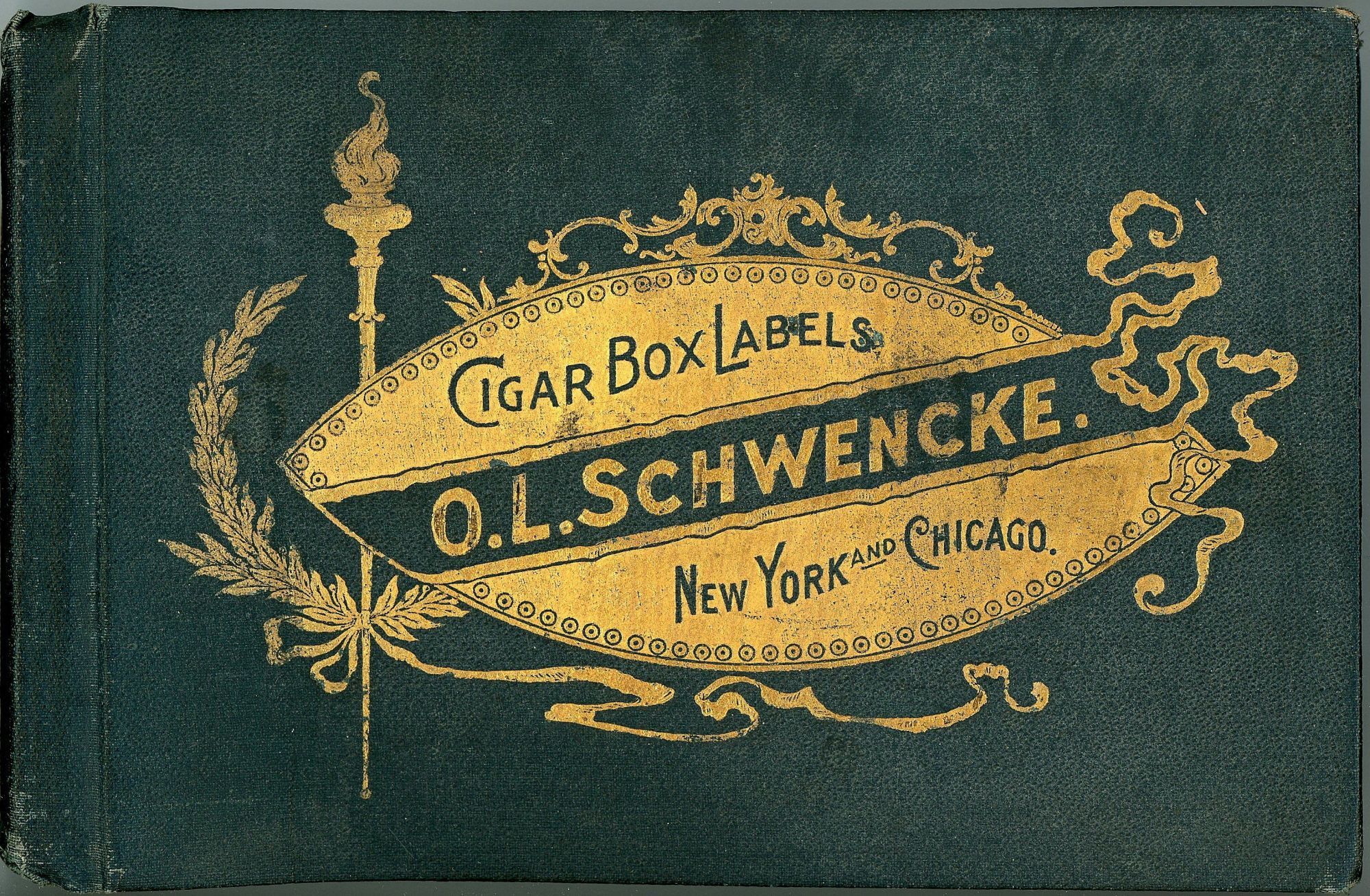 New York & Chicago: O. L. Schwencke, 1907. Cover wear. A 66 pp. salesman sample of deeply embossed gilt embellished cigar labels produced by O. L. Schwencke. Elaborate and intricately designed. Elegant women, royalty, spotted trout, privileged gentlemen, road houses, cigarette in progress (silver ash), scenes from nature, Indigenous peoples , Cuba, Puerto Rica, Transportation and much more. Each with a label number and pricing information. Measures 6.5 by 9.75 inches. Gilt stamped boards. Only Schwenke and Schlegel were the only two independent cigar label printers who stayed independent from the American Lithographing Company. Schwenke was an important producer of elaborate embossed chromolithographed cigar box labels.
