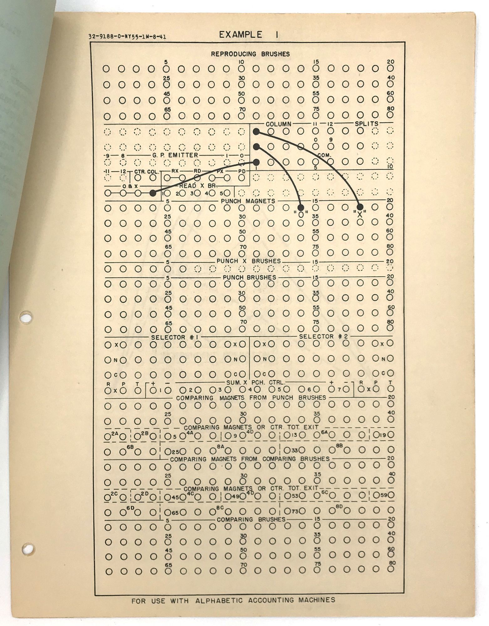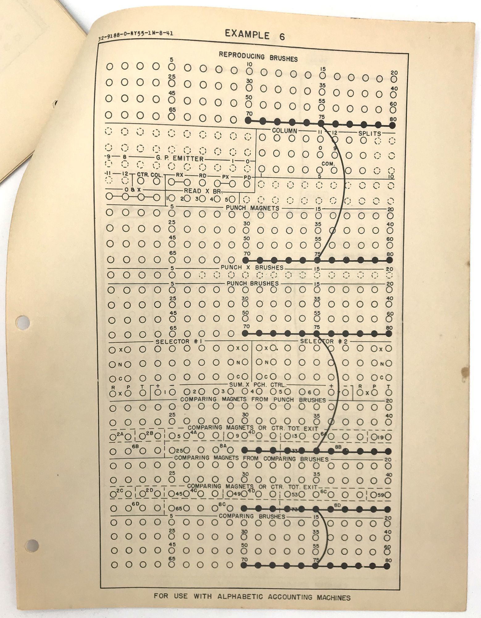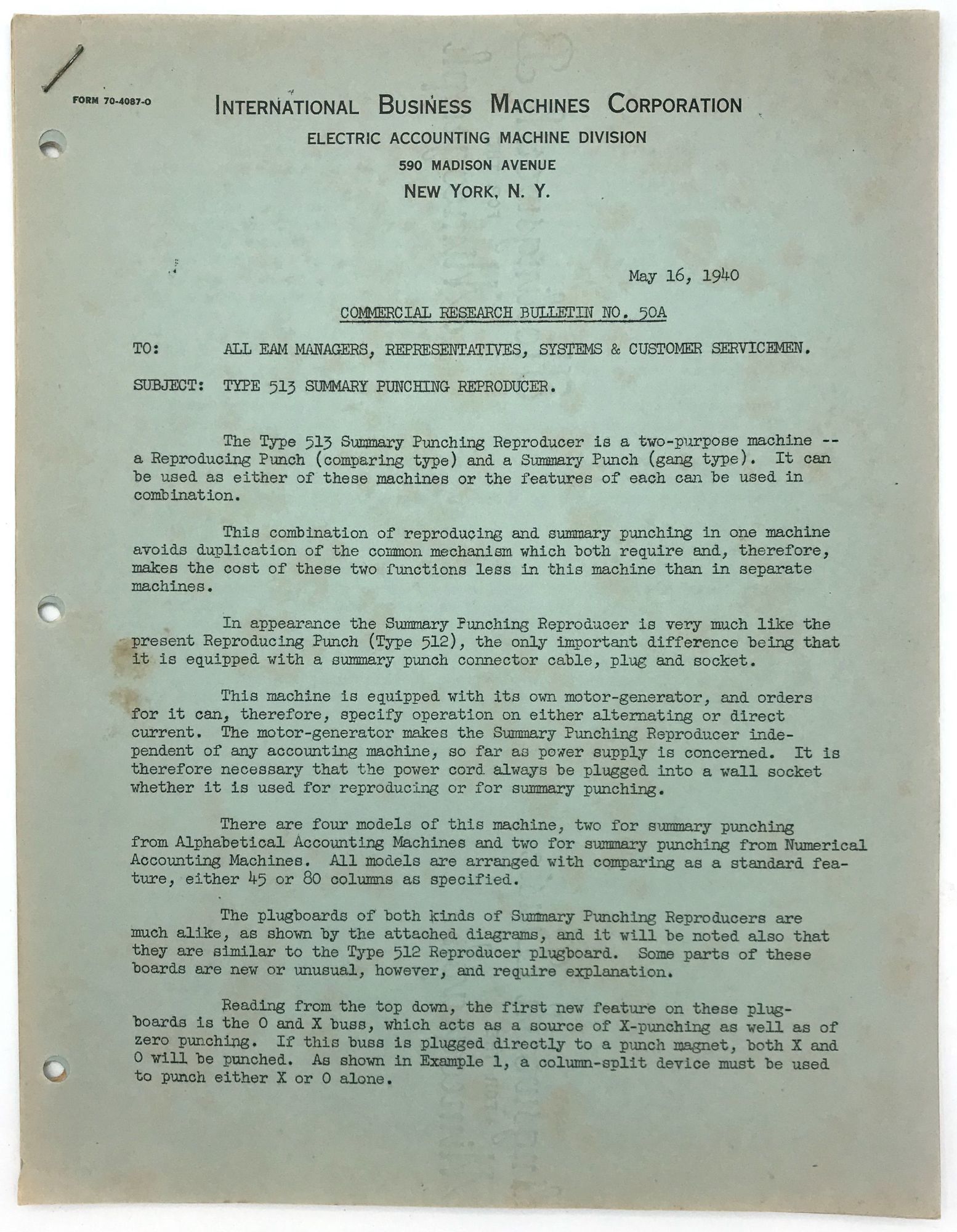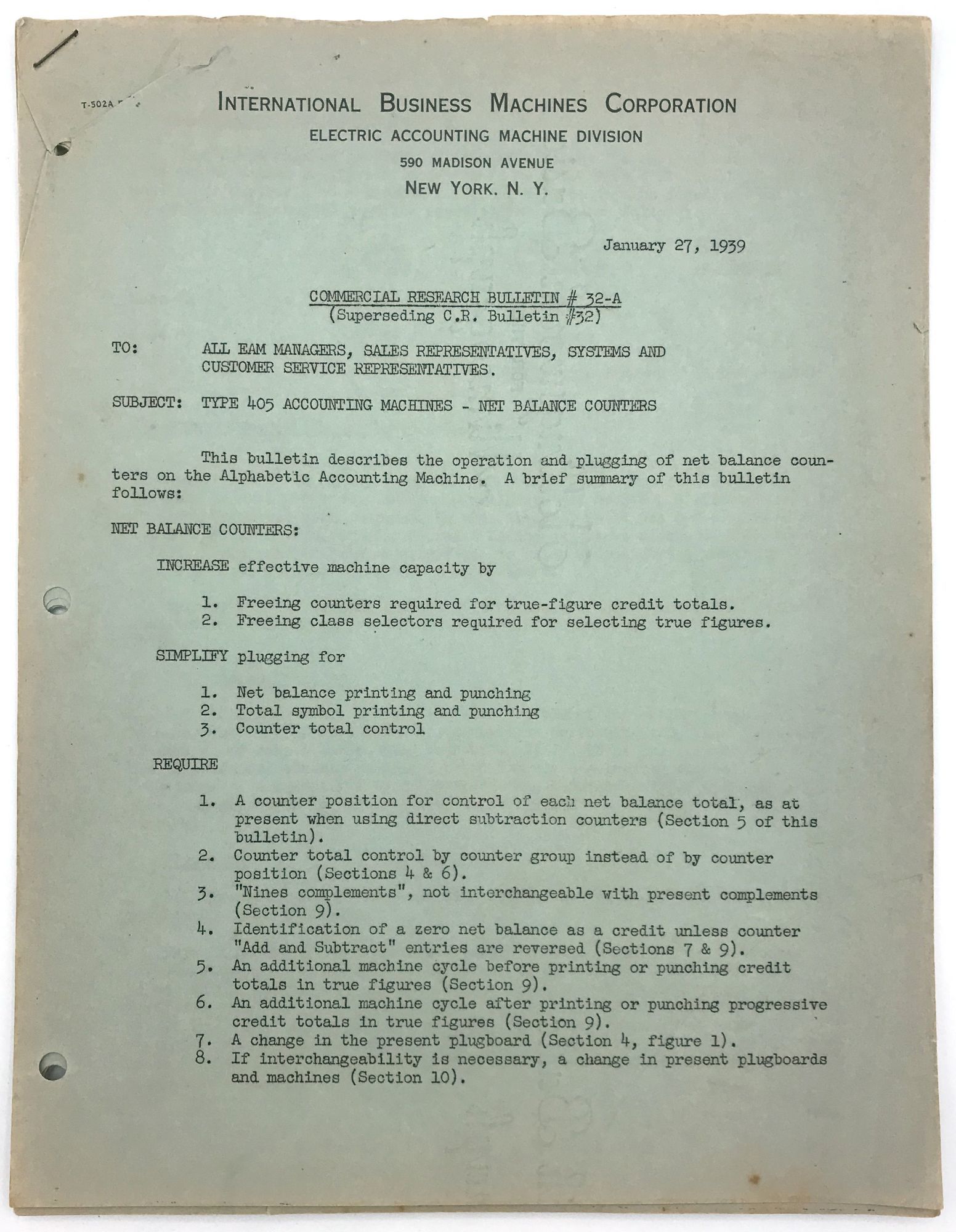New York, New York: International Business Machines Corporation, 1940. Very good to fine. Light sunning to edges.. Two (2) early IBM memoranda, dated 1939 and 1940, on company letterhead specific to the Electric Accounting Machine Division. The first, "Commercial Research Bulletin # 32-A", consists of 9 leaves of typewritten instructions for how to operate the Alphabetic Accounting Machine, with accompanying large folding printed diagram. The second, "Commercial Research Bulletin No. 50A", consists of 5 leaves of typewritten instructions for operating the Type 313 Summary Punching Reproducer, followed by 7 leaves of printed diagrams.