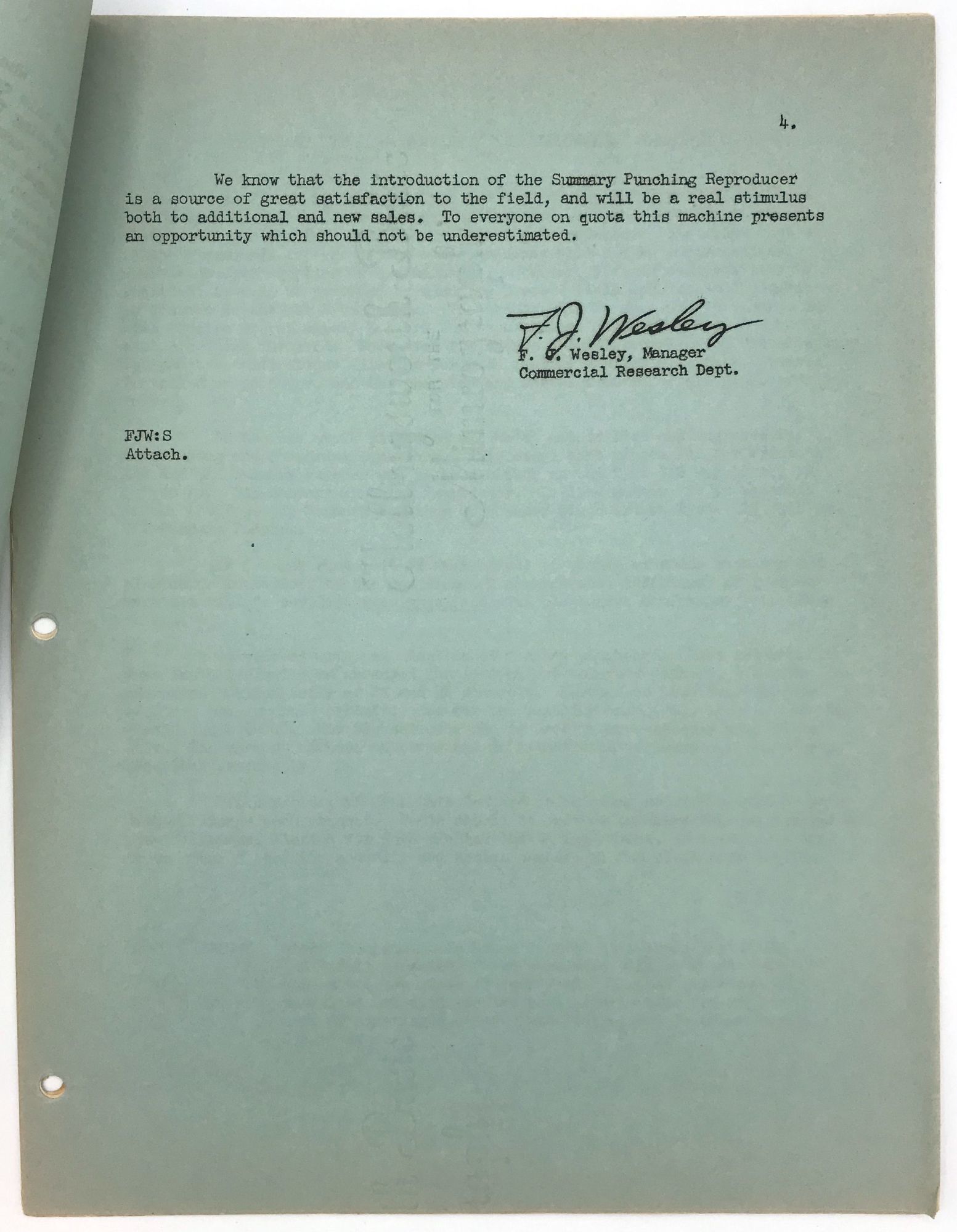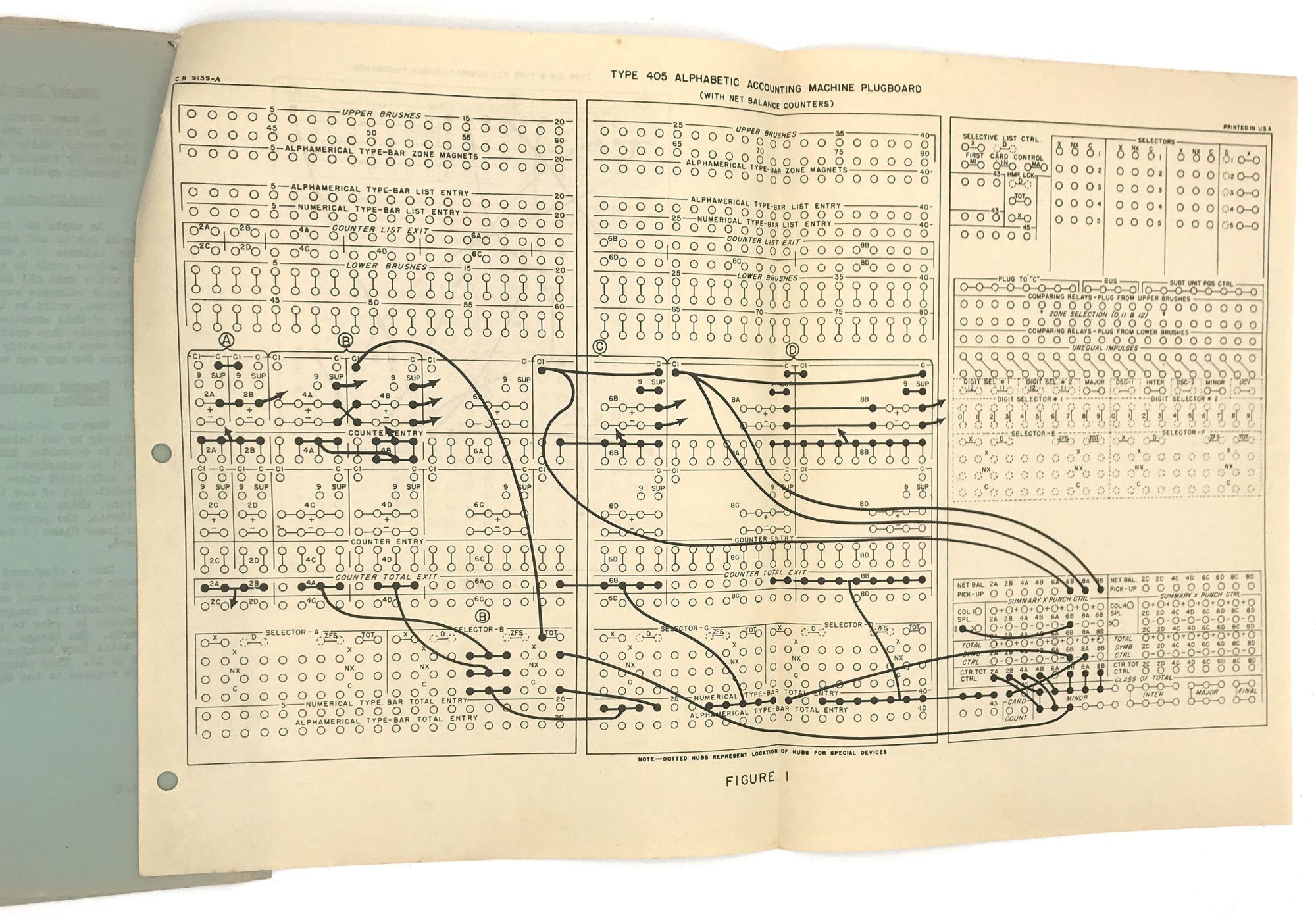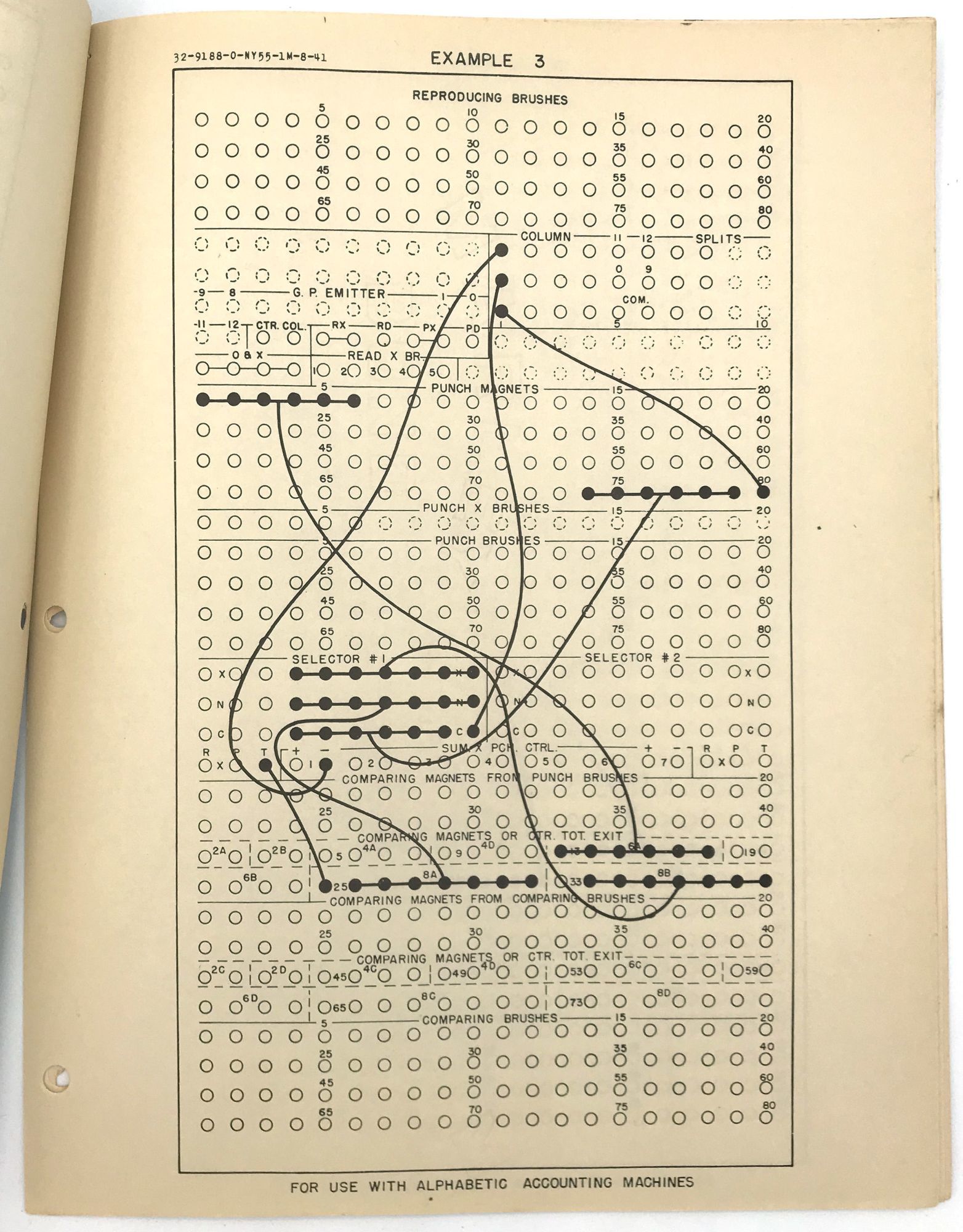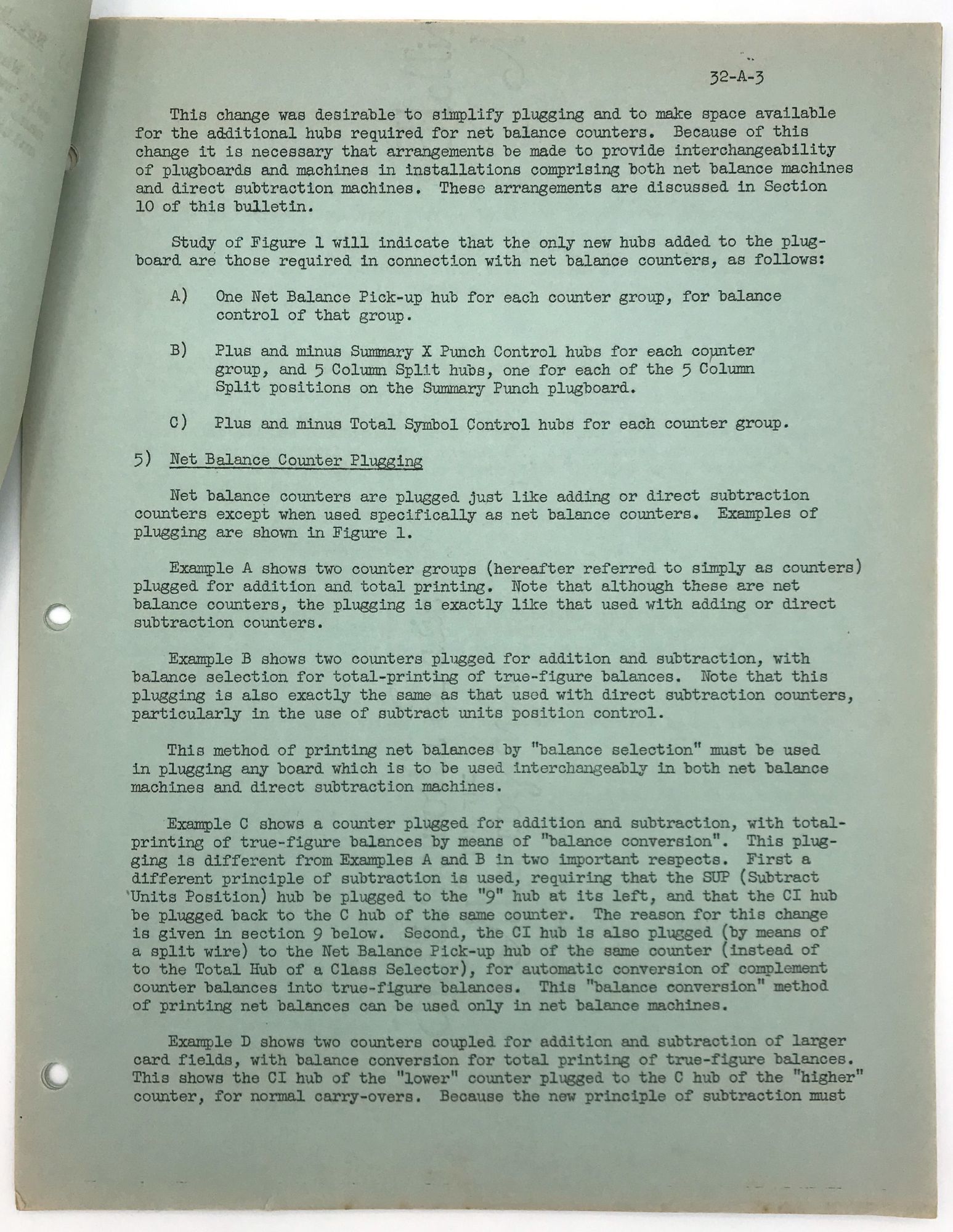 New York, New York: International Business Machines Corporation, 1940. Very good to fine. Light sunning to edges.. Two (2) early IBM memoranda, dated 1939 and 1940, on company letterhead specific to the Electric Accounting Machine Division. The first, "Commercial Research Bulletin # 32-A", consists of 9 leaves of typewritten instructions for how to operate the Alphabetic Accounting Machine, with accompanying large folding printed diagram. The second, "Commercial Research Bulletin No. 50A", consists of 5 leaves of typewritten instructions for operating the Type 313 Summary Punching Reproducer, followed by 7 leaves of printed diagrams.