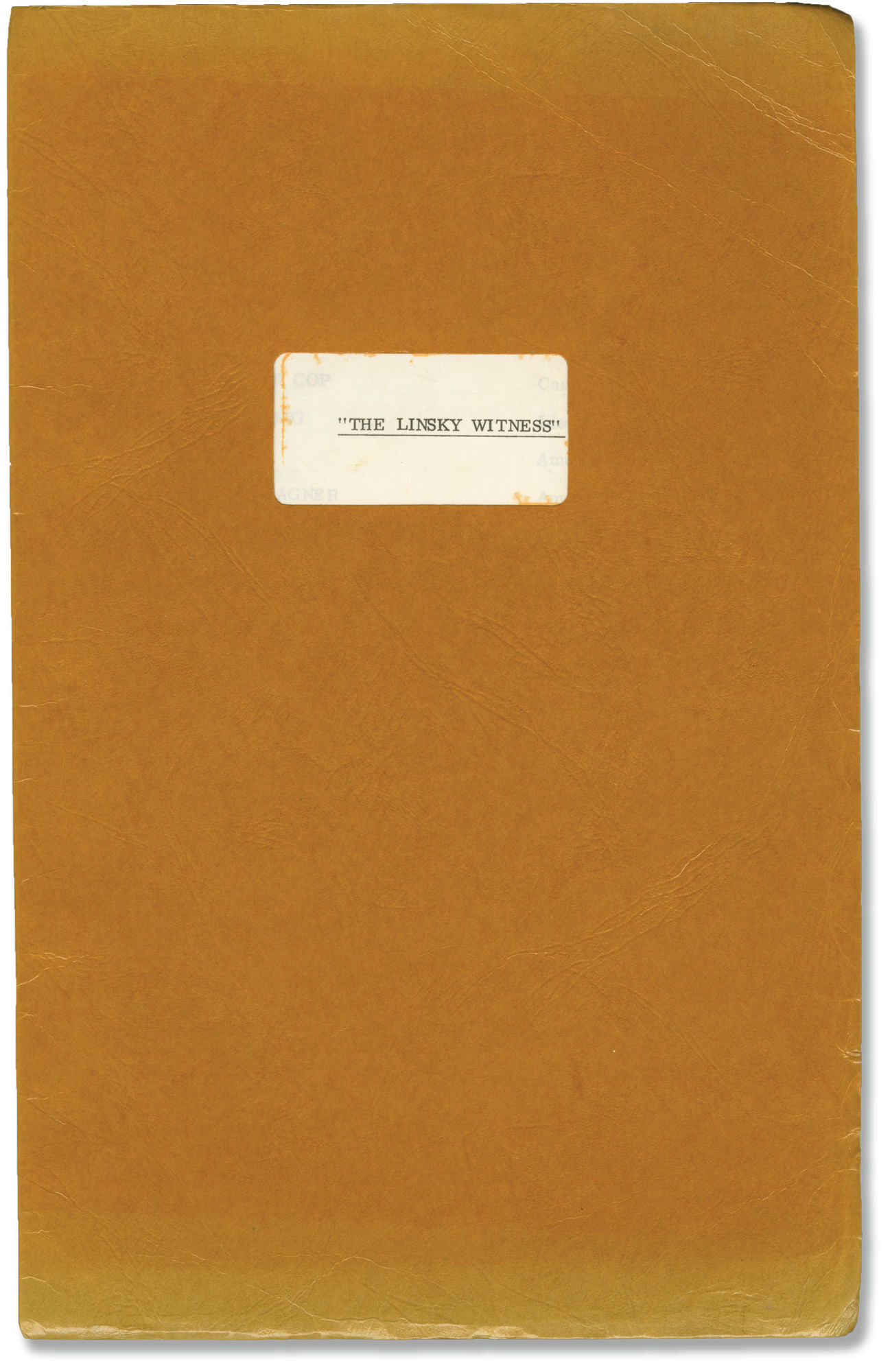 Tall burnt orange untitled wrappers with a die-cut title window in the British style. Title page present, with credits for screenwriters James Foster and John Davis. 130 leaves, with last page of text numbered 127. Mimeograph duplication, rectos only. Pages Very Good, with dampstaining to the title page and final leaves, wrapper Very Good plus, with some fading and rusting near the binding, bound internally with two silver brads.
